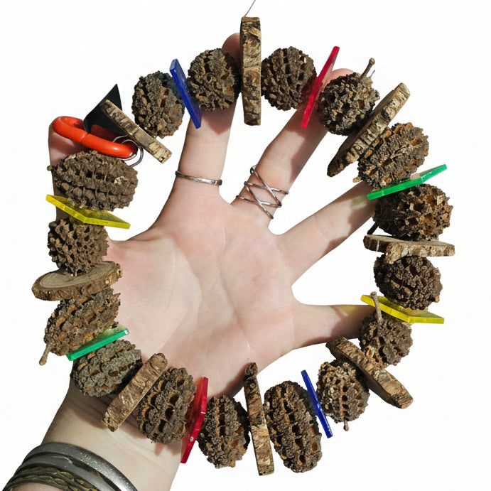 This wreath will delight any birdie with its 16 casuarina nuts, 8 iron bark slither discs, then colours up with 8 see-through acrylic squares sandwiched between all that chewy fun. Not only good for birdie but cool to look at haha 😁 The overall measurement from hanger clip is approximately 18cm long with an approximate diameter of 15cm. 🦜🐦 Suits very small, small, medium and large birdies.