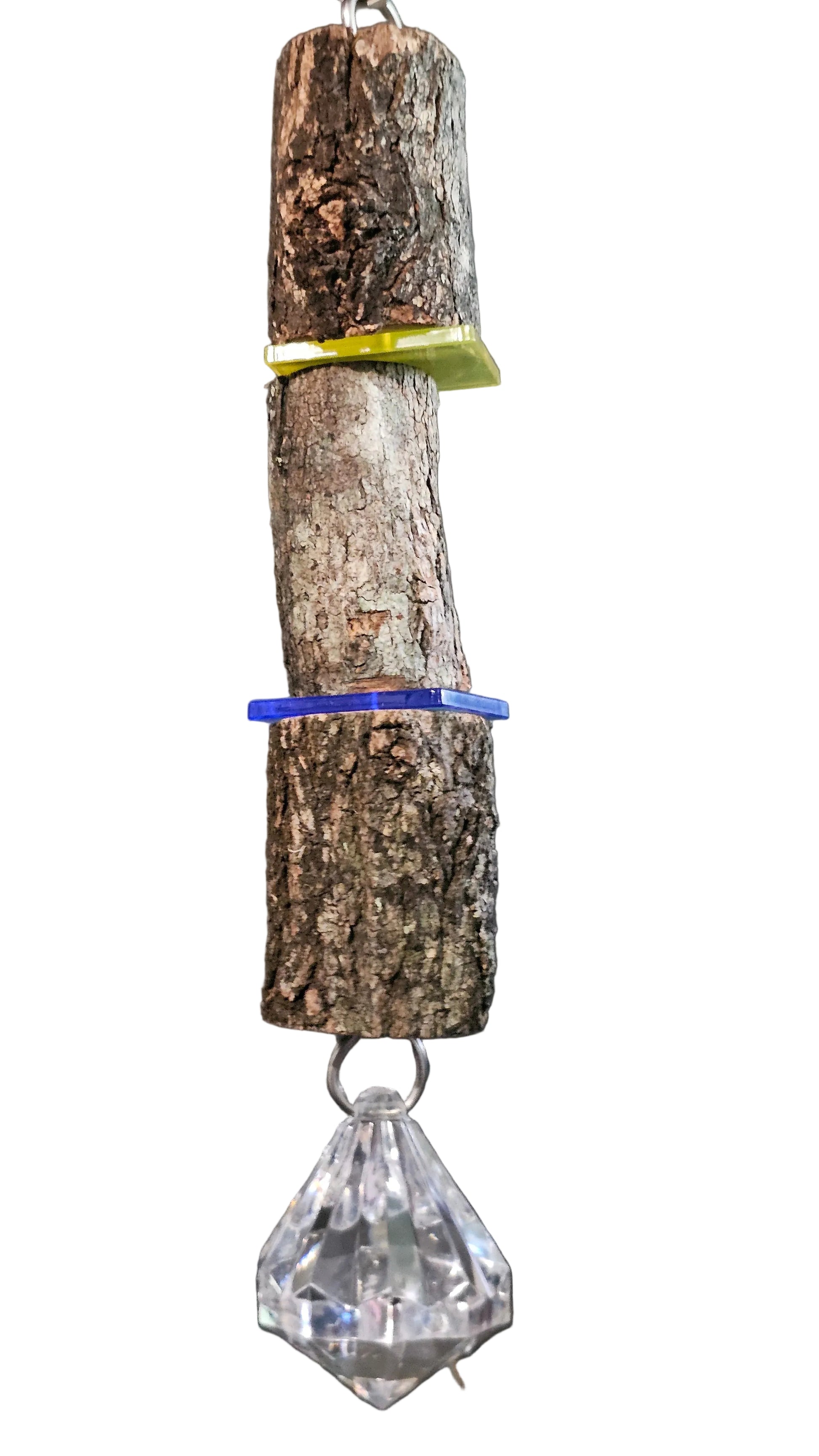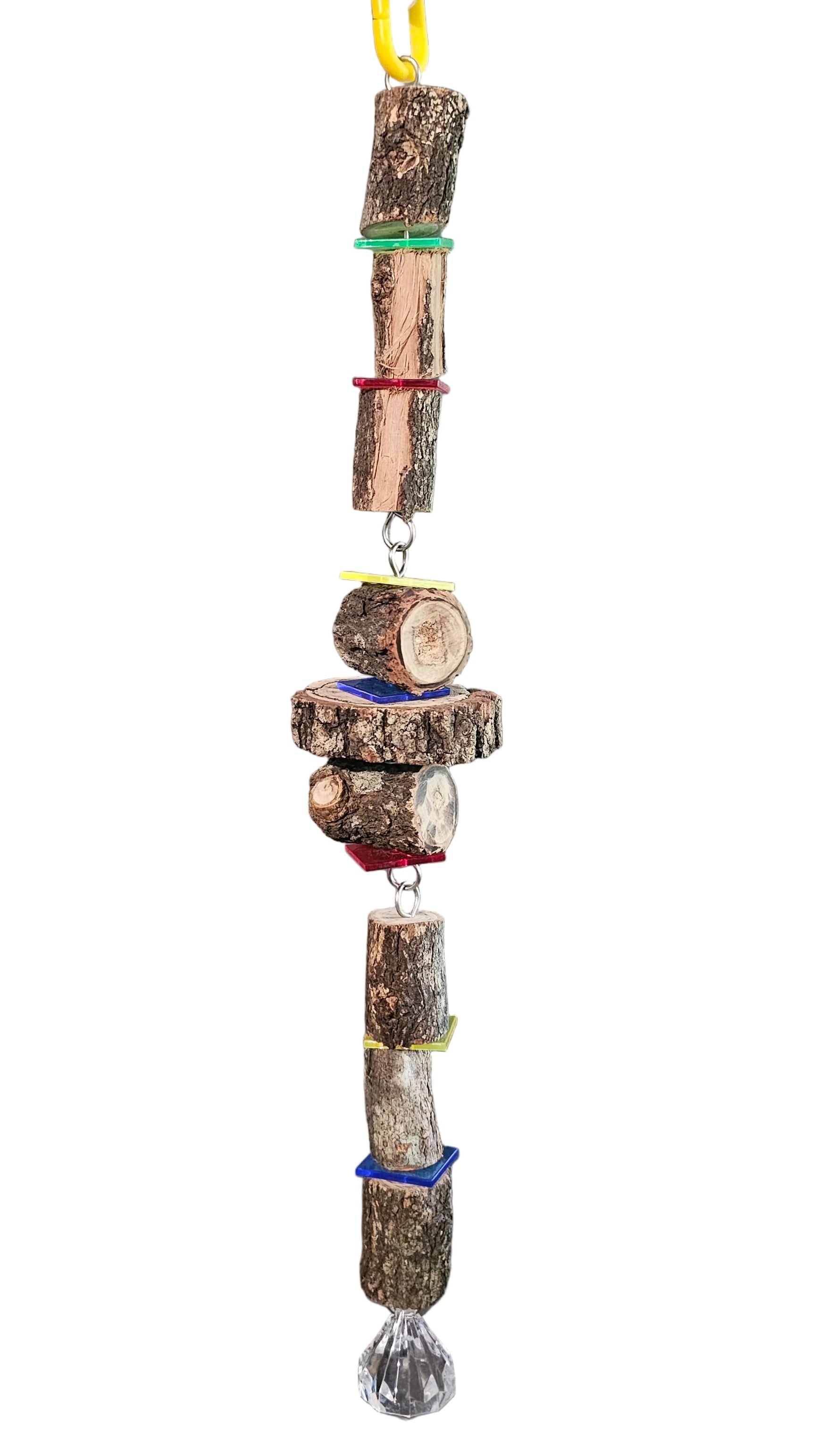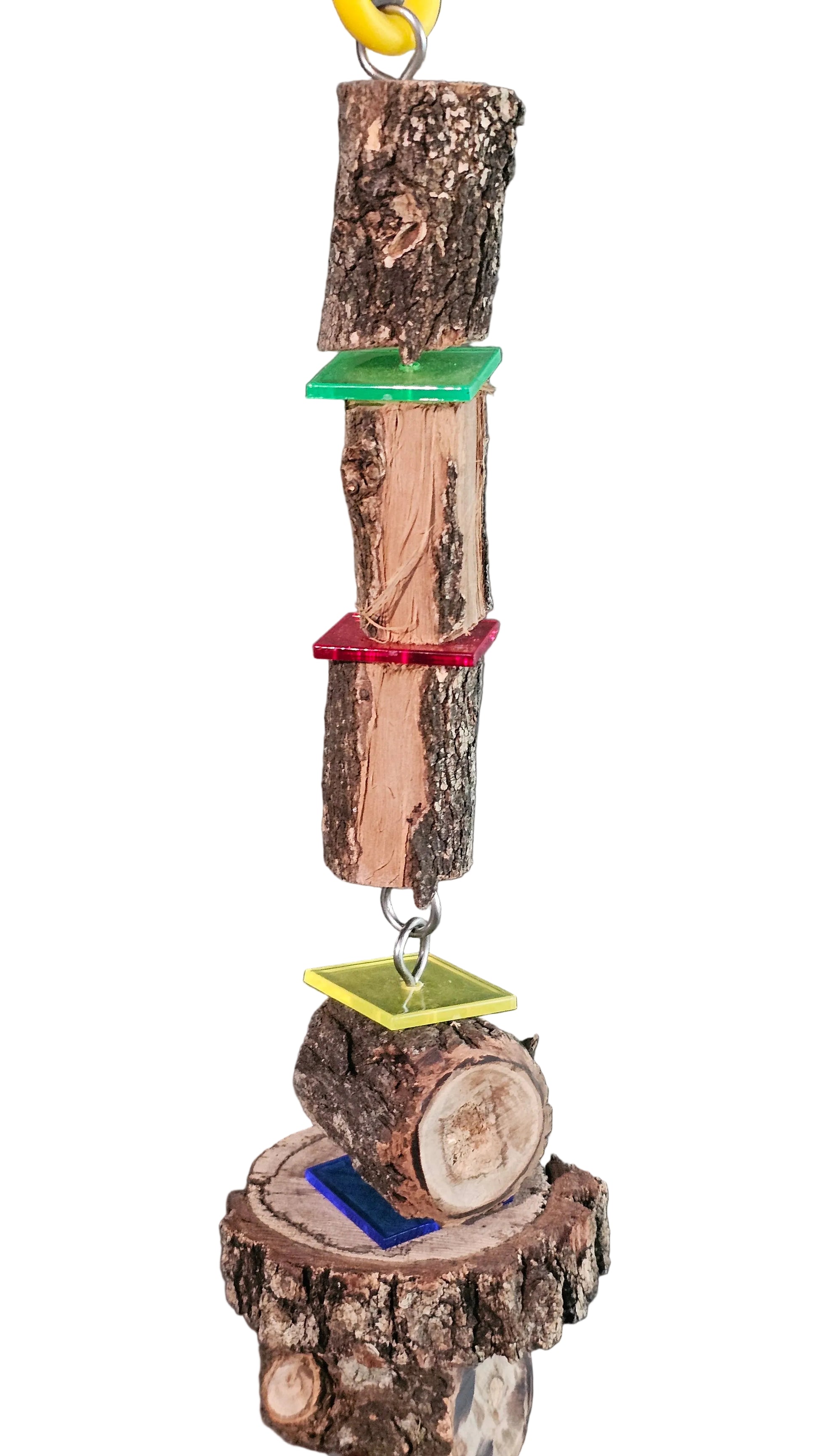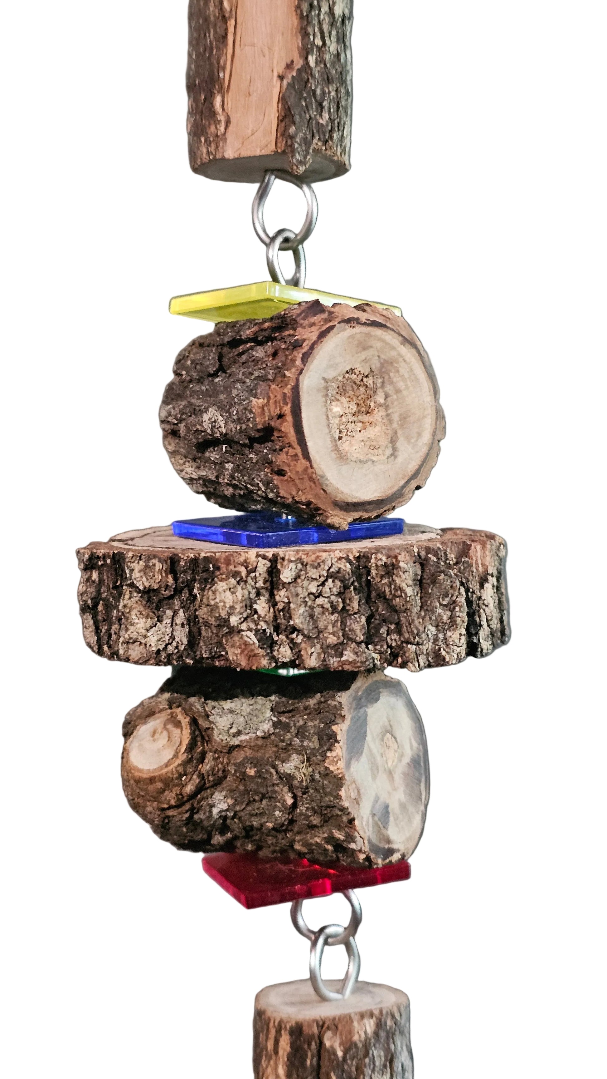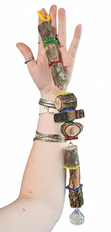 How much wood can your birdie chew 🤣 This has 9 pieces of iron bark cut from our property, 8 shiny see-through acrylic colourful squares and a acrylic crystal end. Threaded on stainless steel wire with not one but two joins that make it flexable fun. Whats not to like 😁 The overall measurement from hanger clip to the acrylic crystal base approximately 45cm long. 🦜🐦 Suits very small, small, medium and large birdies.