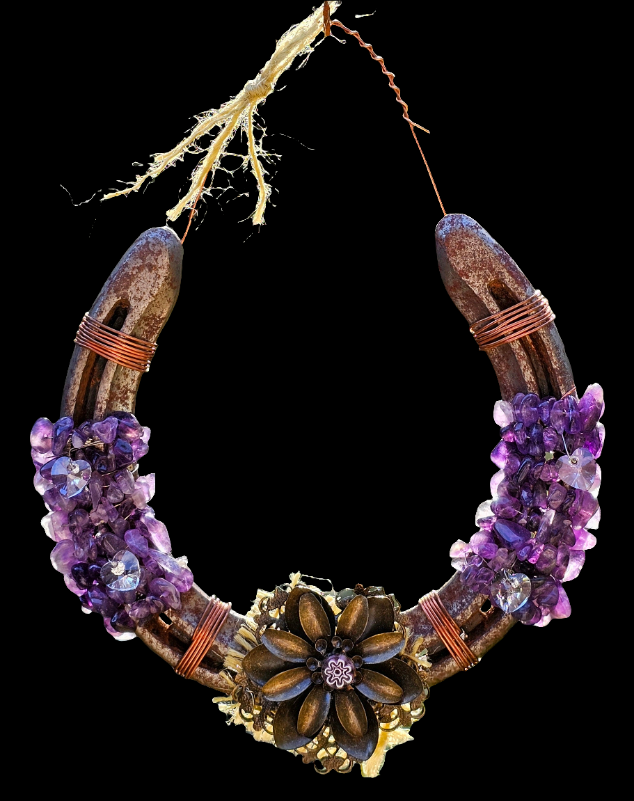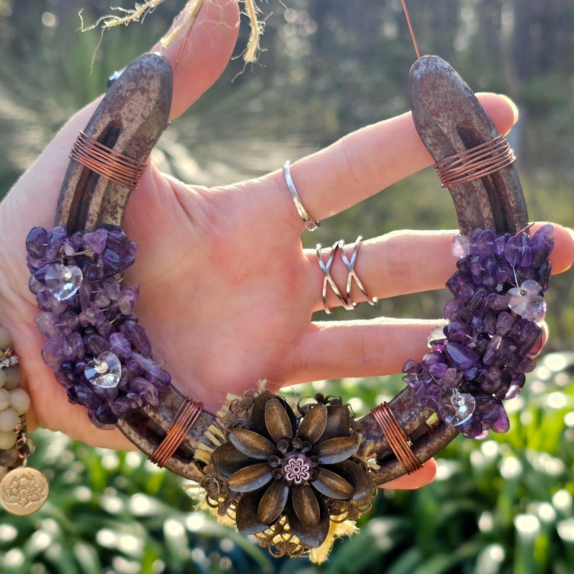 Infused with beauty, balance, and a touch of enchantment, Amethyst Heartspell is a one-of-a-kind horseshoe wall hanging that blends earthy texture with sparkling detail ✨️