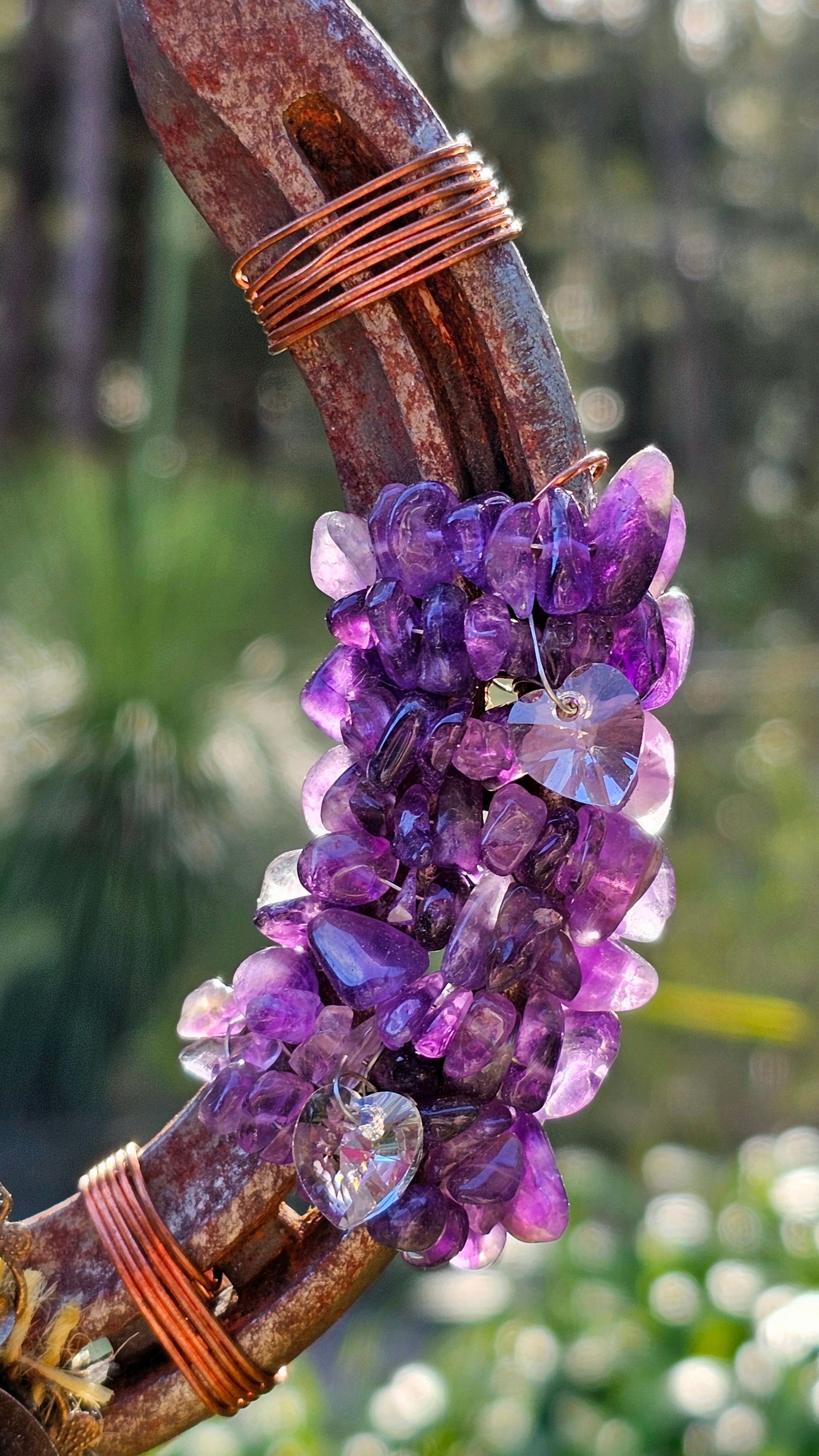 This genuine iron horseshoe retains a hint of natural rust, giving it rustic beauty authenticity and character. Wrapped gracefully along both sides are genuine amethyst gemstone chips, known for their calming and protective properties. Nestled above the amethyst are four shimmering Swarovski crystal hearts, catching the light and adding a sense of delicate magic 💜