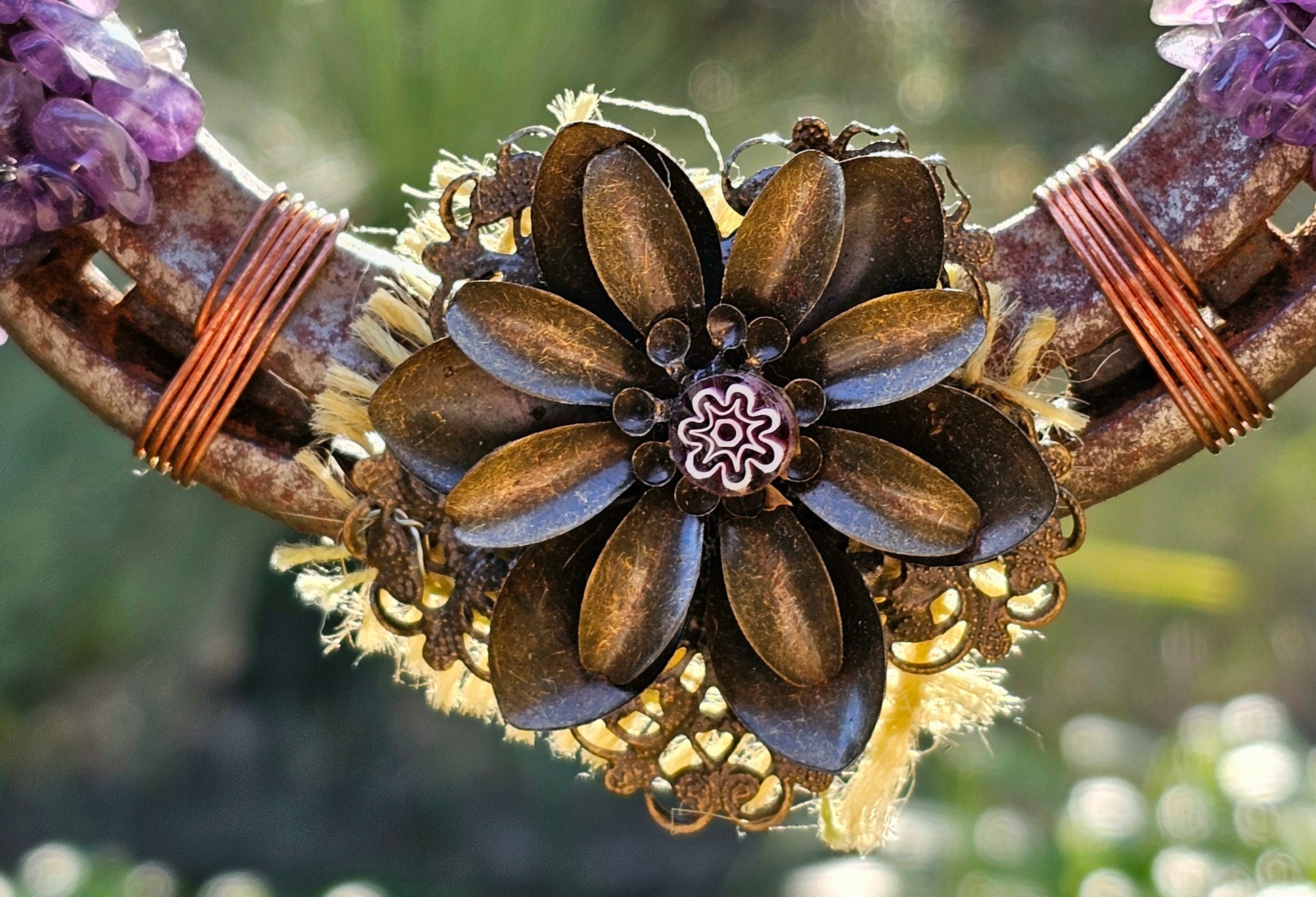 ✨️ Mixed media: hand-wrapped amethyst gemstone chips, 4 Swarovski crystal hearts, copper wire, vintage bronze metal flower, gold hessian and millefiori glass bead.
