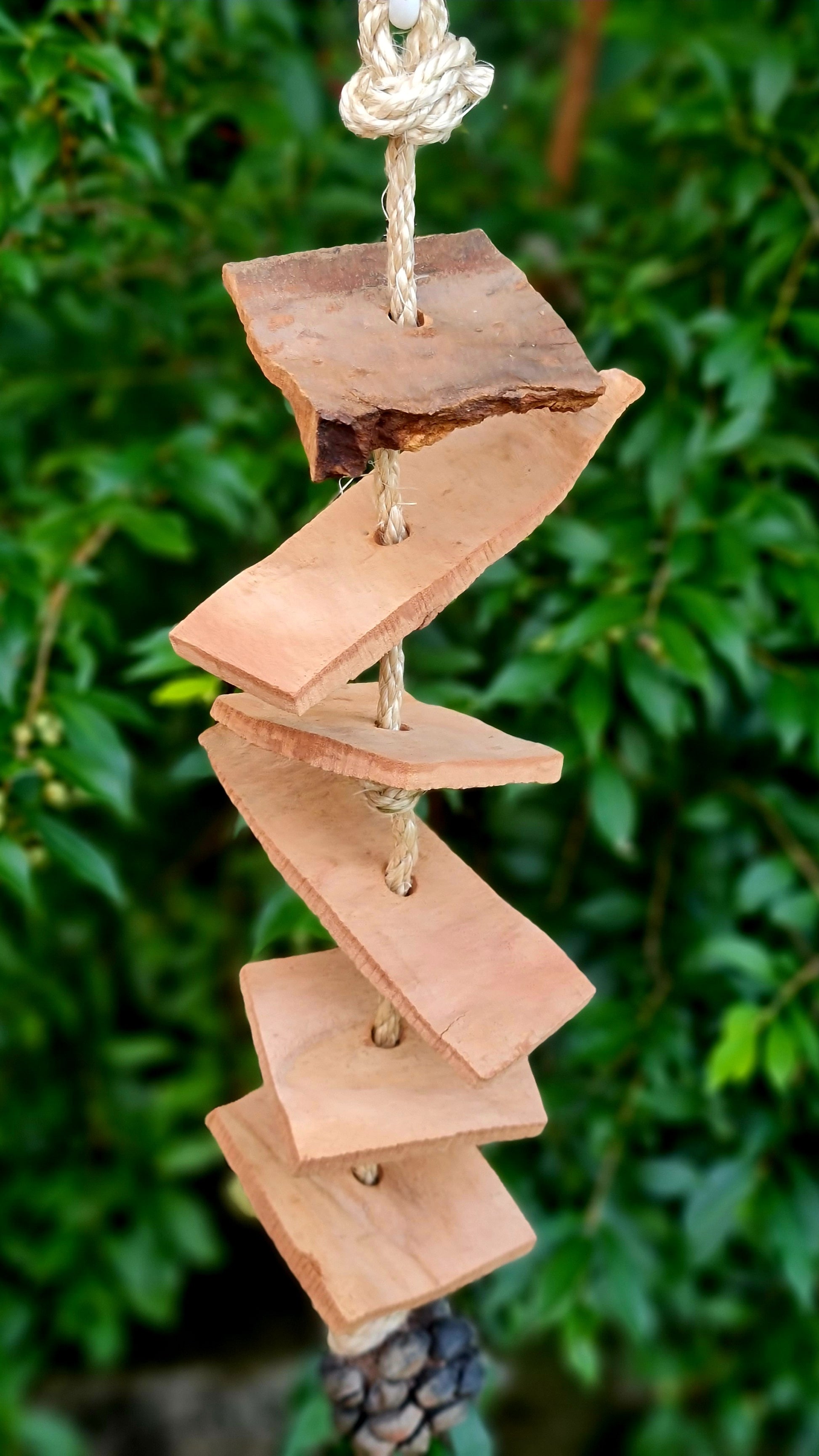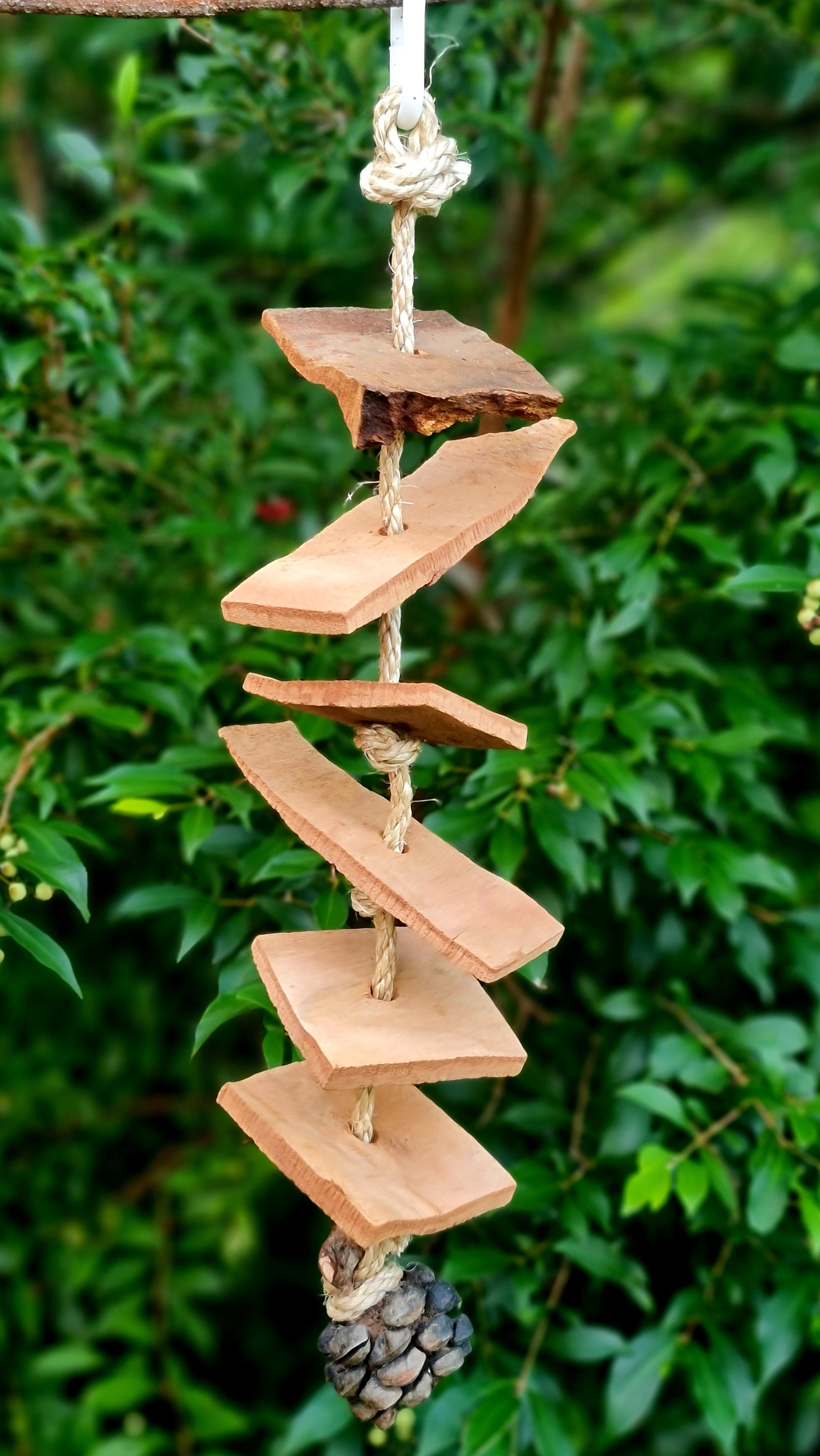 This fun barky bits and banksia forest shreddable sisal rope toy has been created using chunky bark pieces from our spotted trees and a half banksia pod to finish it off, all threaded onto sisal rope for fun moveability. Hand made using bark, banksia, sisal rope and a plastic clip as the hanger. The overall measurement from hanger clip to the rope base is approximately 45cm long. 🦜🐦 Suits small, medium, large and very large birdies 🤩 Please note that your timber toy may start splitting/cracking/shrinking in areas as it continues to dry out since it has been freshly harvested from our forest, however this should not affect your birdies play time and fun with this toy 😁