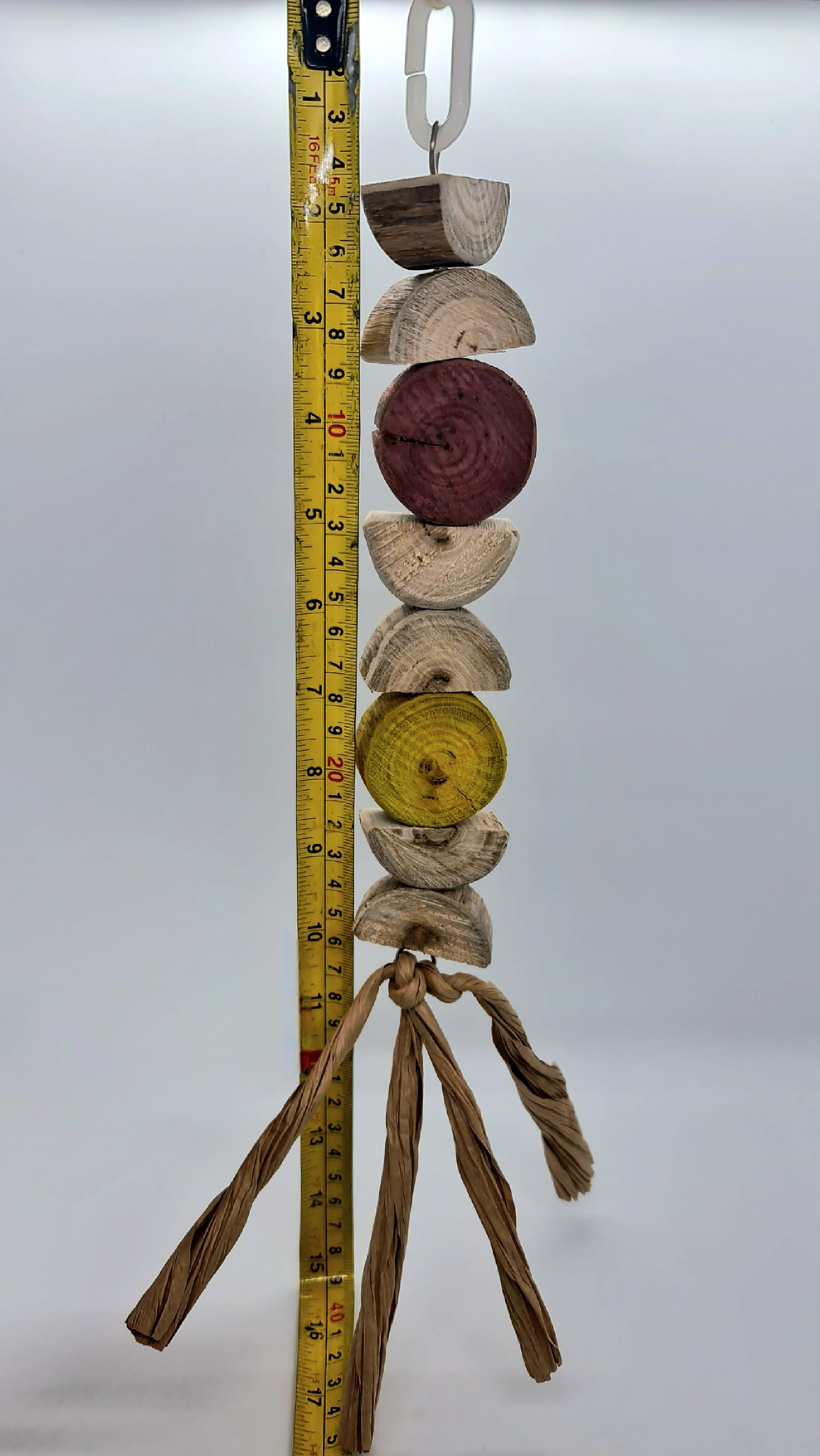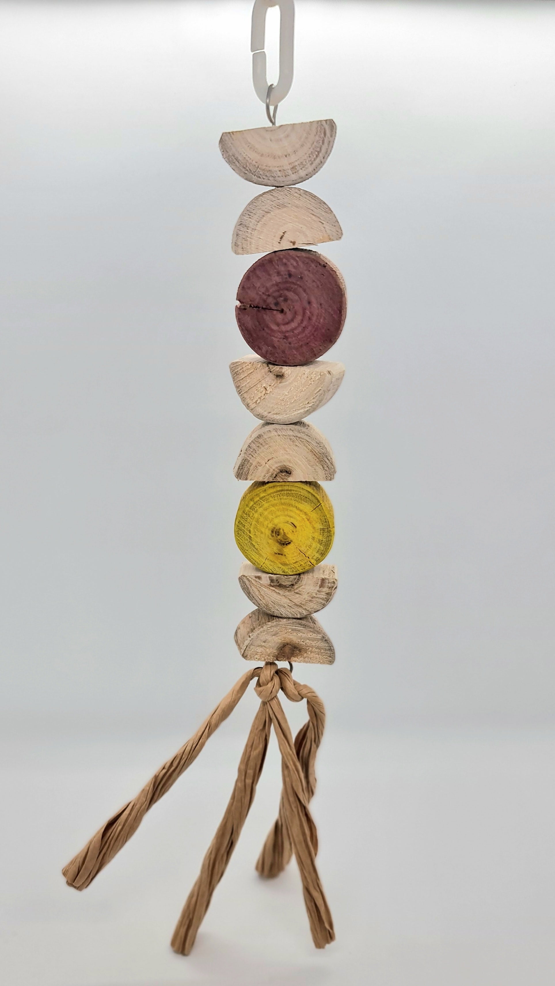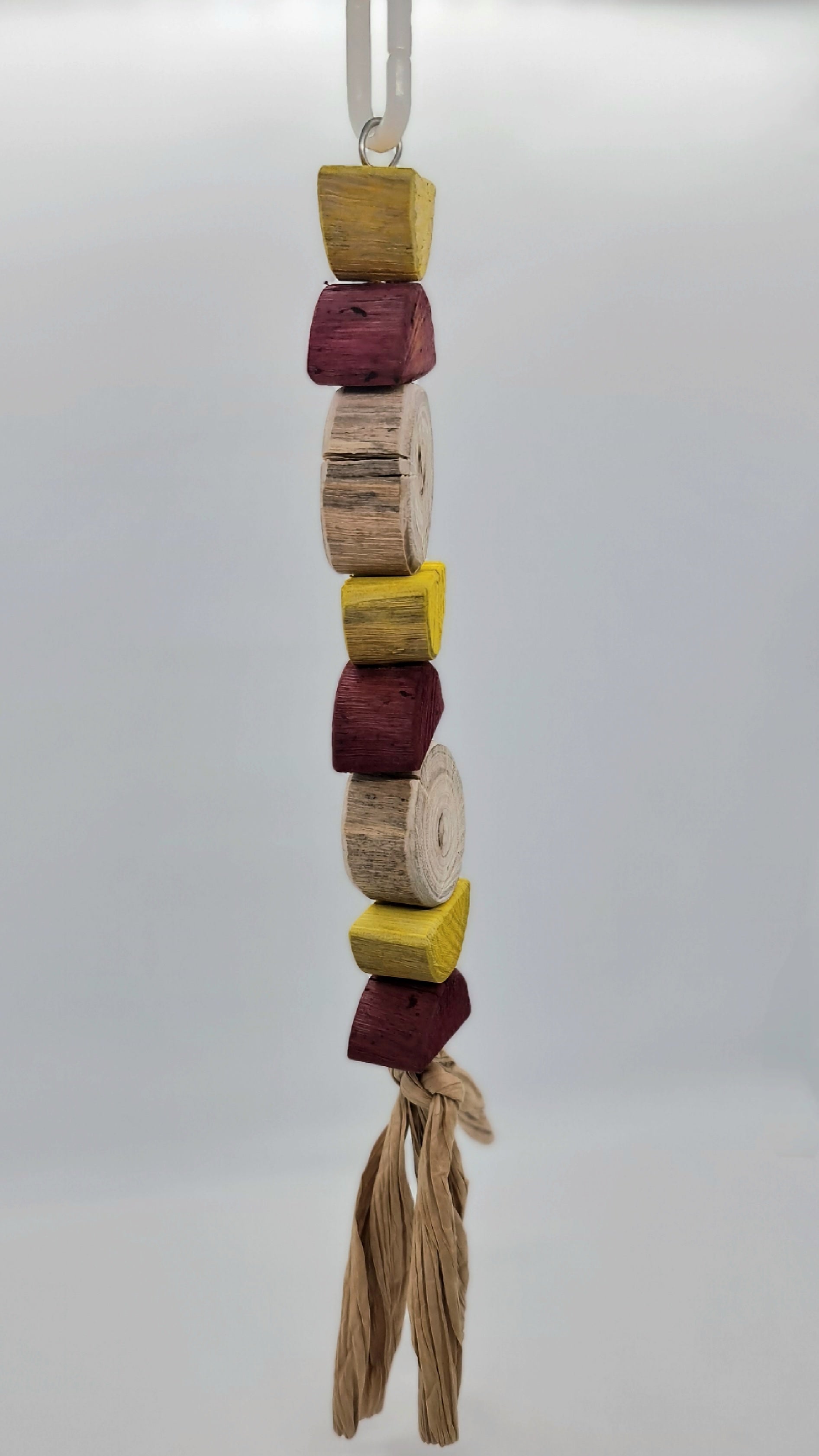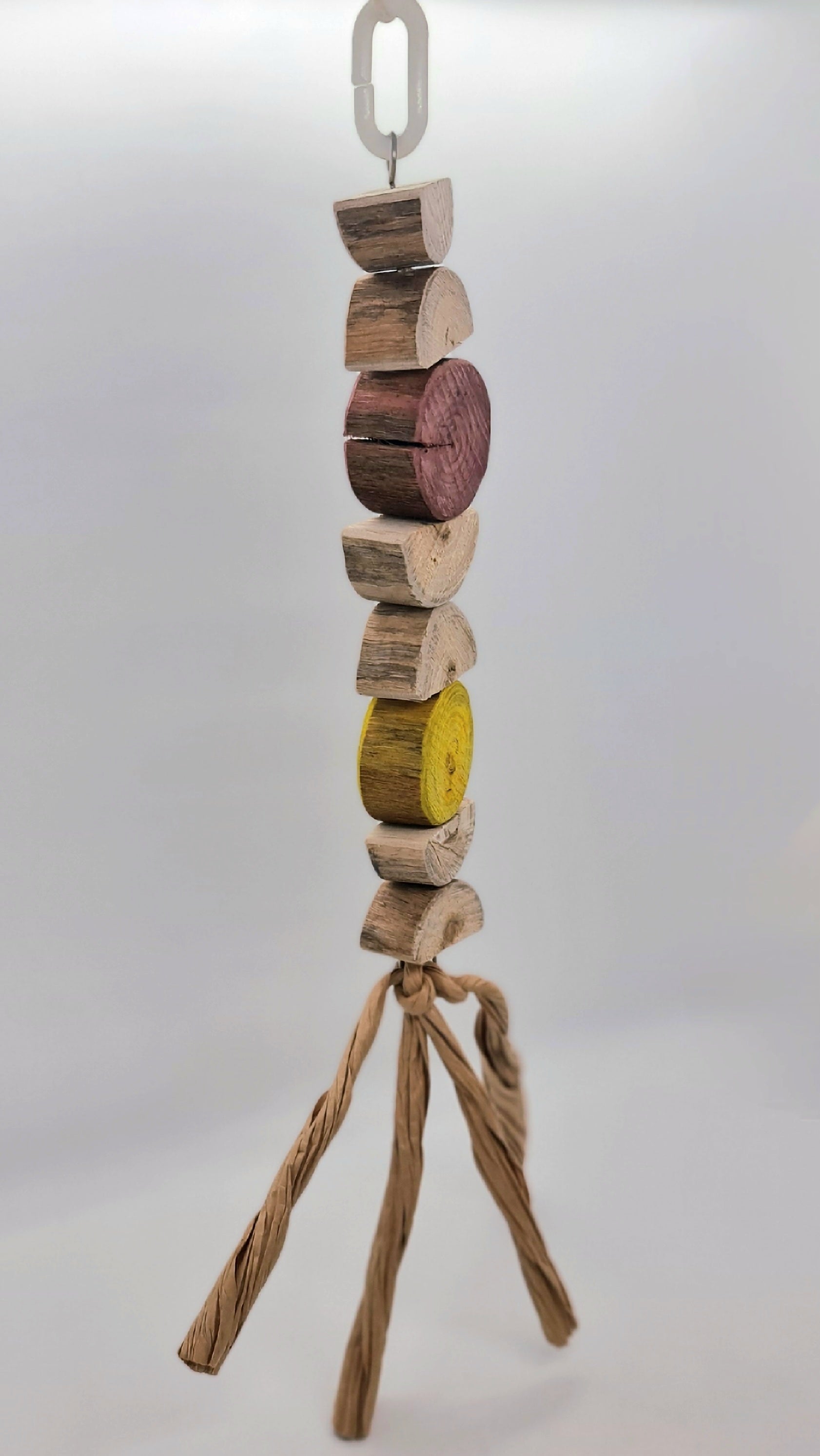 Made using stainless steel wire, wood(spotted gum), paper and a plastic hanger clip (option 2 turmeric and beetroot dyed wood)Suitable for small, medium, large and very large birds. 🦜🐦 Please note that your timber toy may start splitting/cracking/shrinking in areas as it continues to dry out since it has been freshly harvested from our forest, however this should not affect your birdies play time and fun with this toy 😁