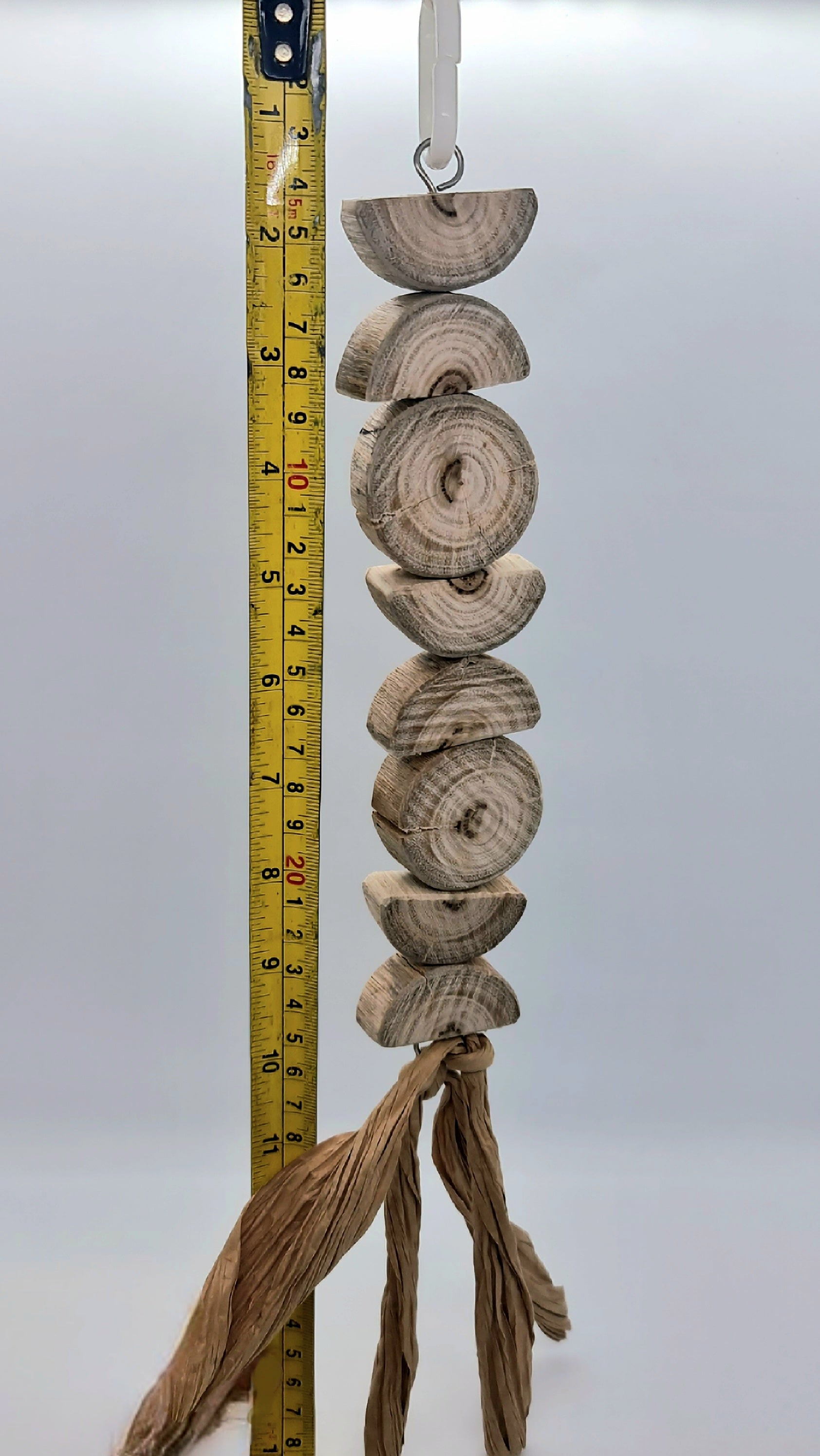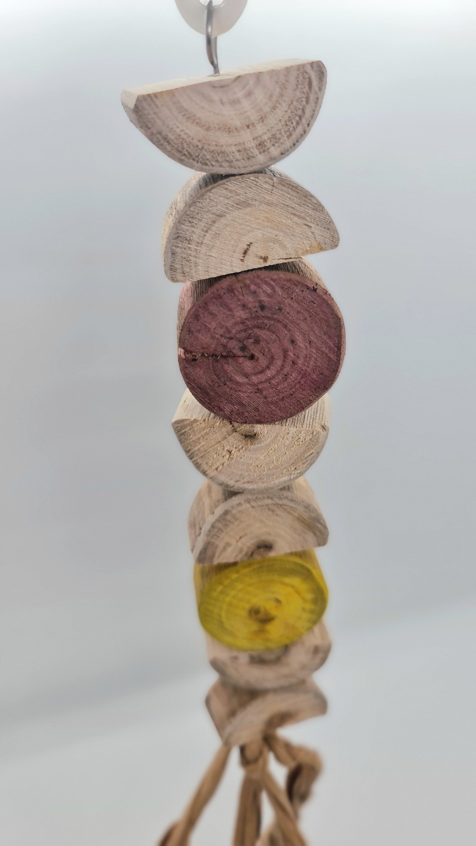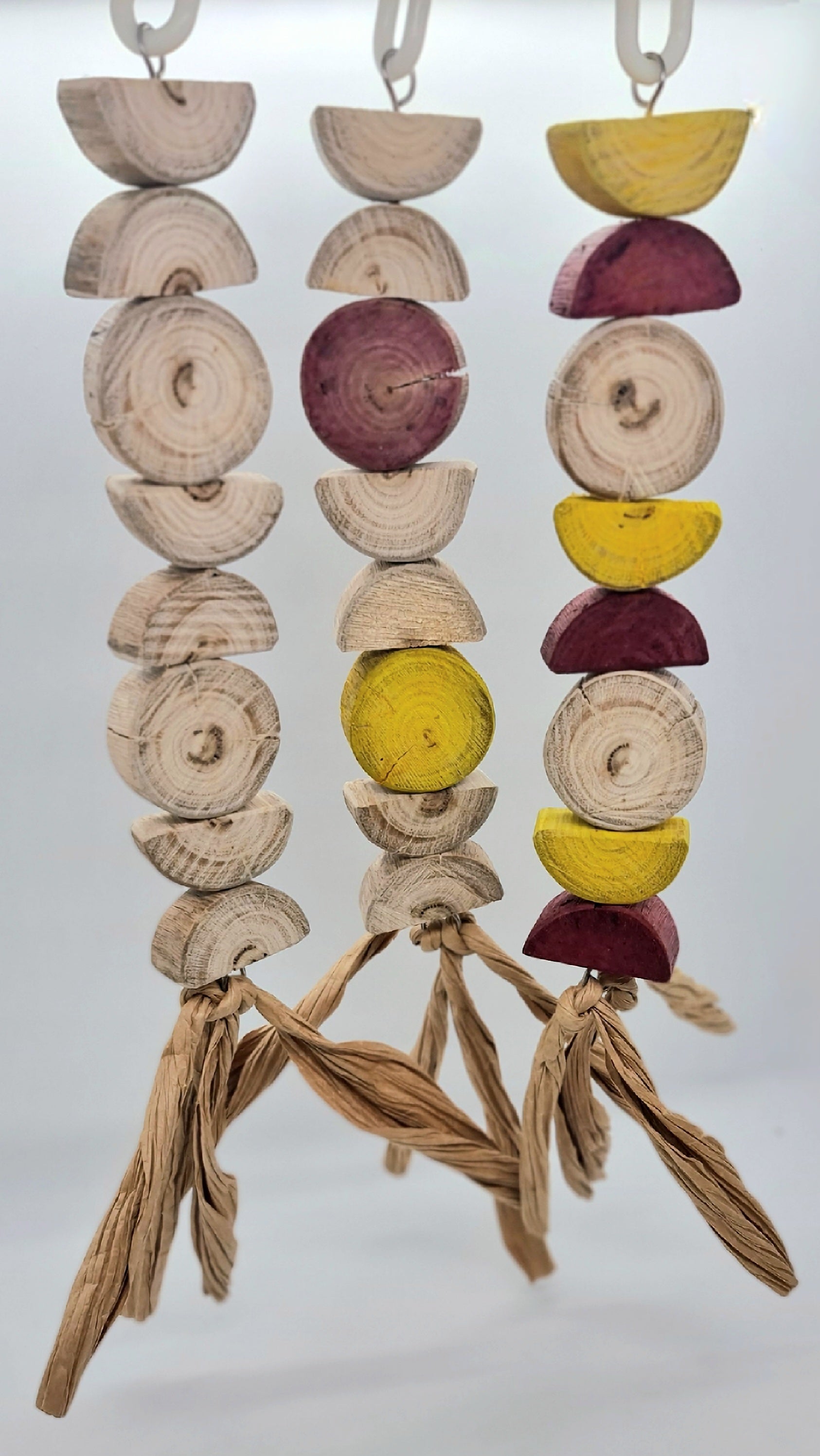 Made using stainless steel wire, wood(spotted gum), paper and a plastic hanger clip (option 2 turmeric and beetroot dyed wood)Suitable for small, medium, large and very large birds. 🦜🐦 Please note that your timber toy may start splitting/cracking/shrinking in areas as it continues to dry out since it has been freshly harvested from our forest, however this should not affect your birdies play time and fun with this toy 😁