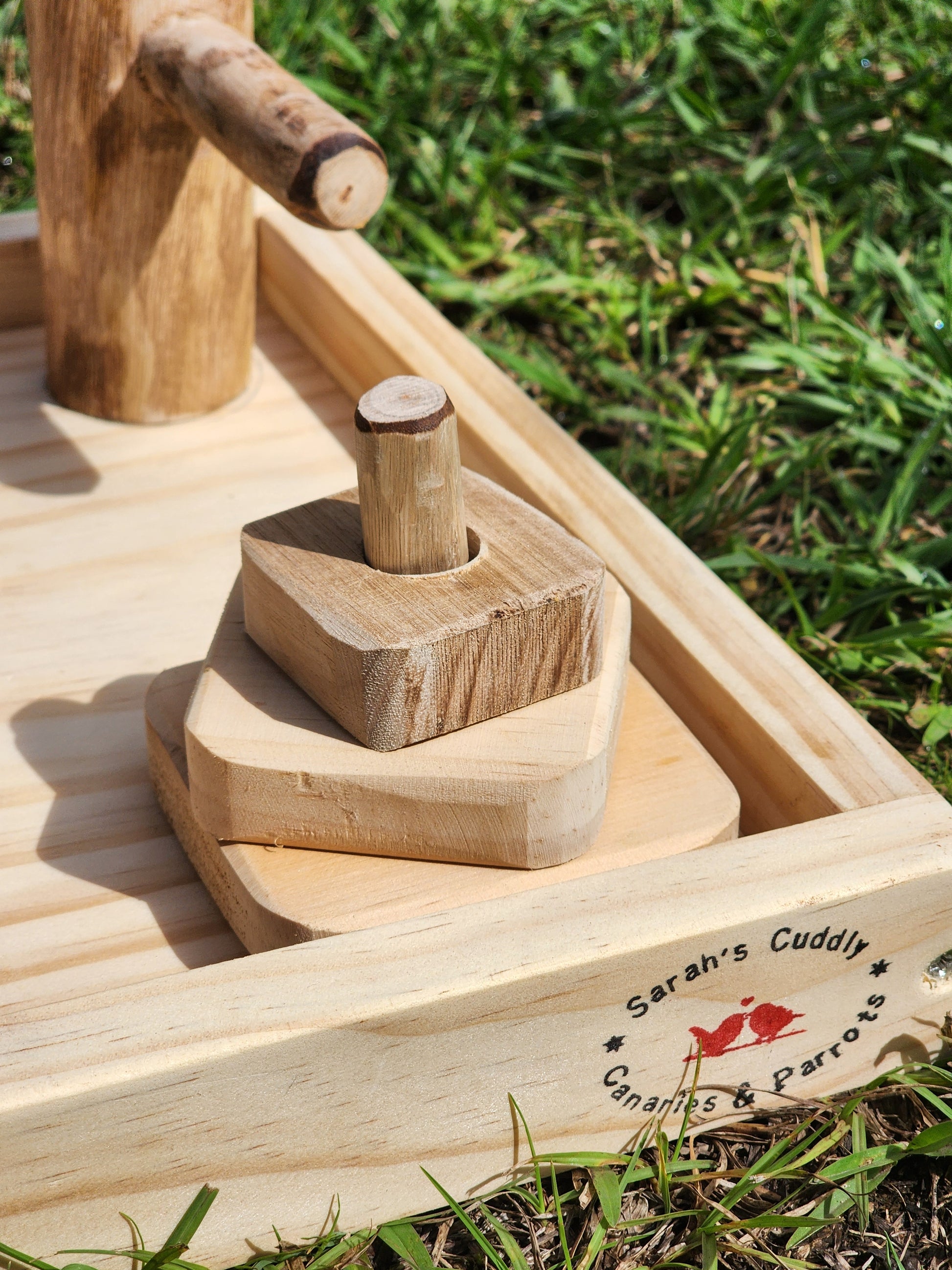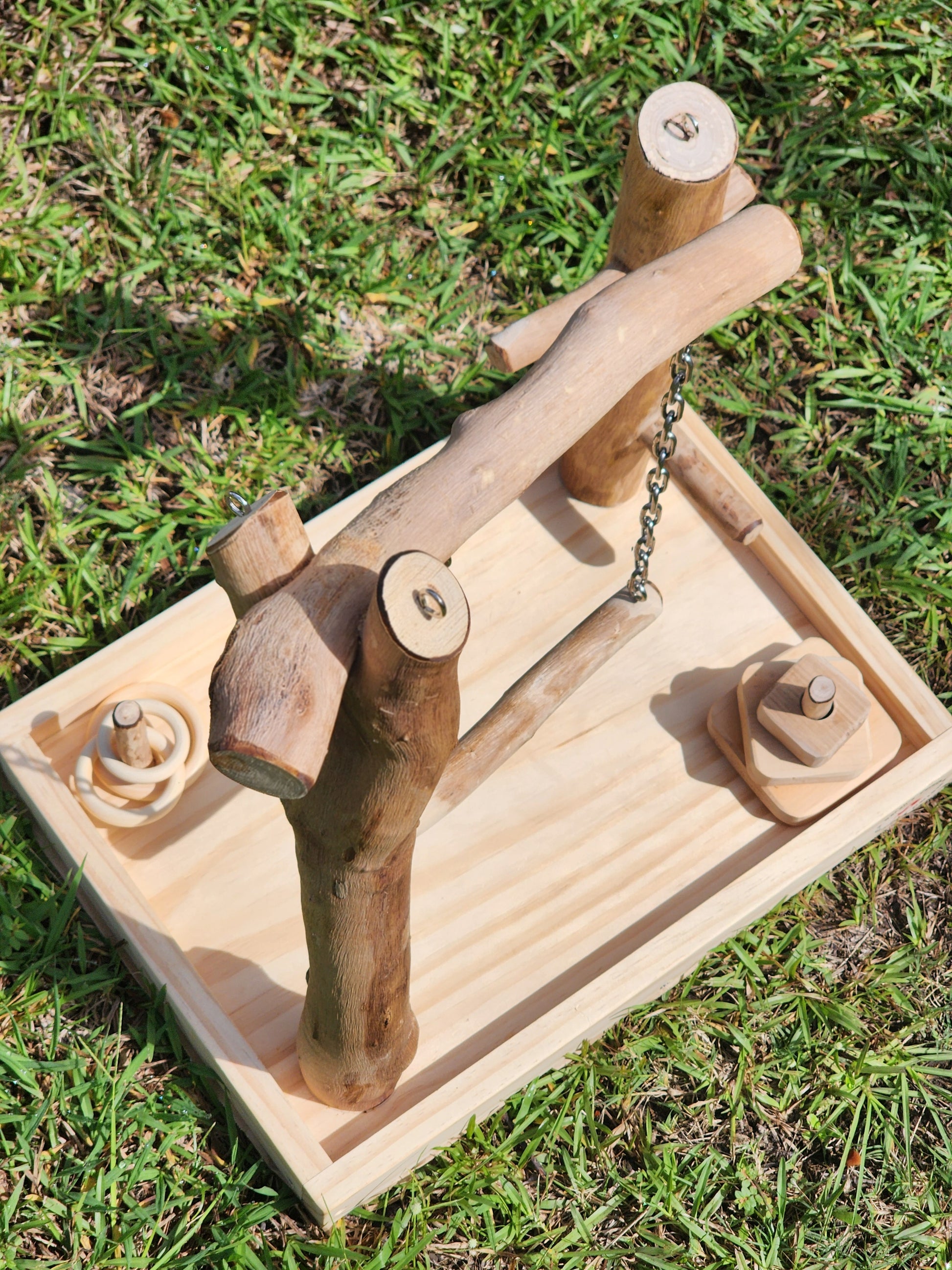 This super entertaining and solid play stand weighing in at kg is full of fun things for your birdie to do, with swinging on the stainless steel chain swing, climbing the doweled post or even playing with the pine wood rings and hand made cute pine wood blocks. It even has additional screw eye hooks to add more toys 🤩 Hand made from spotted gum(swing post/climbing post), visible screws stainless steel, stainless steel chain, nickel plate screw eyes, pine wood base/dowel/ring/blocks. Measures approximately cm tall (both posts height), swing length cm with in-between chain measuring cm and a diameter of cm. Pine timber base measures approximately cm x cm 🐦🦜 Suitable for small to medium birds (e.g. budgies, lovebirds, cockatiels quakers, conures, ringnecks, caiques, princess parrots, eclectus etc)