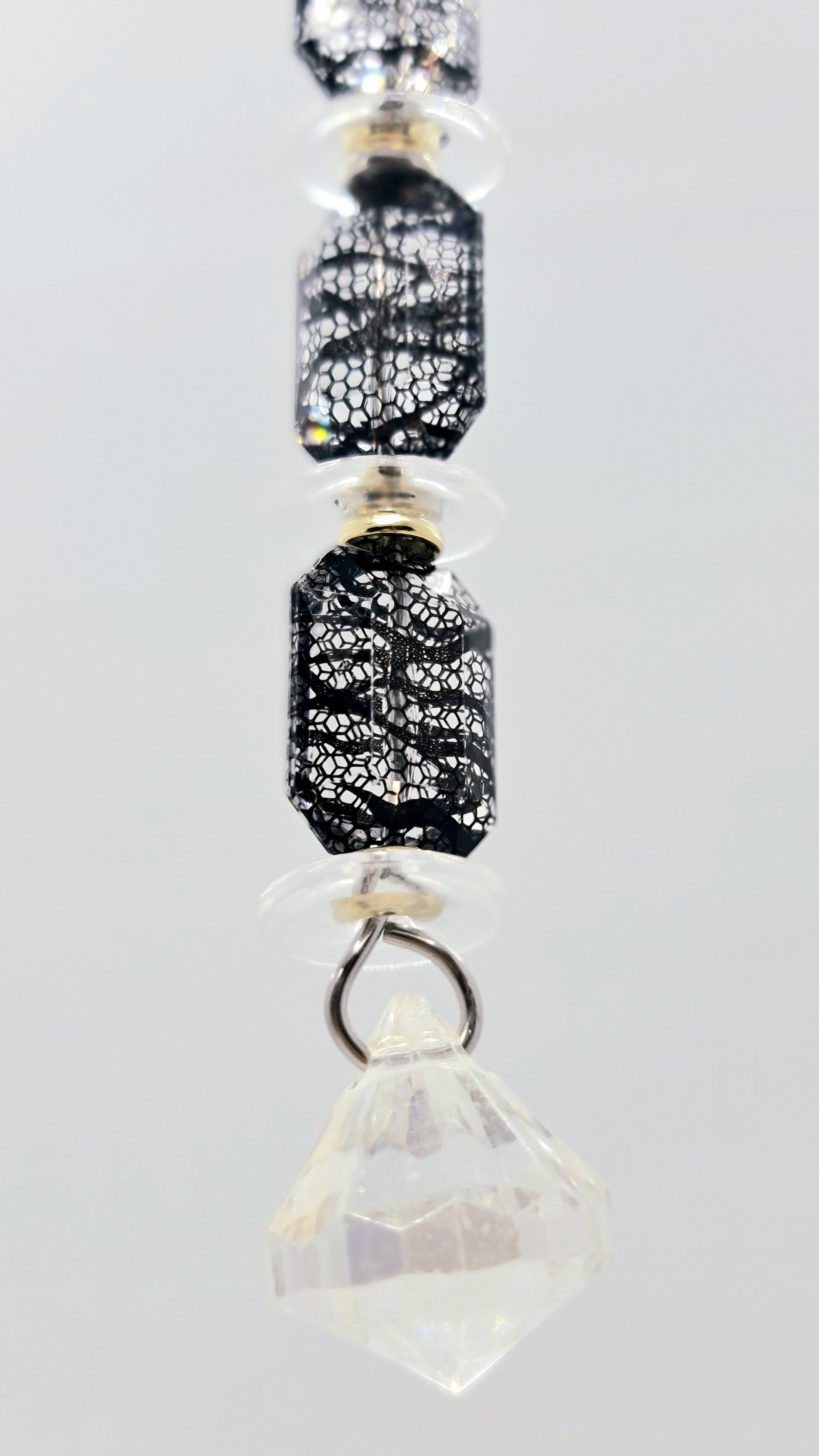 This black lace oblong and clear disc toy is a very cute and unique styled beaded toy to add to your birdies palace. Hand made using acrylic beads, stainless steel wire and a plastic clip as the hanger. The overall measurement from hanger clip to the base of the acrylic crystal is approximately 22.5cm long. 🦜🐦 Suits very small, small and medium birdies.