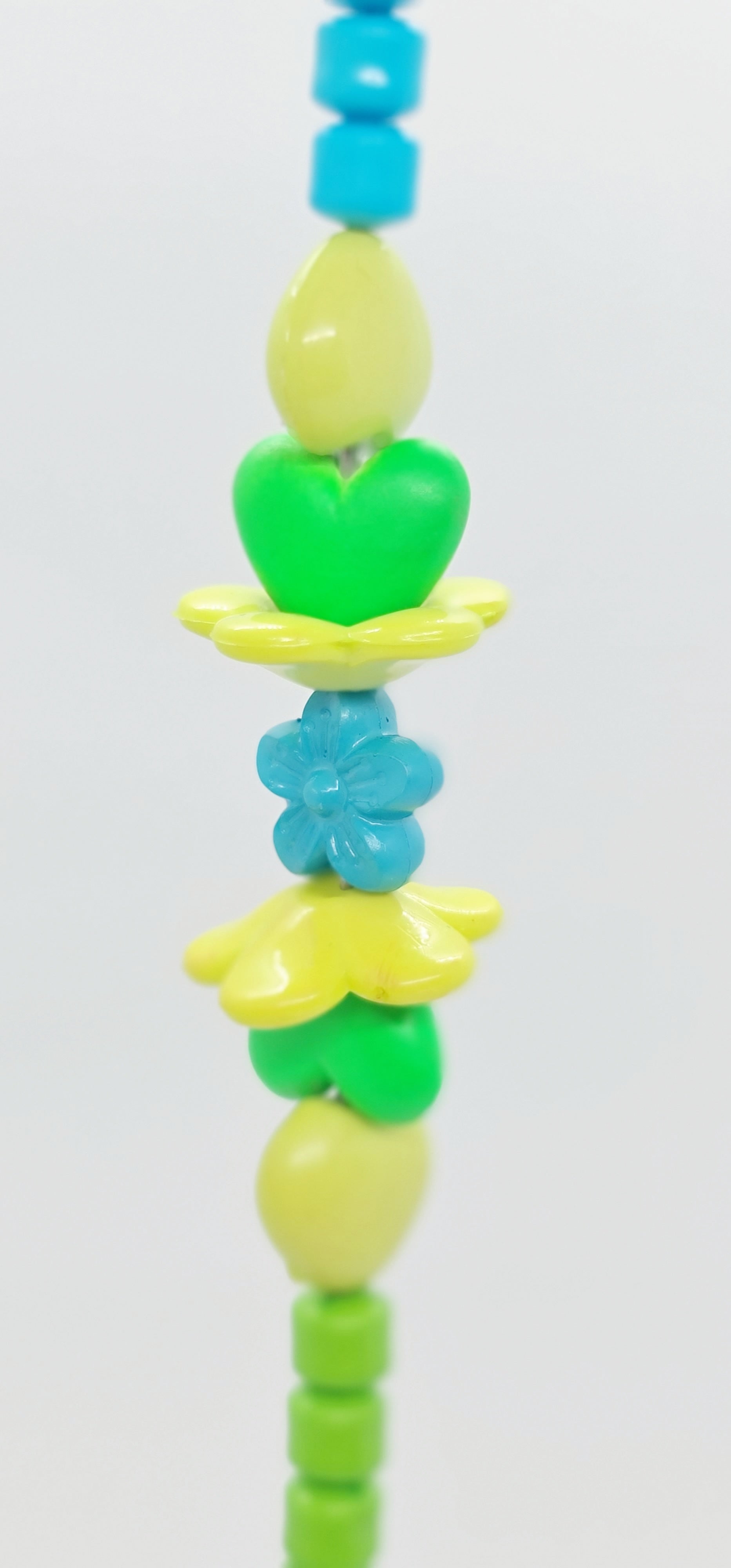 This blue and green fluoro hearts and flowers toy is a very cute and simple addition to your birdies palace. Hand made using acrylic beads, stainless steel wire and a plastic clip as the hanger. The overall measurement from hanger clip to the acrylic base of the pacifier is approximately 24cm long. 🦜🐦 Suits very small, small and medium birdies.
