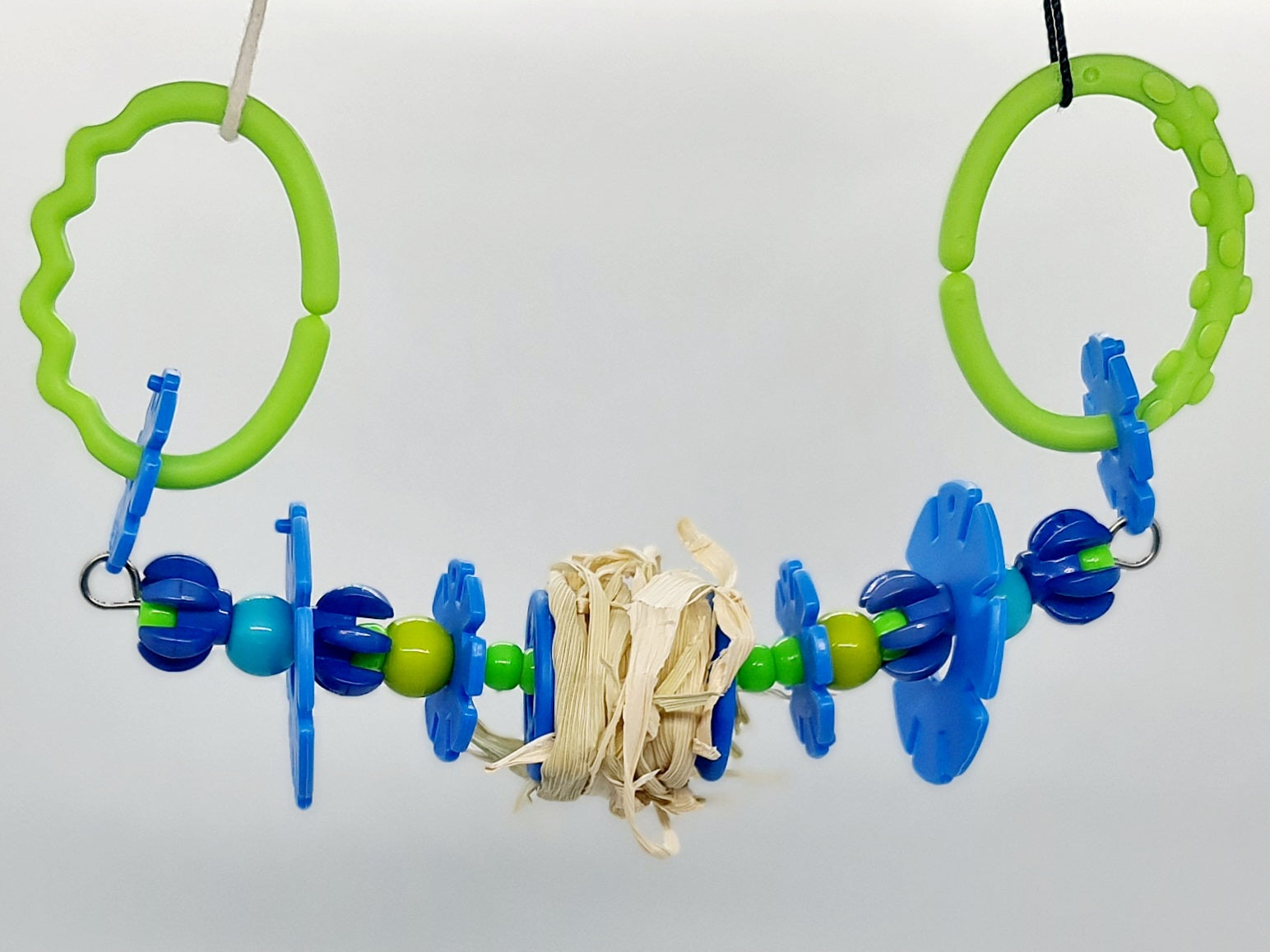 This blue and green double hanger toy with spinning wheel accessories is a great addition to any bird's palace. Crafted with acrylic beads and components and stainless steel wire, it can be used as a fun activity or as a beaded swing, and measures 18cm from hanger clip to hanger clip. Perfect for very small, small, and medium birds 🐦🦜