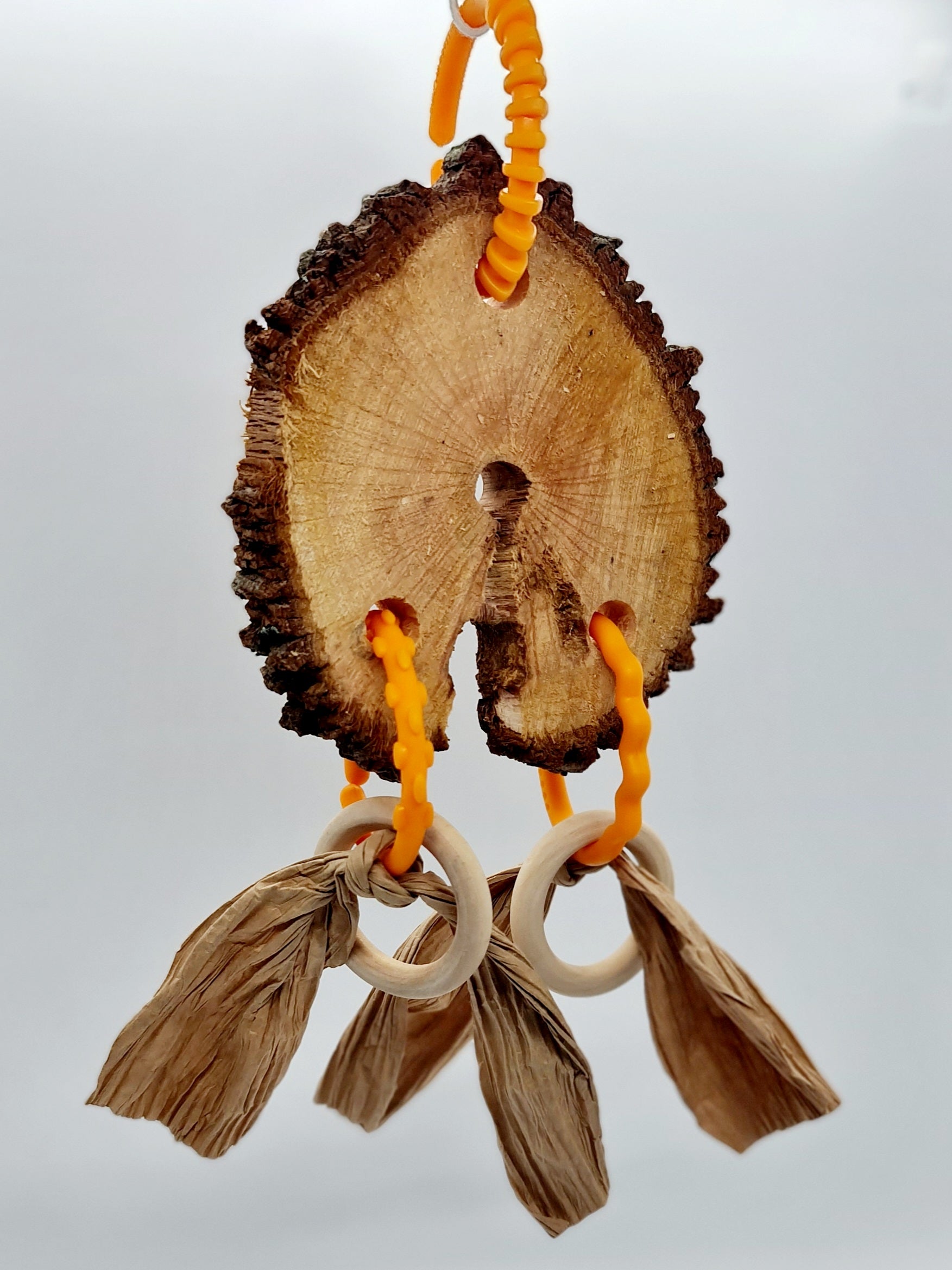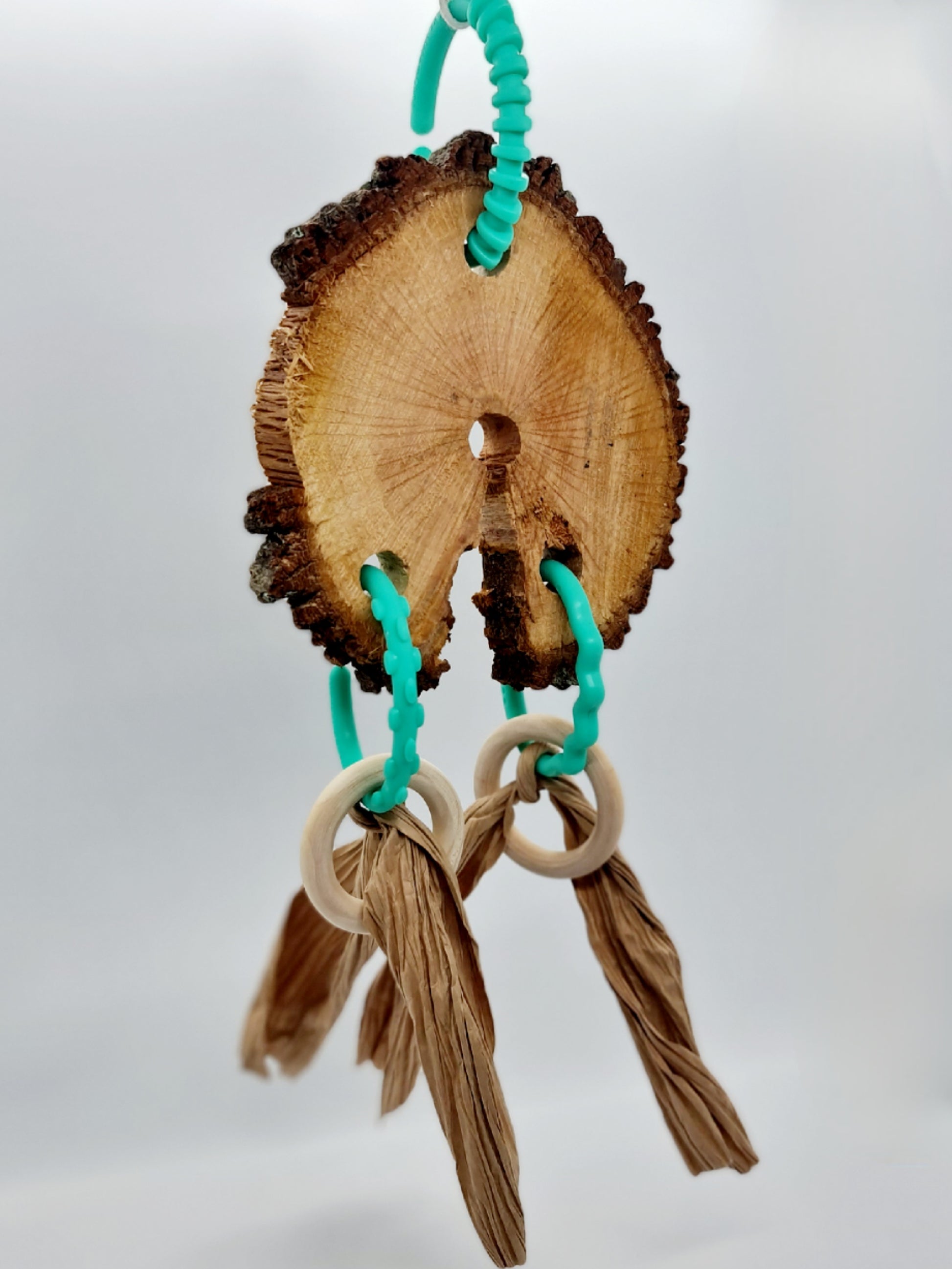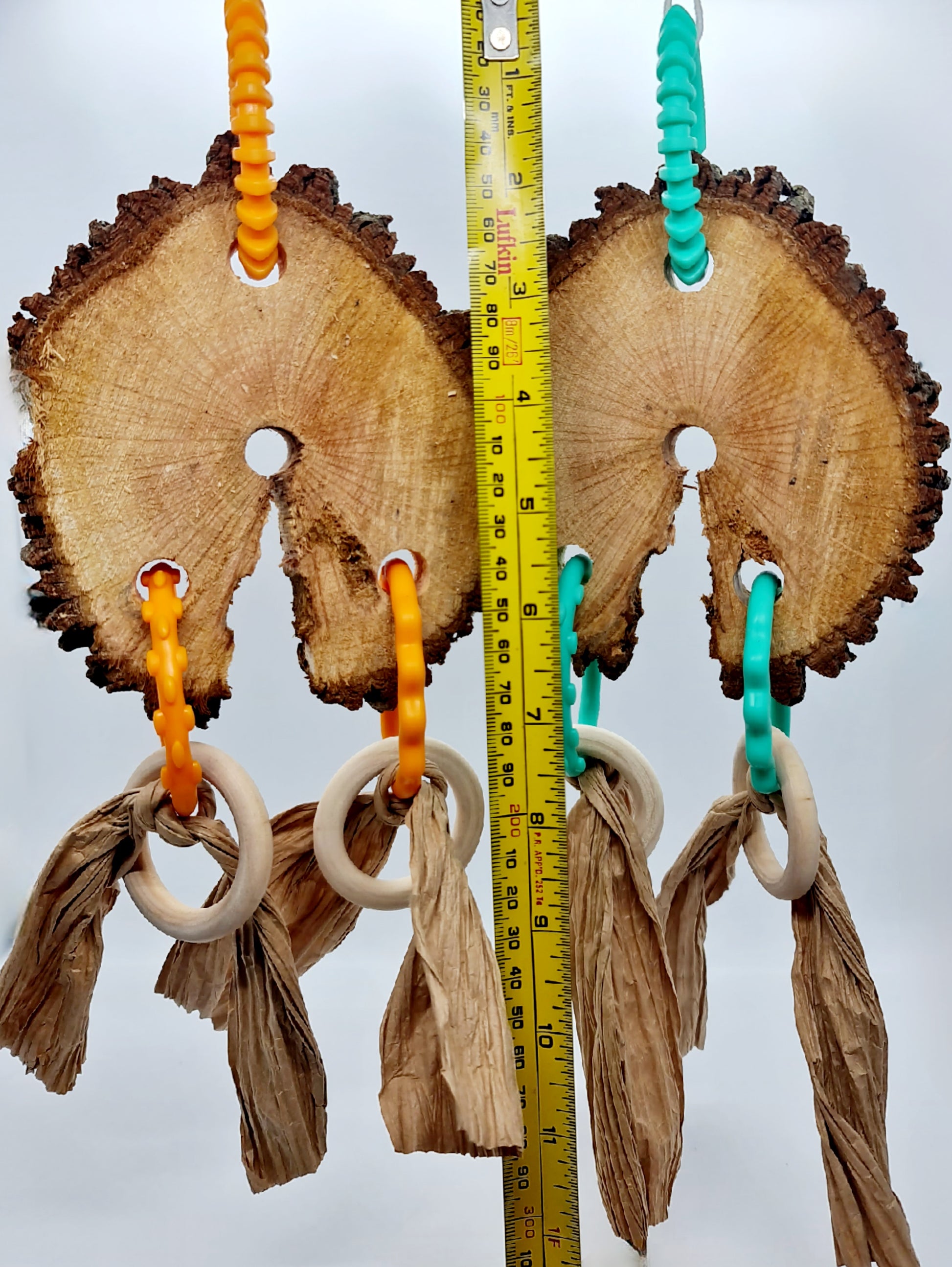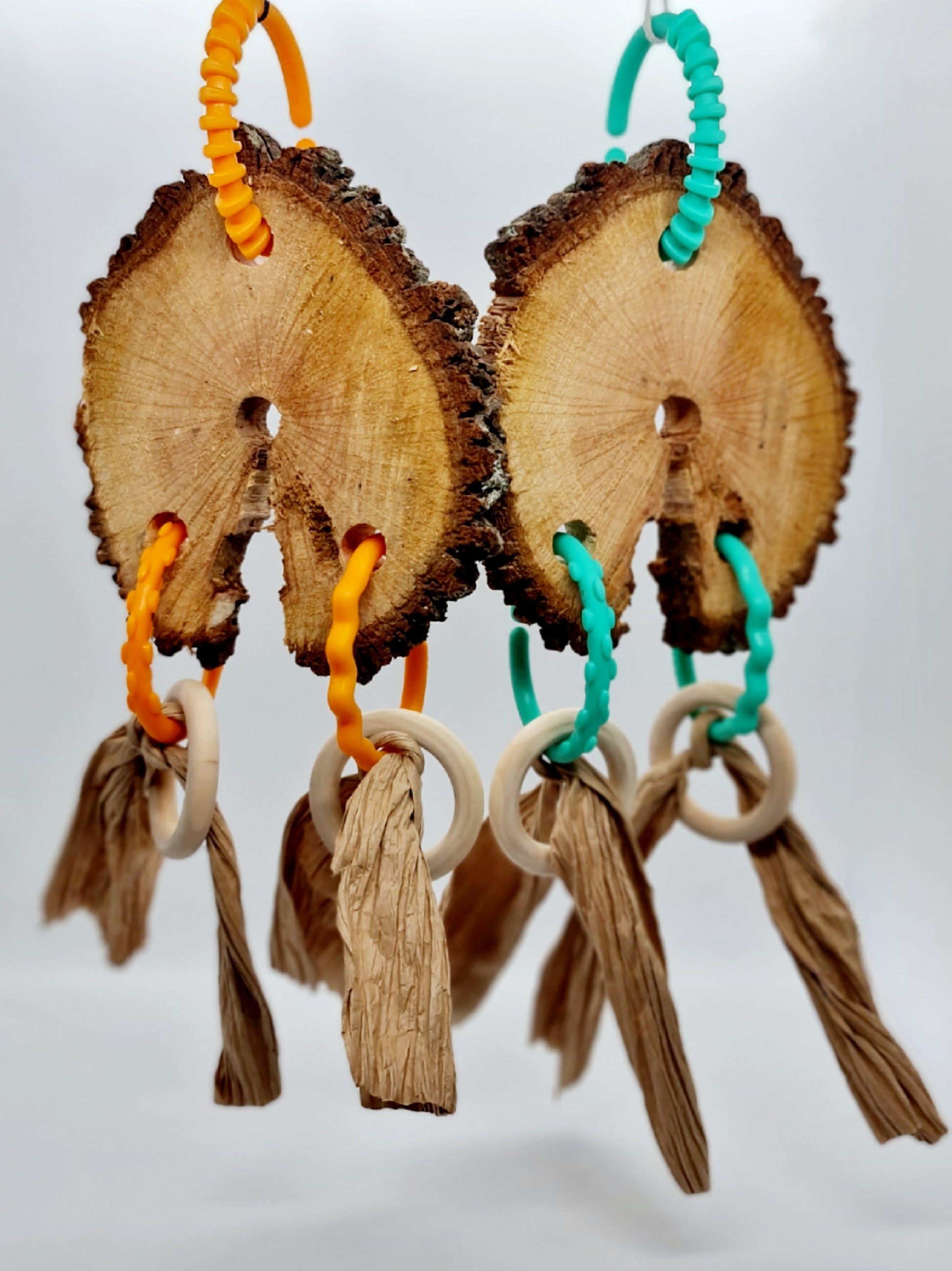 These casuarina slices come in 2 different colours to choose from, orange or turquoise. They have a large chewing component with fun rings to play and hang off of with the addition of shreddable paper and wood rings. Hand made using a slice of casuarina sourced from our forest, acrylic rings, paper and pine wood rings. Each width measures approximately 12cm and is approximately 2cm thick and the overall measurement from hanger clip to the paper ends is approximately 28cm long. 🦜🐦 Suits, very small, small, medium and large birdies 🤩 Please note that your timber toy may start splitting/cracking/shrinking in areas as it continues to dry out since it has been freshly harvested from our forest, however this should not affect your birdies play time and fun with this toy 😁