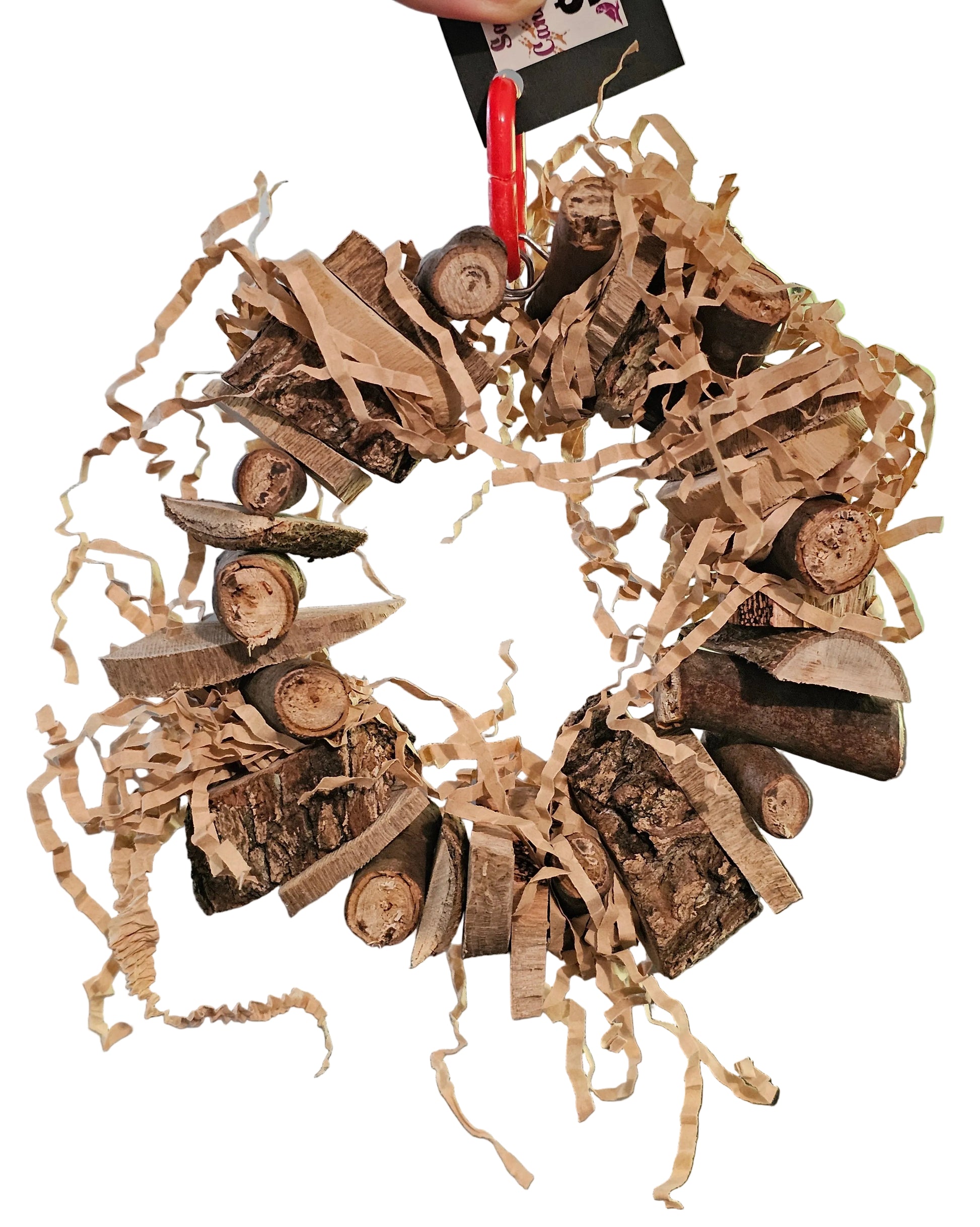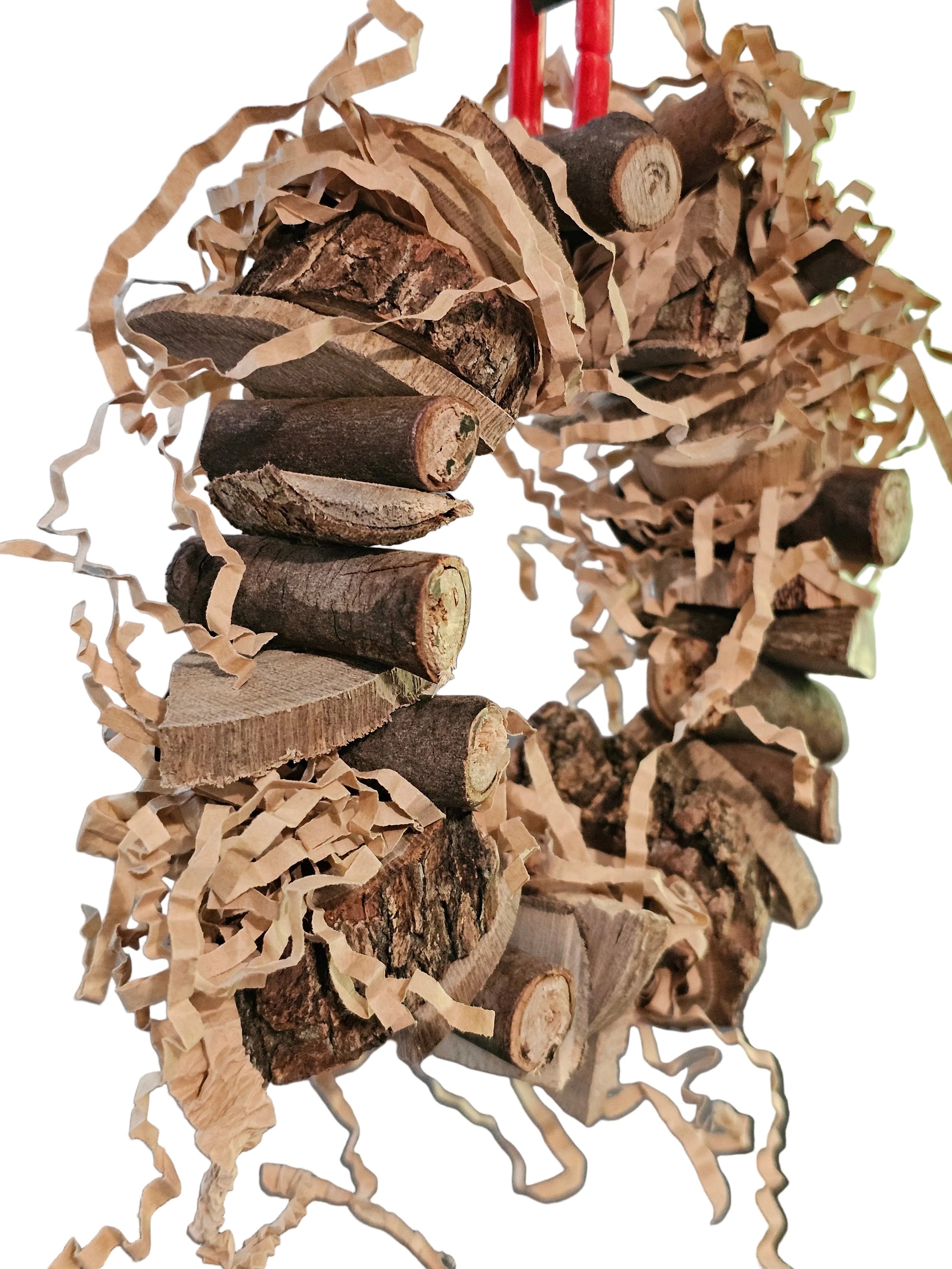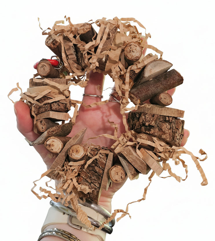 Lots to offer on this Chunky Chips Nibbler Ring. Varoius bits of wood from our forest, such as spotted gum ironbark and any other Australian gums we find on our property 🦜🐦 then some shredded paper for an extra zing 😁 all this is threaded onto stainless steel wire and hang from a plastic clip.