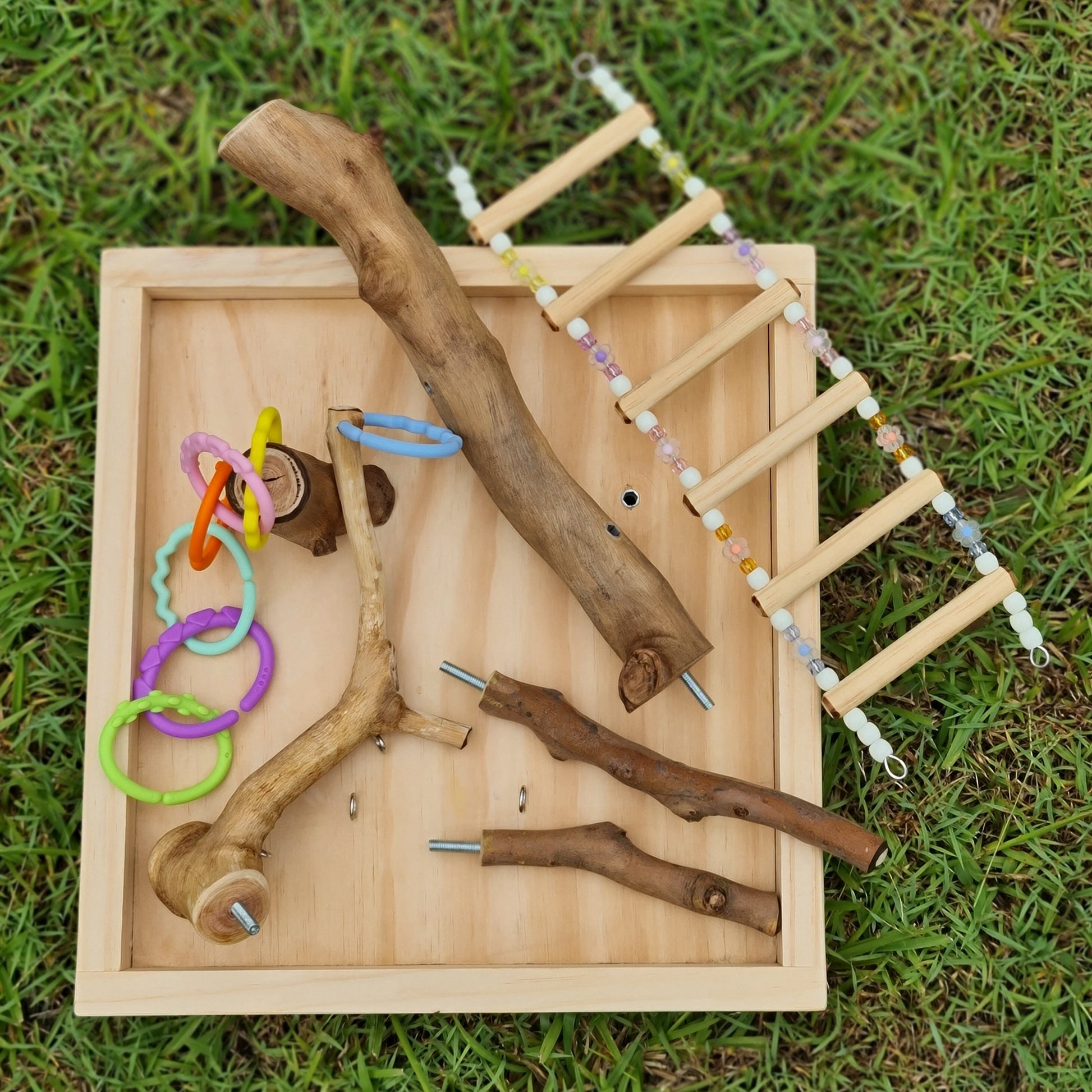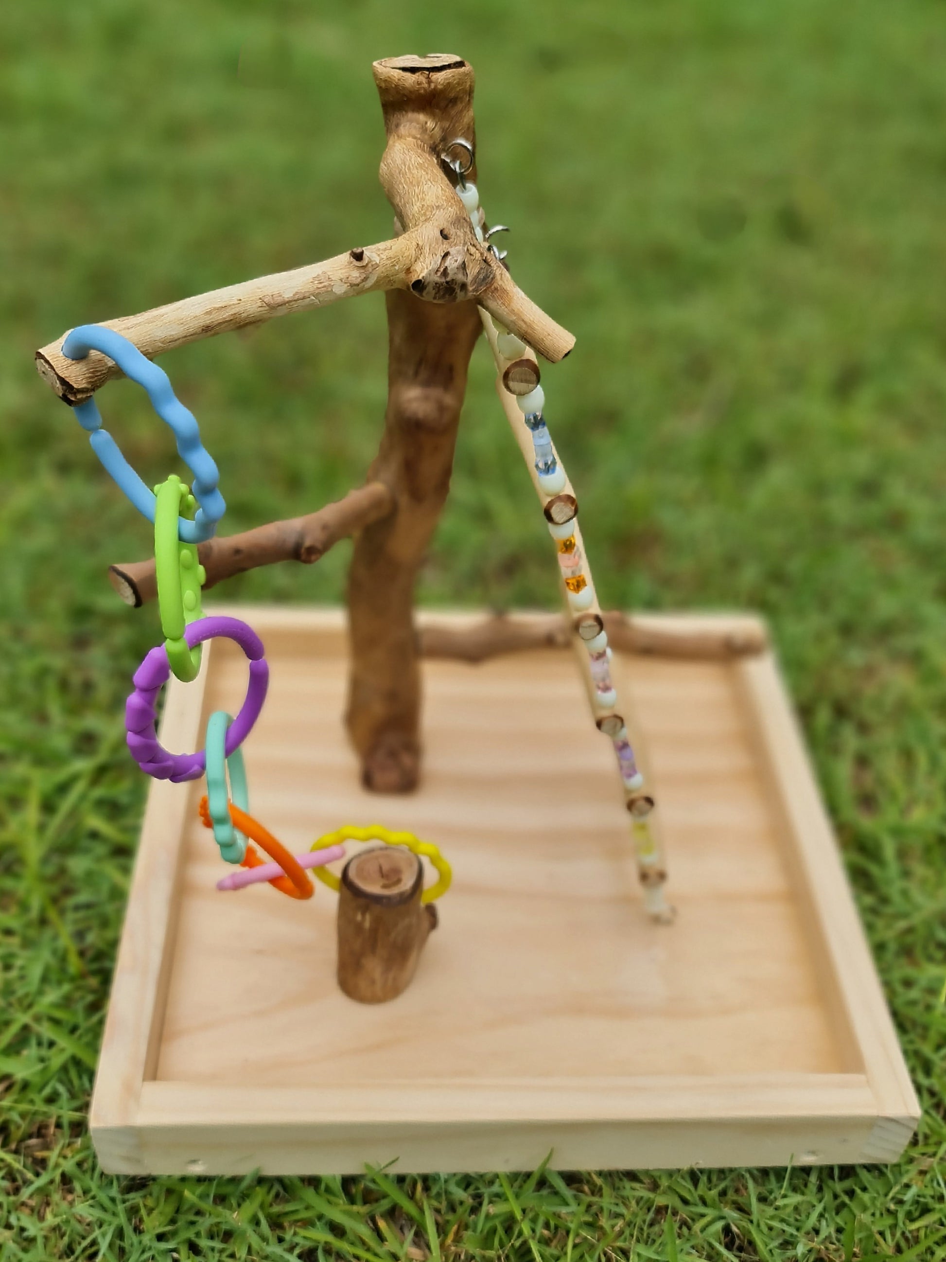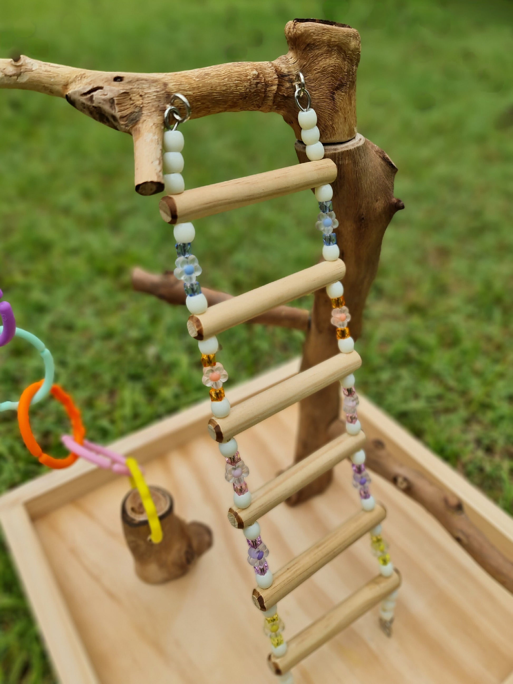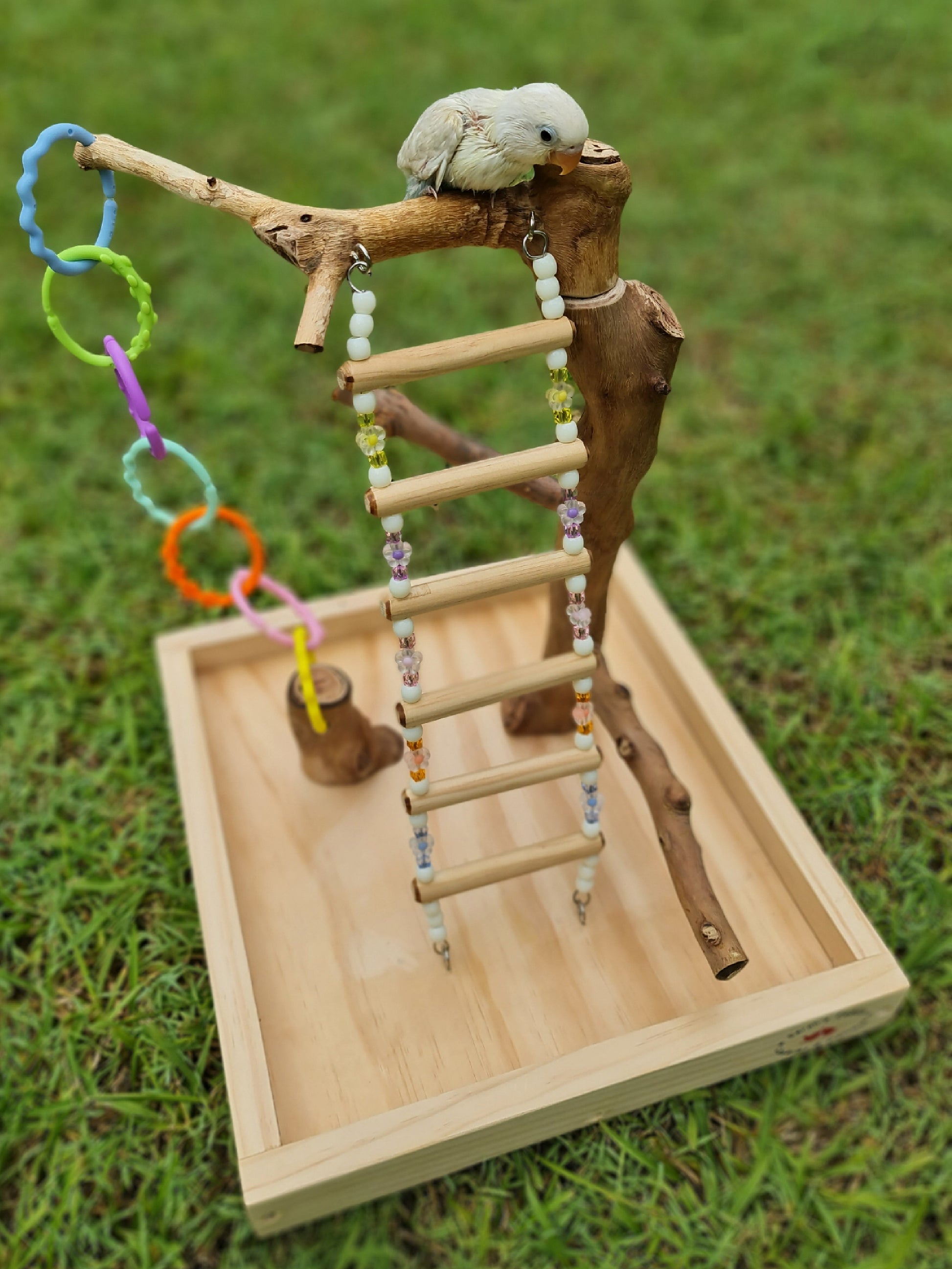This fun and cute buildable play stand weighs in at around 2kg, comes with a pretty ladder and colourful links for plenty of climbing activities. You will receive this stand as a flat pack ready for you to simply piece it together (as seen in the last photo), using the pre-existing bolts and inserted screws. Hand made from spotted gum(play posts and perches), acrylic beads, pine dowel, plastic links, visible screws stainless steel/hidden bolts and screws zinc and a pine wood base. Measures approximately 36cm tall, top perching length 20cm with a diameter of 1 to 2cm, 2nd (middle) perching length 13cm with a 2cm diameter, 3rd perch (lowest) 19cm in length with a diameter of 2cm, ladders length 35cm x 10cm wide and the pine timber base measures approximately 34cm x 32cm 🐦🦜 Suitable for very small, small and medium birds (e.g. canaries/finches/budgies/lovebirds/cockatiels/quakers/conures/ringnecks/caiques/princess parrots) Please note the baby lovebird for size comparison 😍