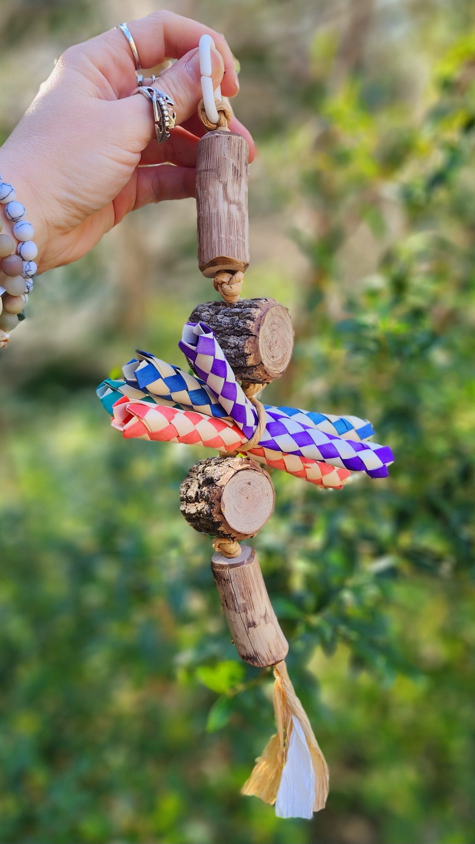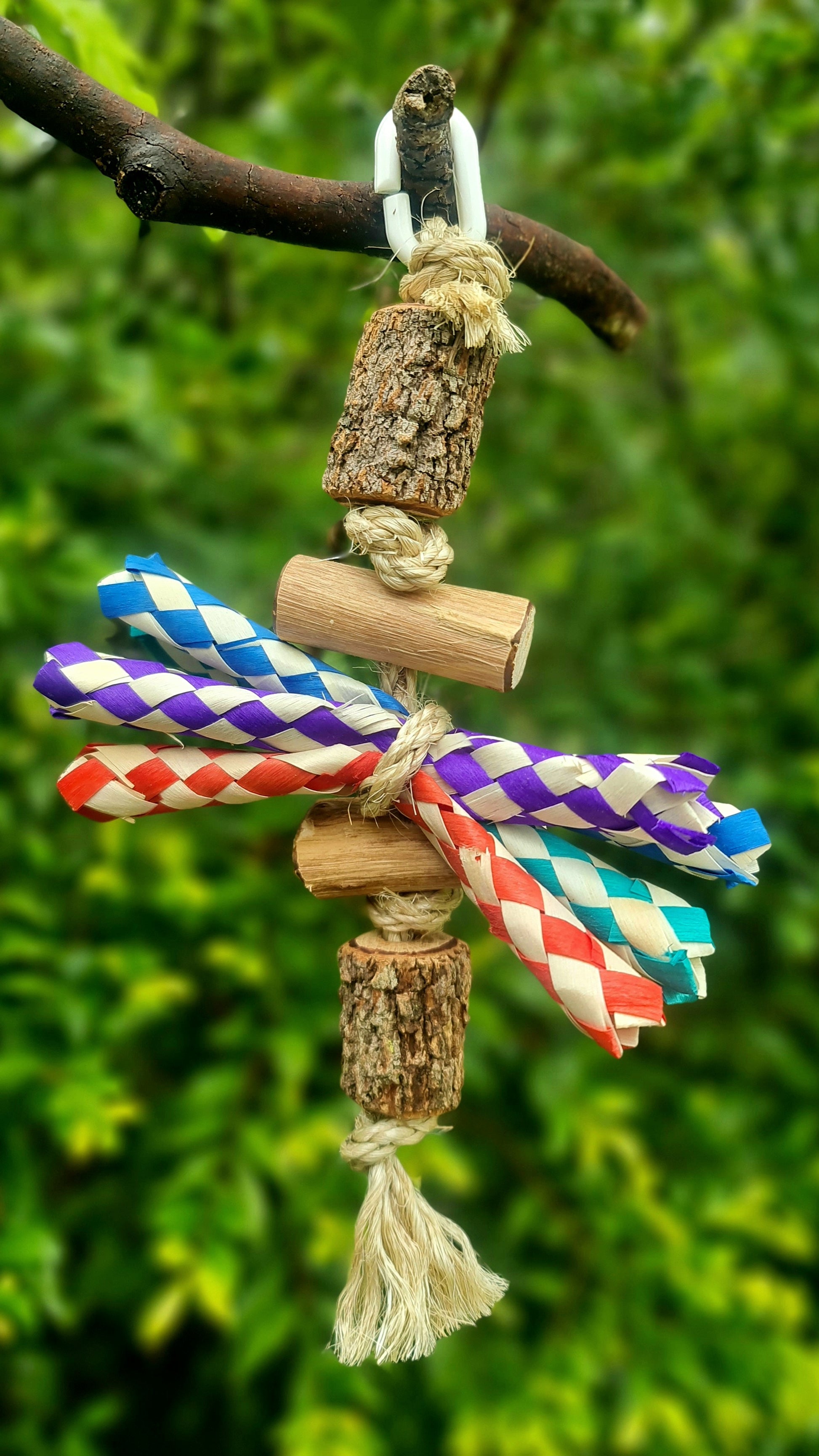 This shreddable toy features a mix of spotted gum and casuarina timber, with a vibrant centre of colourful bamboo for endless shreddable fun. Handmade using timber, rope, bamboo and a plastic clip as the hanger. The overall measurement from hanger clip to the rope base is approximately 25cm long. 🦜🐦 Suits very small, small, medium and large birdies 🤩 (there may be a variation in the timber size and colour due to this toy being a recreatable one, however it's approximate length and style will ramain the same ☺️) Please note that your timber toy may start splitting/cracking/shrinking in areas as it continues to dry out since it has been freshly harvested from our forest, however this should not affect your birdies play time and fun with this toy 😁