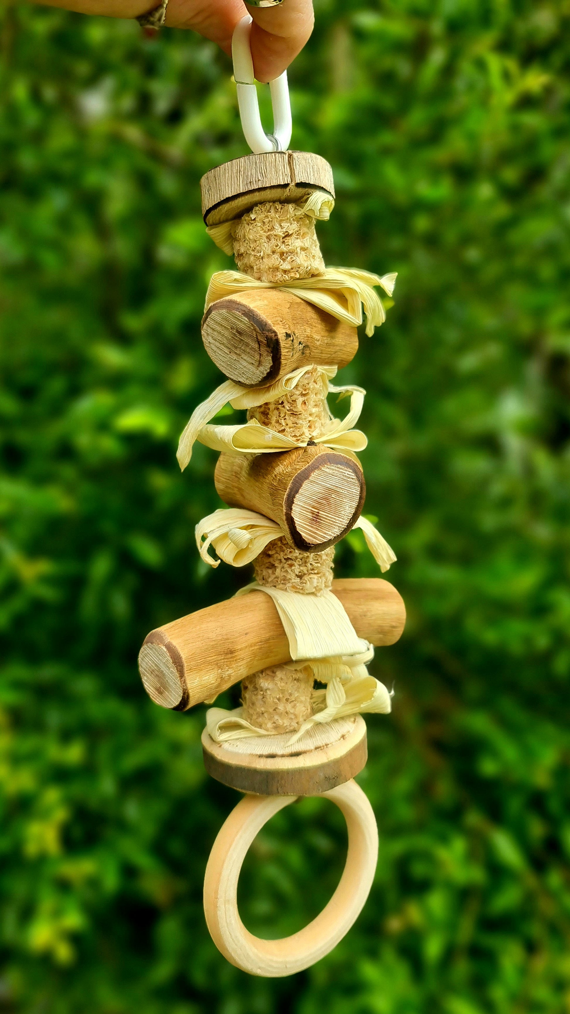 Discover the ultimate solution for entertaining your beloved birds: the corn cob and timber stacker forest shreddable toy! This exciting toy features all of the elements that birds adore, such as dried corn cob (sterilized with vinegar and boiled water, then sun-dried), corn husk, spotted gum timber, and stainless steel wire. Easily hang it up using the provided plastic hanger clip and watch as your feathered friends enjoy approximately 28cm of endless fun. Suitable for birds of all sizes. 🤩🦜 (there may be a variation in timber type, size and colour due to this toy being a recreatable one, however it's approximate length and style will remain the same ☺️) Please note that your timber toy may start splitting/cracking/shrinking in areas as it continues to dry out since it has been freshly harvested from our forest, however this should not affect your birdies play time and fun with this toy 😁
