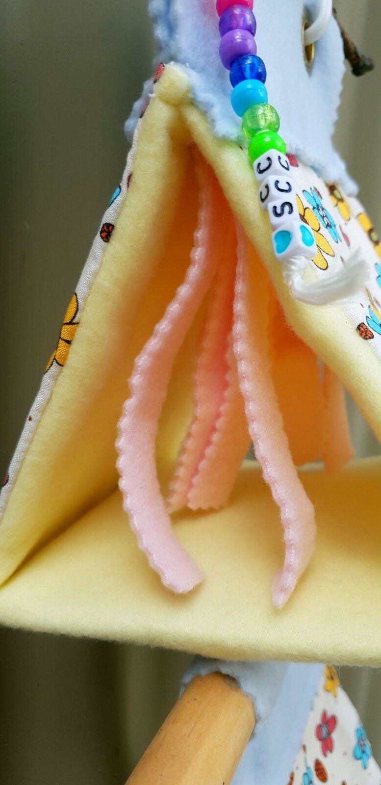Cozy Birdie Bunk Bed 'Fab Florals' size SMALL, hand made from polar fleece, cotton with a wooden perch and acrylic beads. Measures approximately 37cm long (from hanger clip to bottom), individual beds measure 14cm long x 14cm wide x 13cm high.🦜🐦