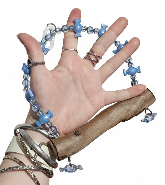 This cute blue lolly swing has 10 little lolly beads and glassy look acrylic beads between on a natural real Australian wood perch that's cut from our own property. Two little glassy look acrylic lollies dangle under the perch. Measures approximately 15cm perch length x 18cm from hanger clip to perch. Handmade from Australian timber, acrylic beads and stainless steel wire. 🐦🦜Suitable for mini to small birds e.g. Canaries, Love Birds, Parrotlets, Budgies, Bourkes etc 🐦🦜