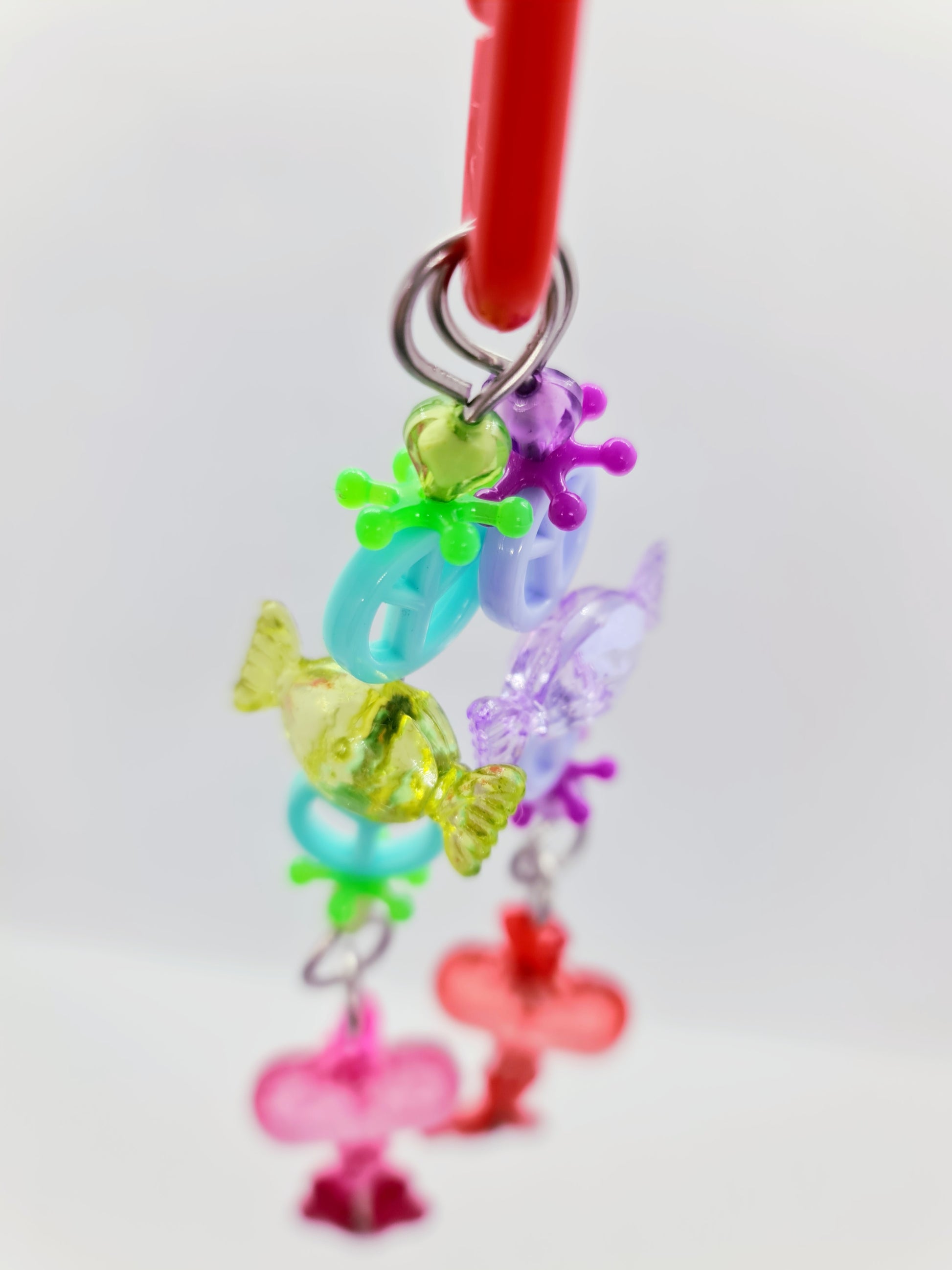 This double stranded toy with cute lollies, hearts and flowers is hand made using acrylic beads and stainless steel wire. The overall measurement from hanger clip to the base of the acrylic hearts is approximately 20cm long. 🦜🐦 Suitable for very small to medium birds.