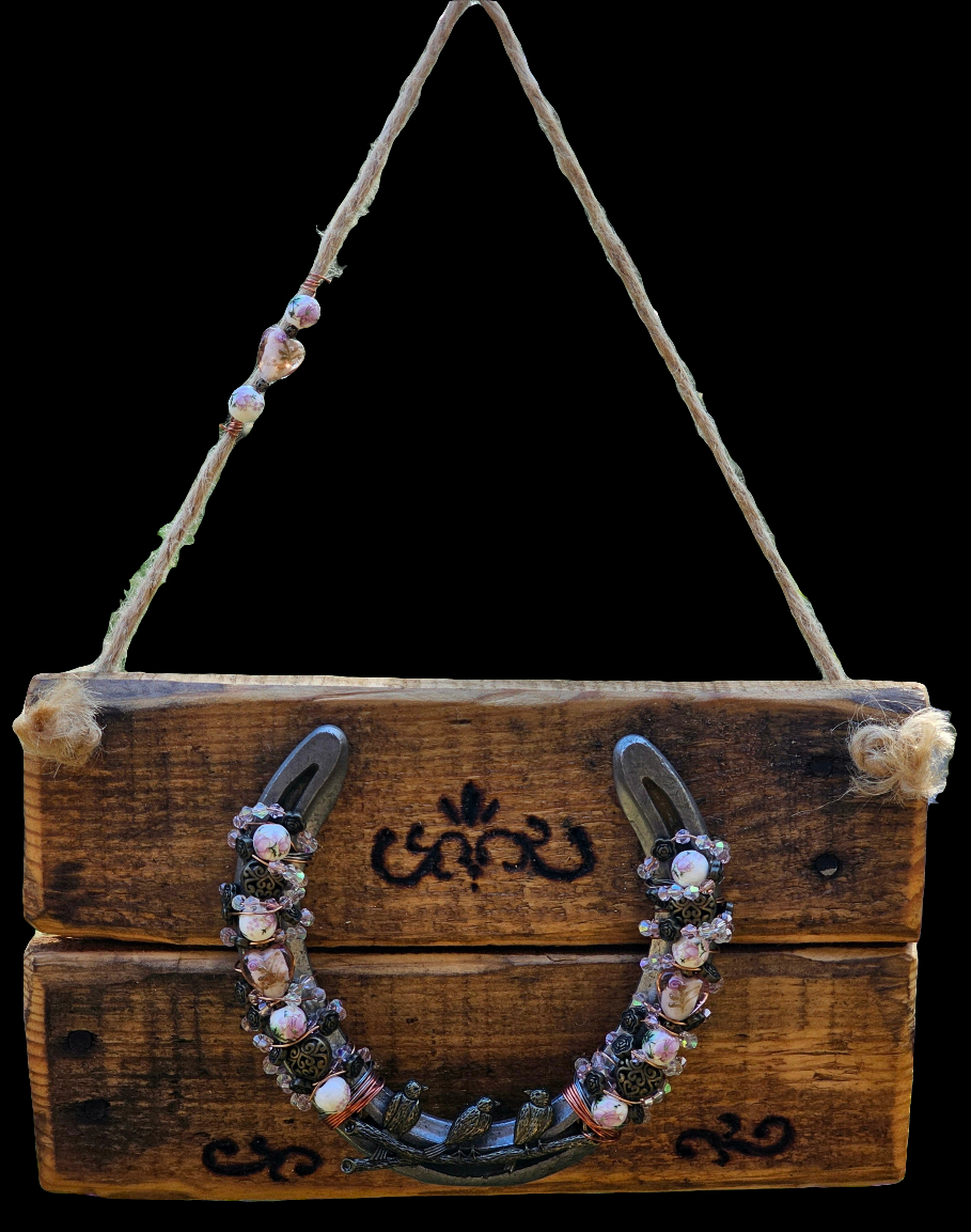 Horseshoes have long been cherished as symbols of good luck and protection, while the birds on a branch symbolise community, safety, and peaceful moments shared and the timber pallet speaks to resilience, sustainability, and a second life for forgotten materials. Together, they create a meaningful and decorative charm for any space.