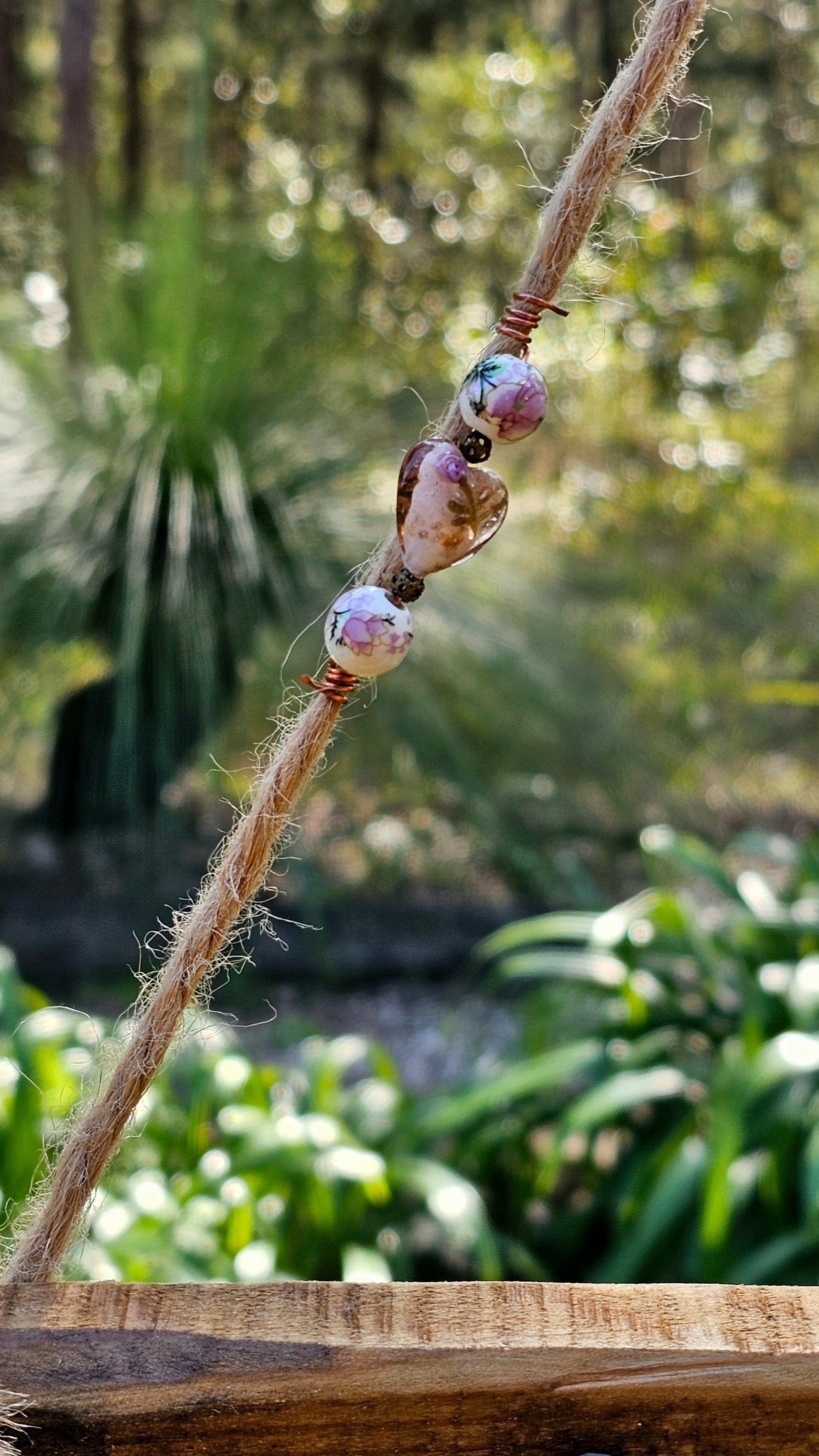 ✨️ Hand-wrapped copper wire, pink and white floral ceramic beads, faceted pink glass beads, 2 filled lampwork heart glass beads, antique bronze flower beads, 4 antique bronze heart beads, three small perched birds charm on a branch, mounted to a handmade pallet wood panel with decorative burnt wood detailing and hung with natural jute rope featuring matching glass bead accents