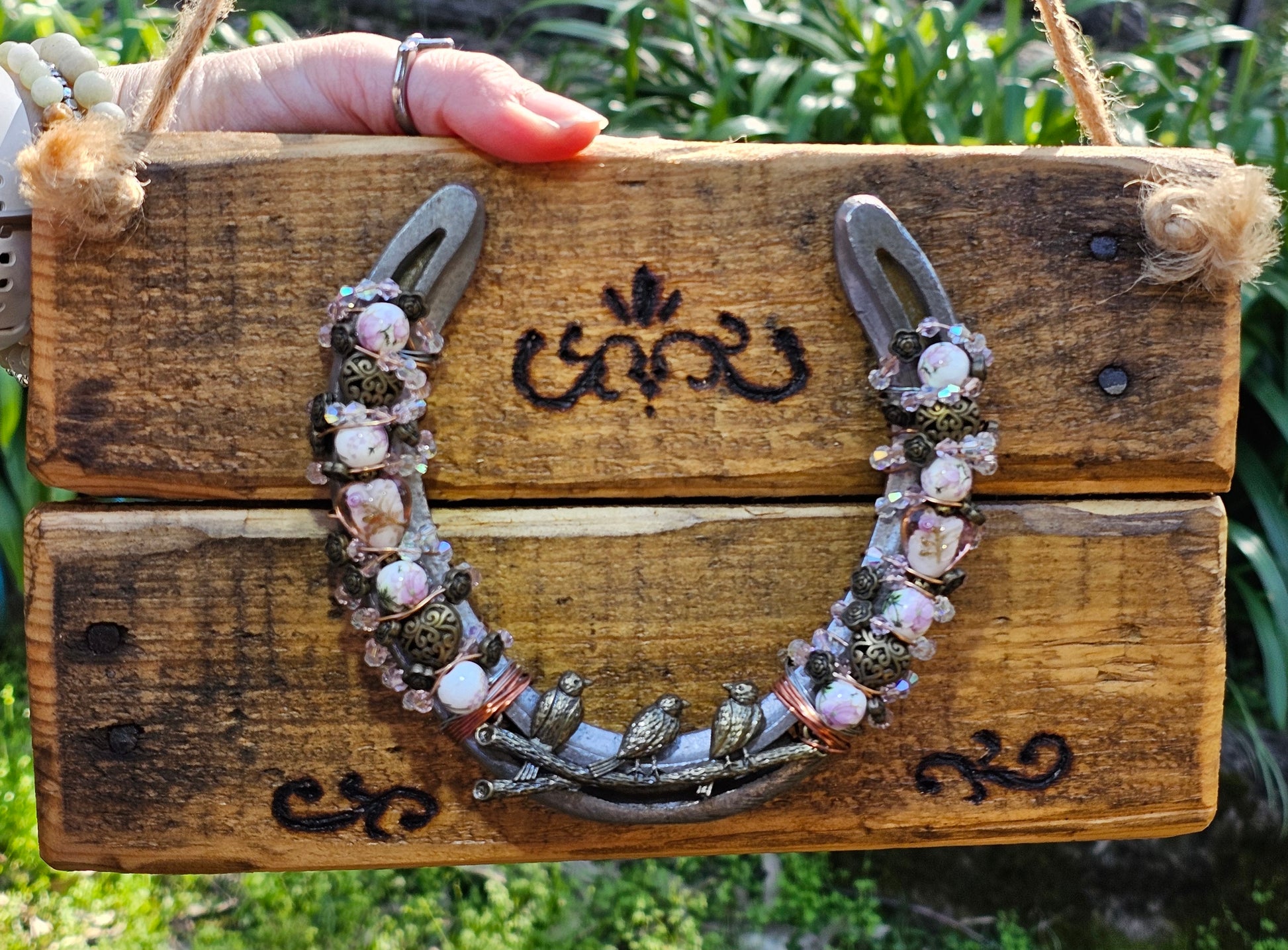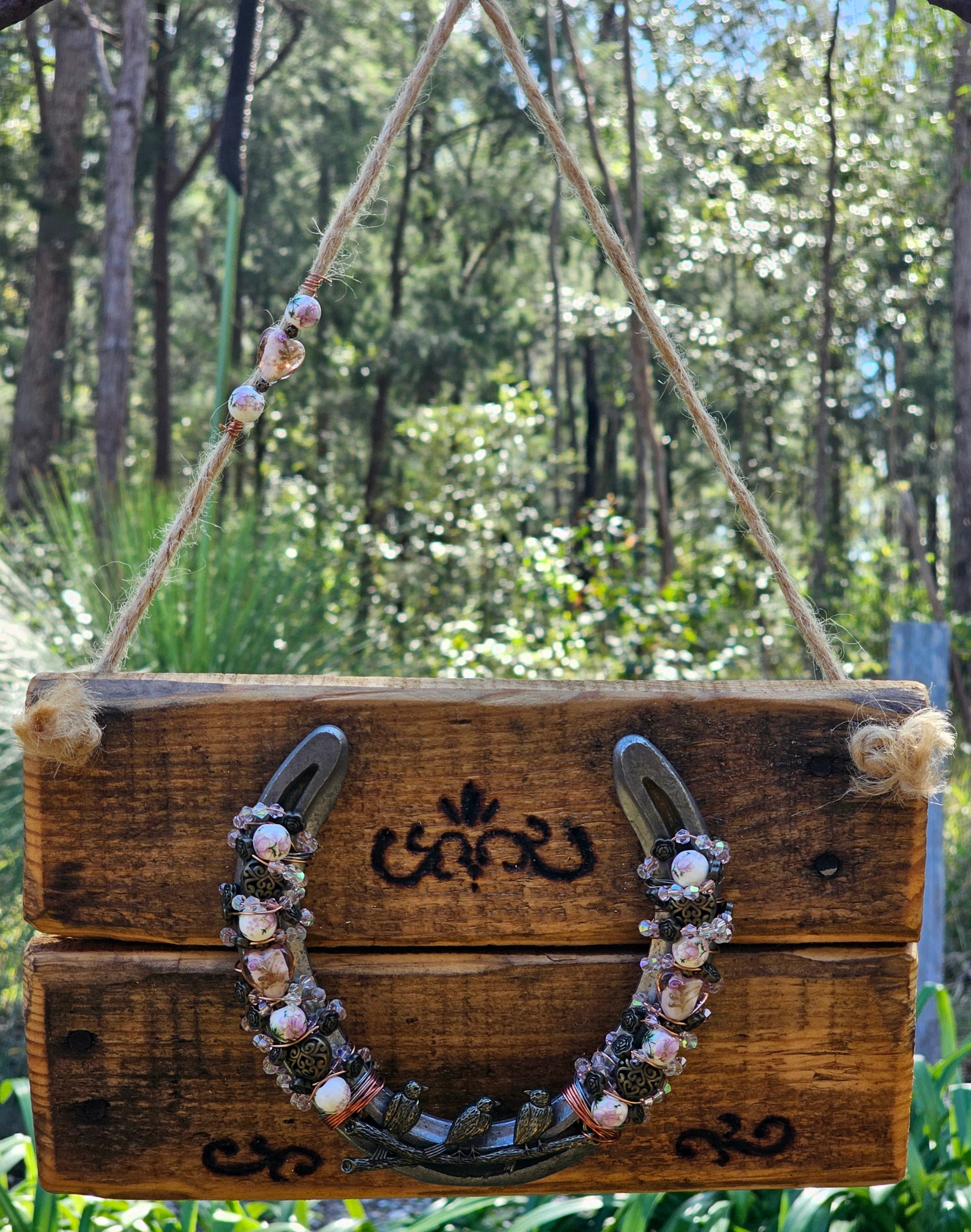 Backing the horseshoe is a handcrafted wooden panel made from reclaimed timber pallet, carefully sanded, stained, and decorated with hand-burnt scrollwork motifs. The natural knots and grain of the wood give it organic texture, while jute rope and decorative beading complete the look.