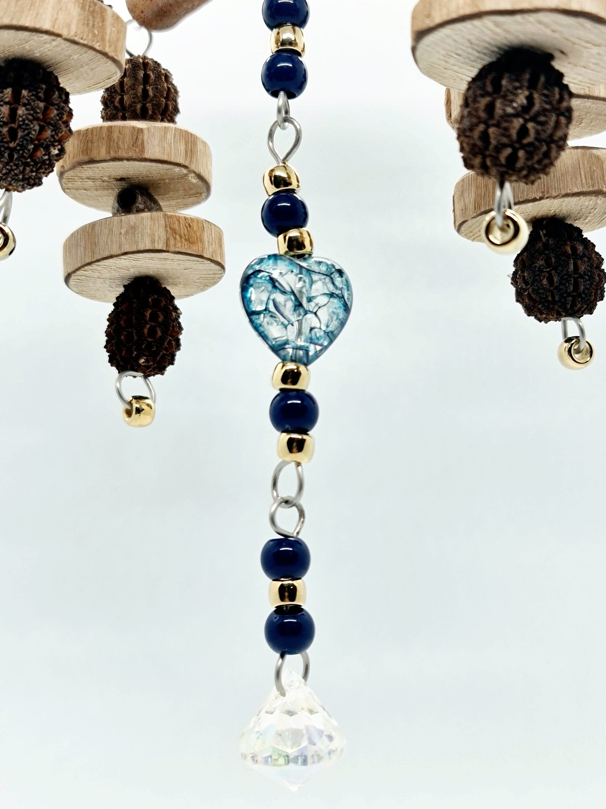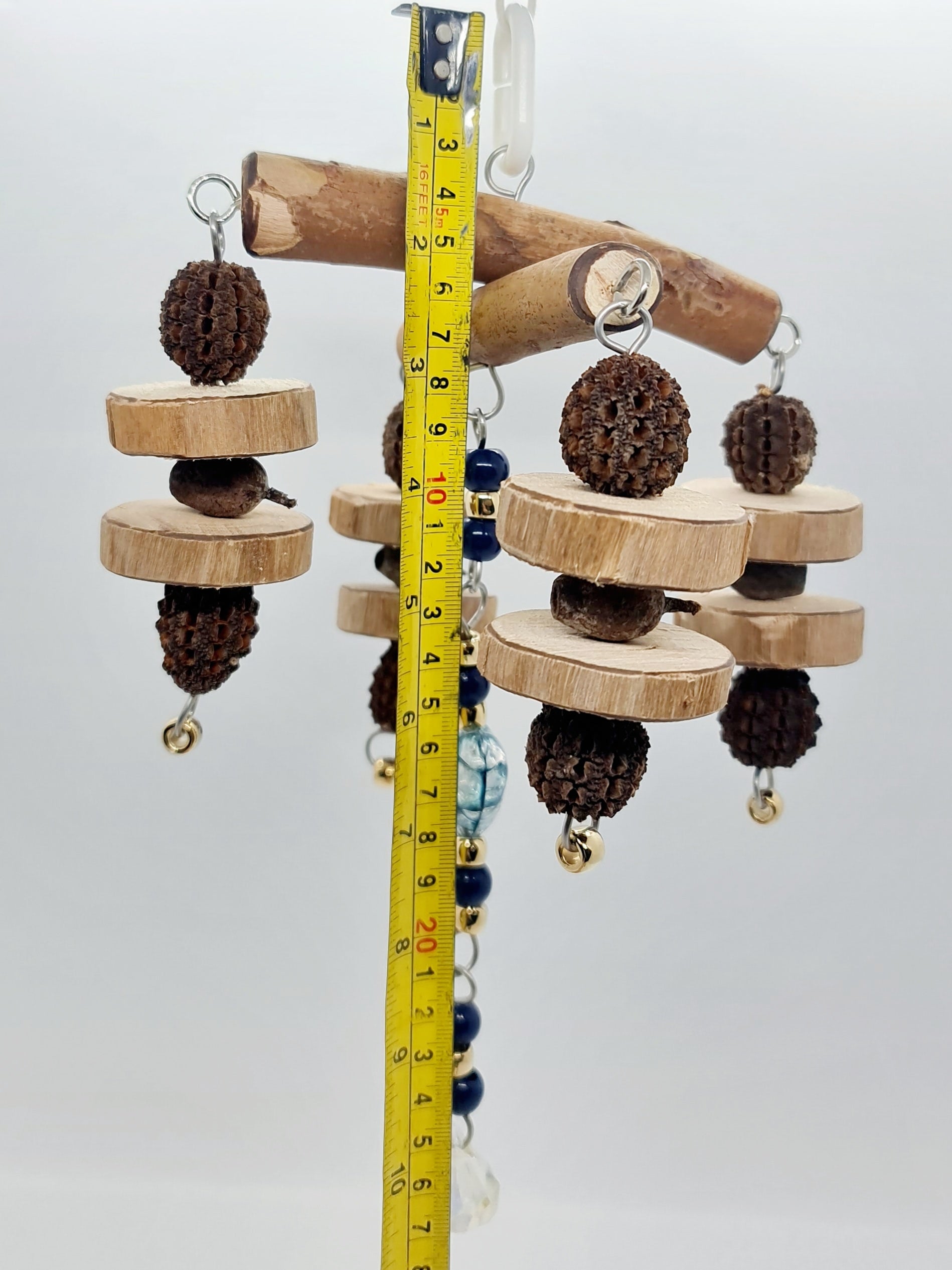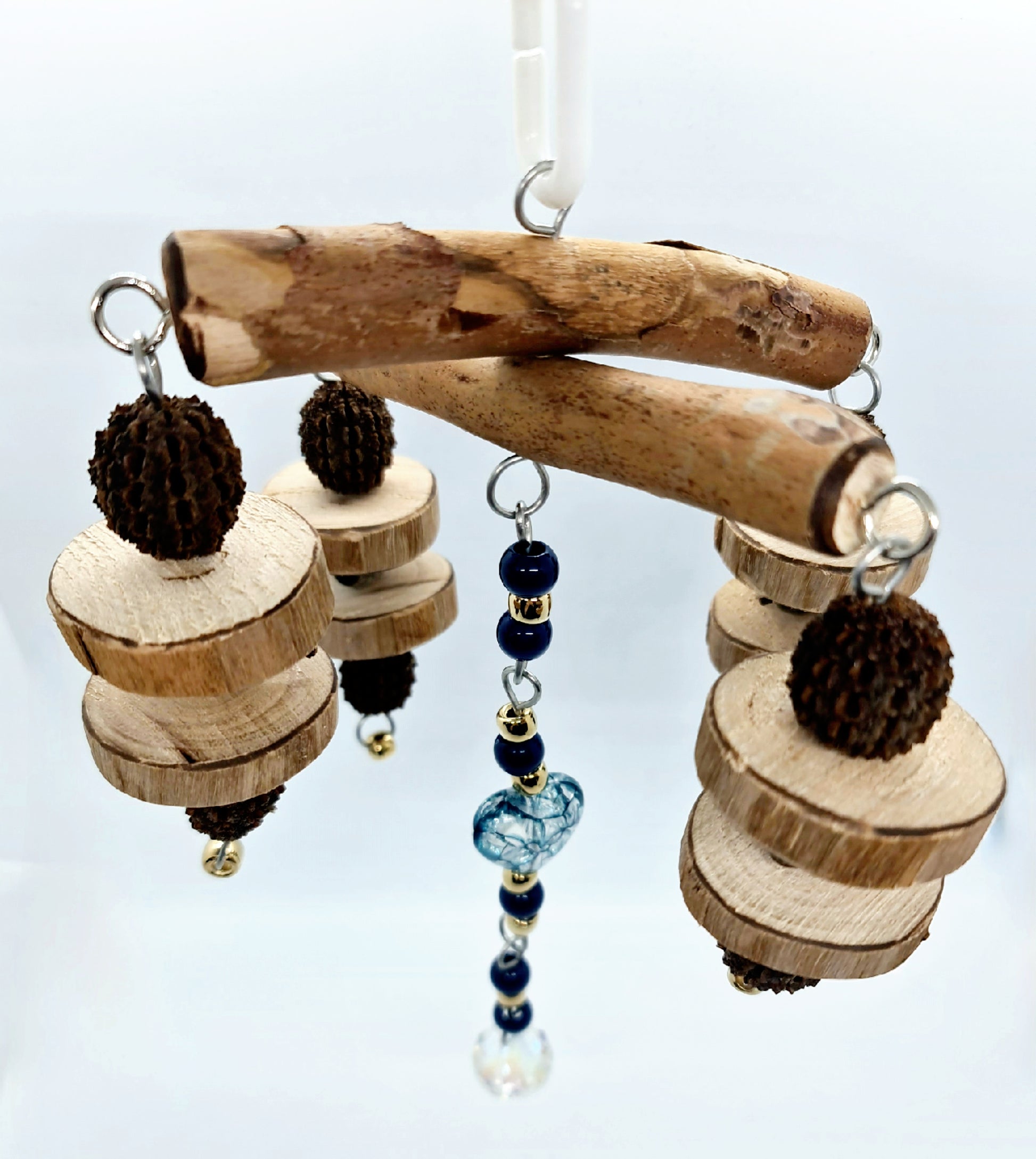 This really cute gone nuts birdie mobile timber toy with it's pretty navy blue and gold colours would make a fun addition to your birdies palace. Hand made from acrylic beads, casuarina nuts, gum nuts, timber sourced from our forest (spotted gum) and stainless steel wire. Measures approximately 27cm long (from hanger clip to base of the acrylic crystal) x 13cm wide.🐦🦜Suitable for very small, small and medium birds.