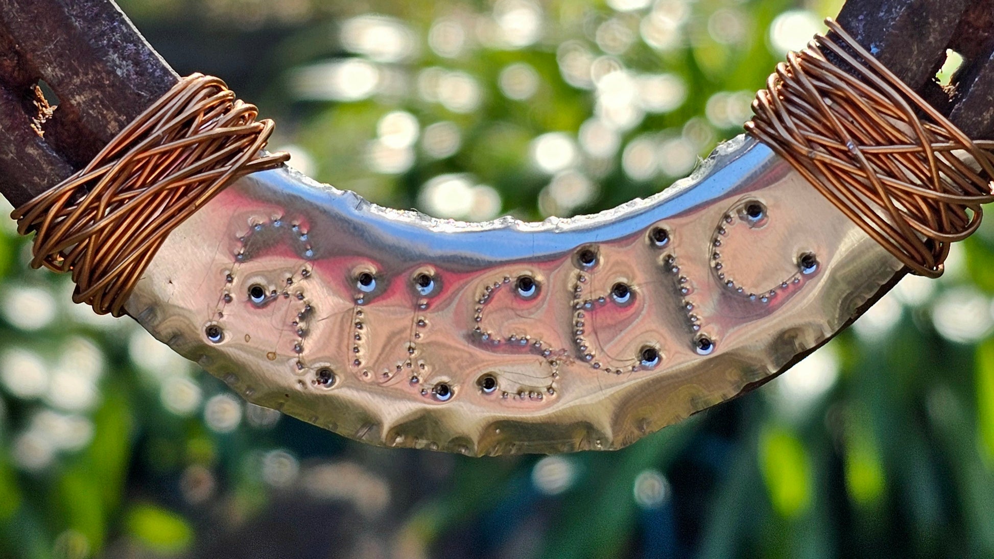 ✨️ Copper wire wrap, embossed aluminium plates, leather strap, joined heart charm