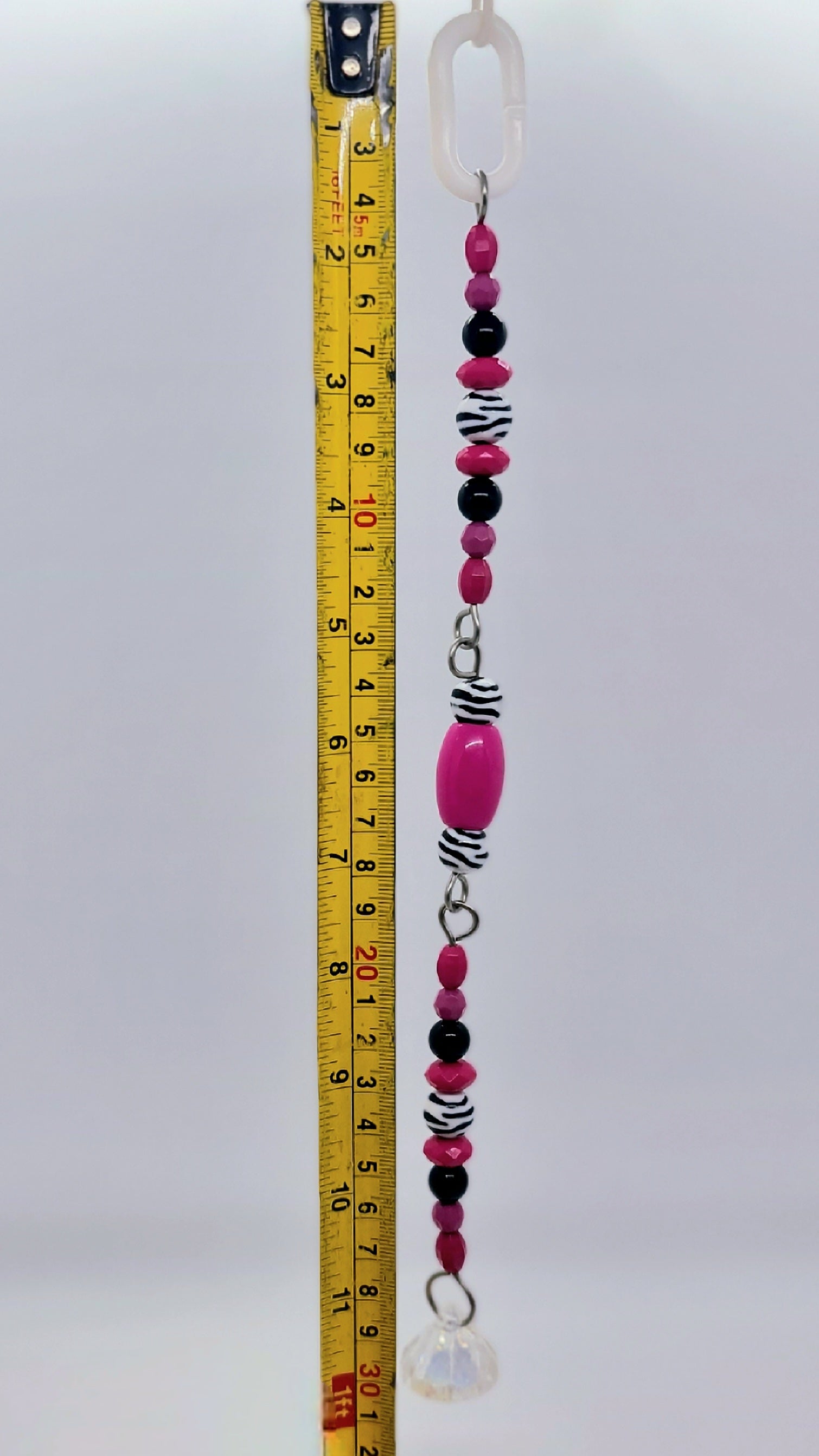 This hot pink and zebra stripes jointed toy is a very funky and fun addition with it's jointed pieces to make a more flexible toy. Hand made using acrylic beads and stainless steel wire with a plastic clip as the hanger. The overall measurement from hanger clip to the acrylic crystals base is approximately 30cm long. 🦜🐦 Suits very small, small and medium birdies.