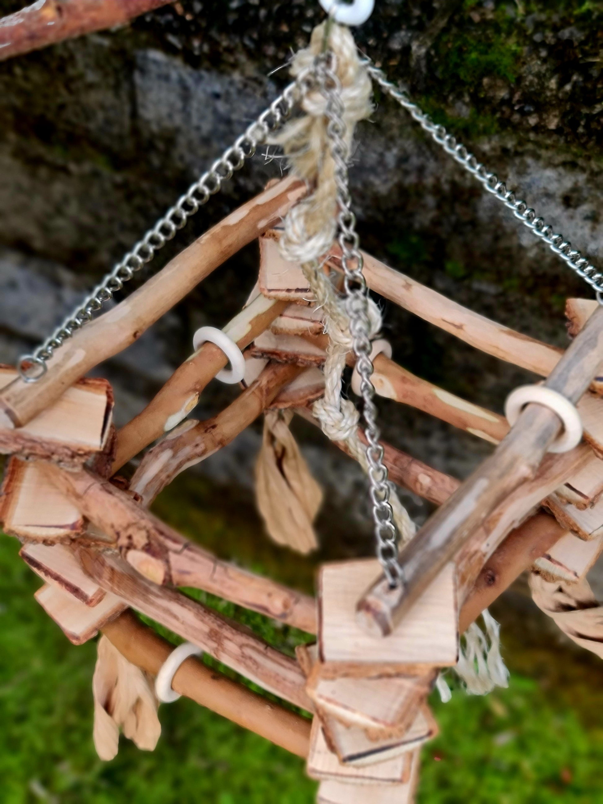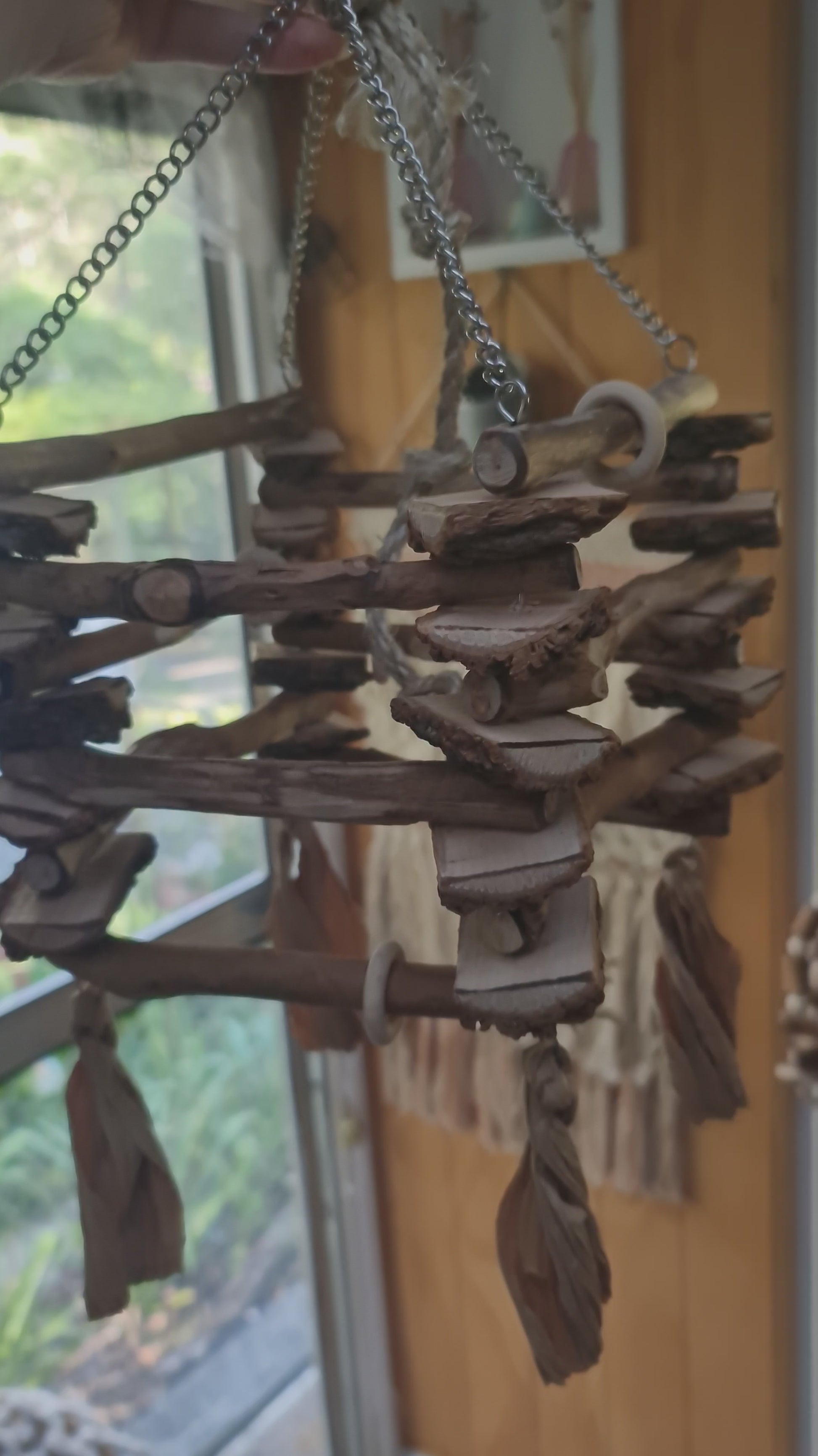 Measures approximately 19cm x 19cm with the overall length from hanger clip to the base of the paper dangles approximately 40cm. Hand made using stainless steel wire, nickel plate chain, timber and a plastic hanger clip🐦🦜 Suitable for small, medium, large and very large birds.
