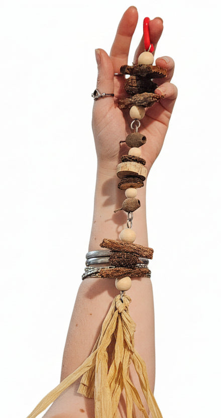Add this dangling all natural toy Little Bits Forest feast with chewy fun to your feathered friends birdie house consisting of gum nuts, casuarina nuts, casuarina bark, and spotted gum centre mini pancake on wriggling jointed stainless steel wire ending with a rafia bottom to shred. 😁 Fun for any birdie🐦 🦜 Hung from a plastic clip.