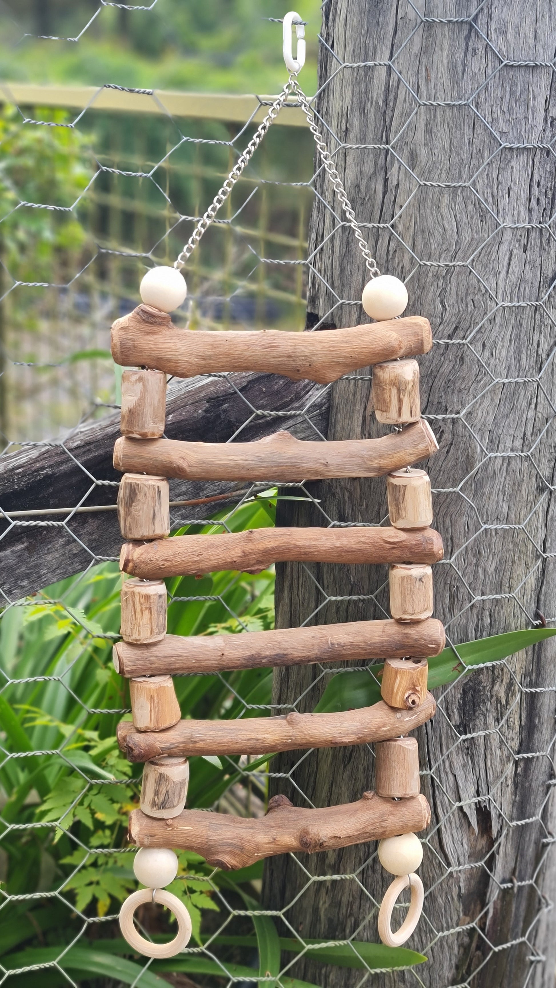 This all timber ladder is a great accessory to your birdies palace, perfect for those that love to climb about. Hand made using our own sourced timber(stringy bark gum) from our very own forest with nickel plate chain. Measures overall approximately 60cm long x 21cm wide. 🦜🐦 Suitable for small to very large birdies.