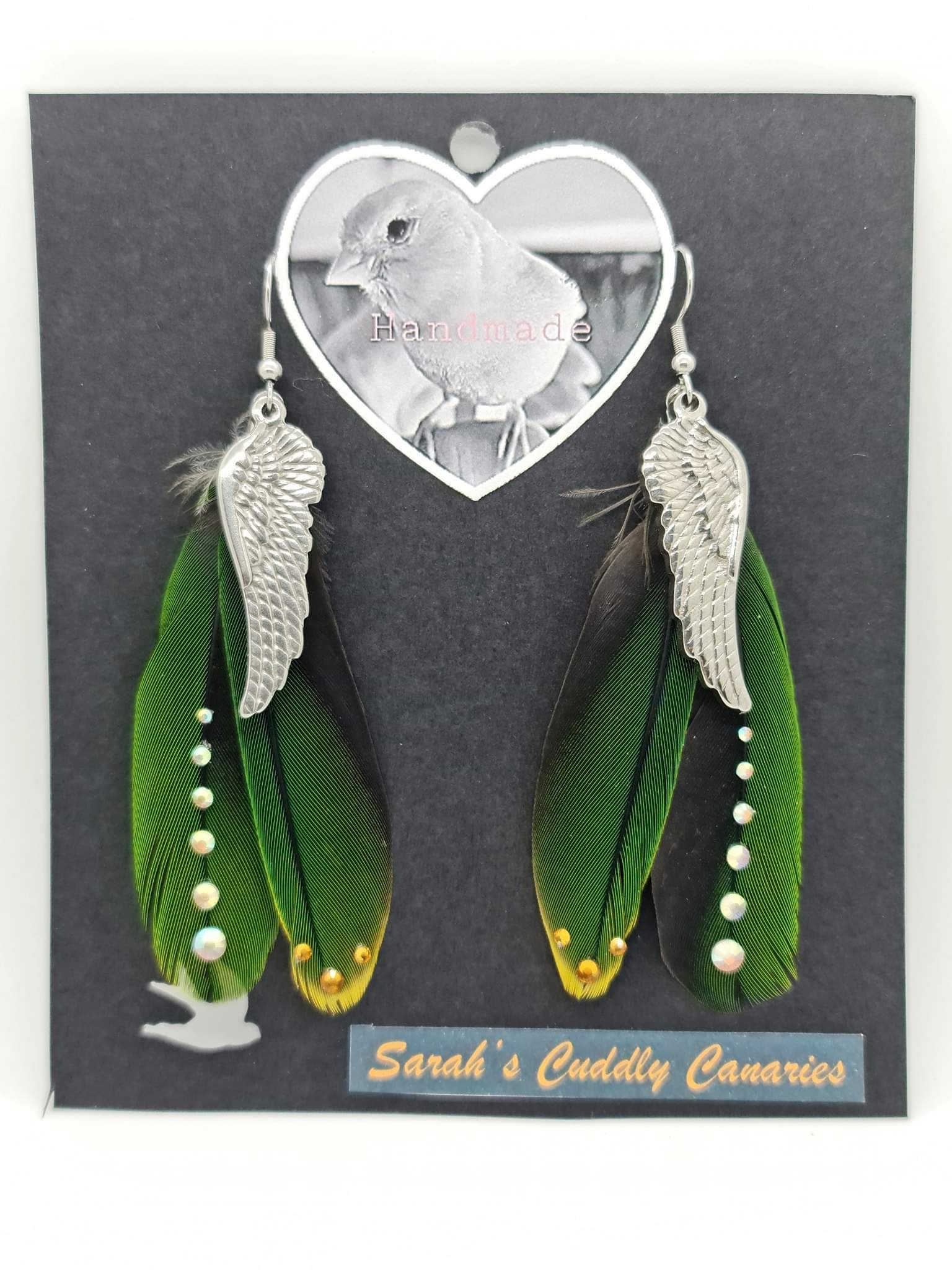 Forest green feathers with a couple of cute yellow tips are from our crazy clown Caique parrot Lulu 😍🦜 With also gorgeous stainless steel angel wings and crystals along each feather 😇 Measures approximately 9cm (from hook to feathers base) x 3cm wide.