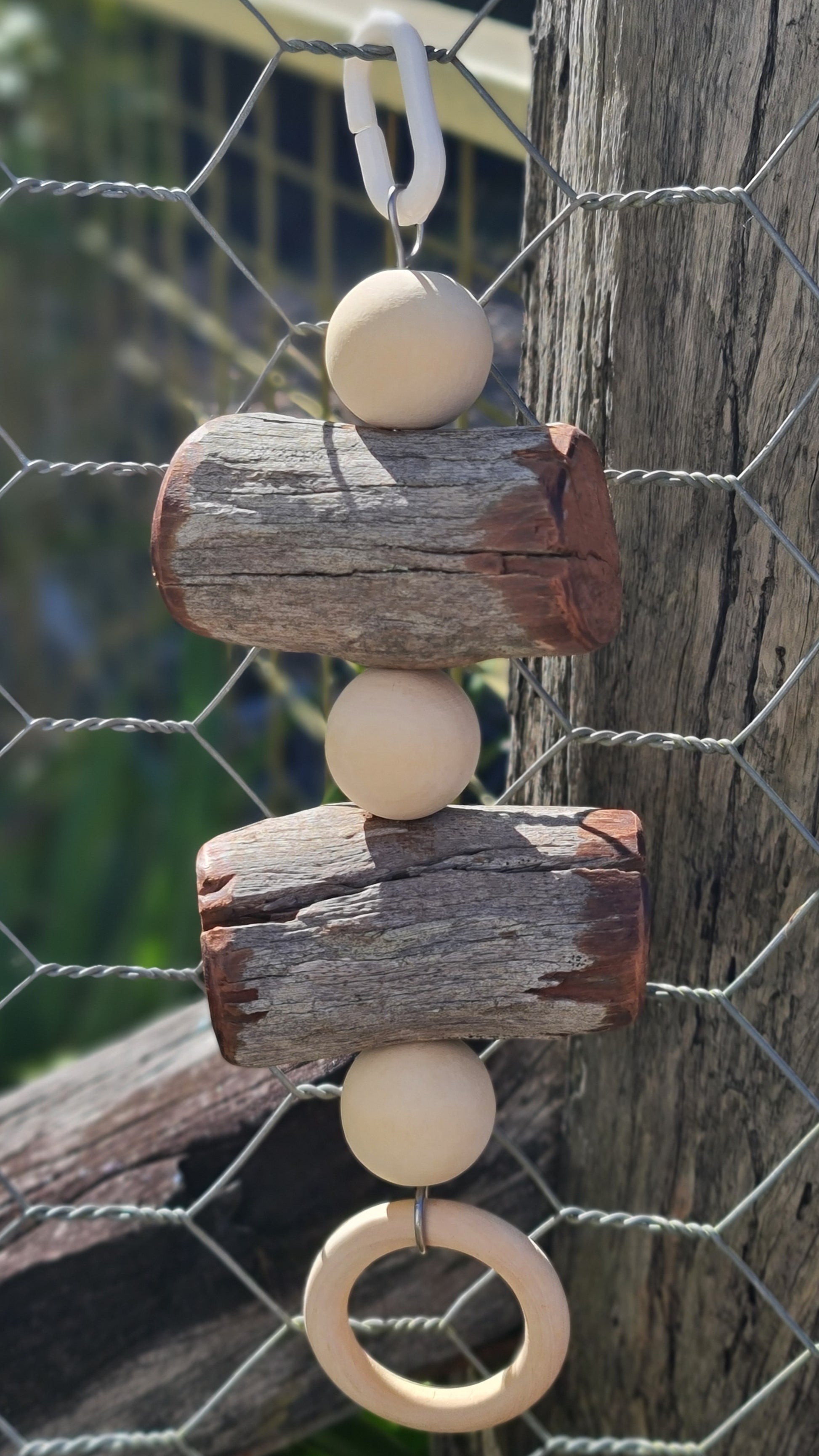 Made using stainless steel wire, wood(ironbark), pine wood beads/ring and a plastic hanger clip🐦🦜 Suitable for medium to very large birdies.(Please note, there may be the slightest variation in timber size and colour due to this toy being a recreatable one, however it's approximate length and style will ramain the same ☺️)