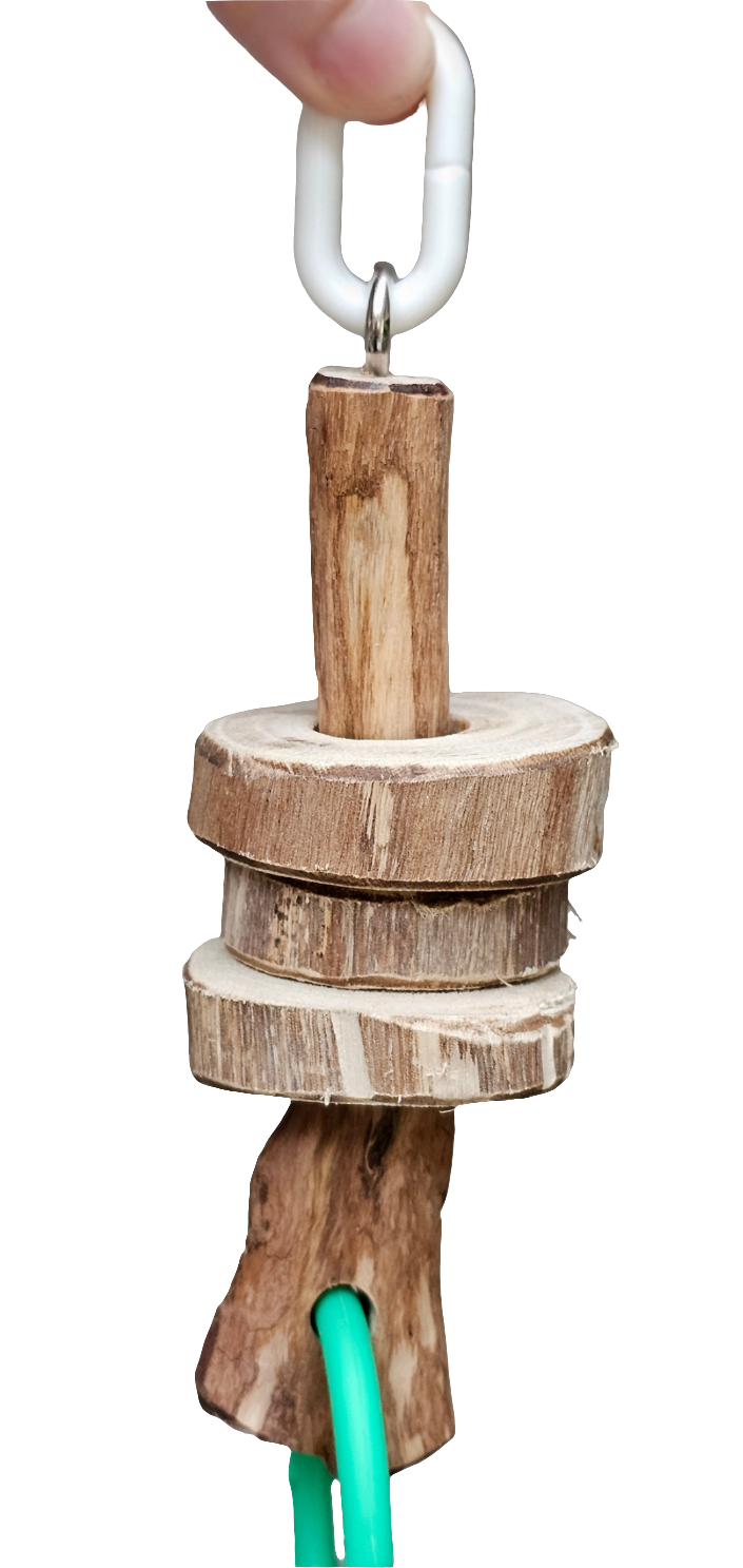 "Get ready for some quirky playtime fun with our Moving Pancakes & Links Toy! Made from spotted gum sourced from our forest, this handmade toy features 3 movable pancake-style pieces and 3 colorful plastic rings for your birdie to pull or even sit in if they are little 🥰 Created using spotted gum timber, nickel plate screw eye and plastic rings/hanger clip. Suitable for birds of all sizes, measuring approximately 29cm in length, this toy is a playful addition to any bird's toy collection." 🦜🐦