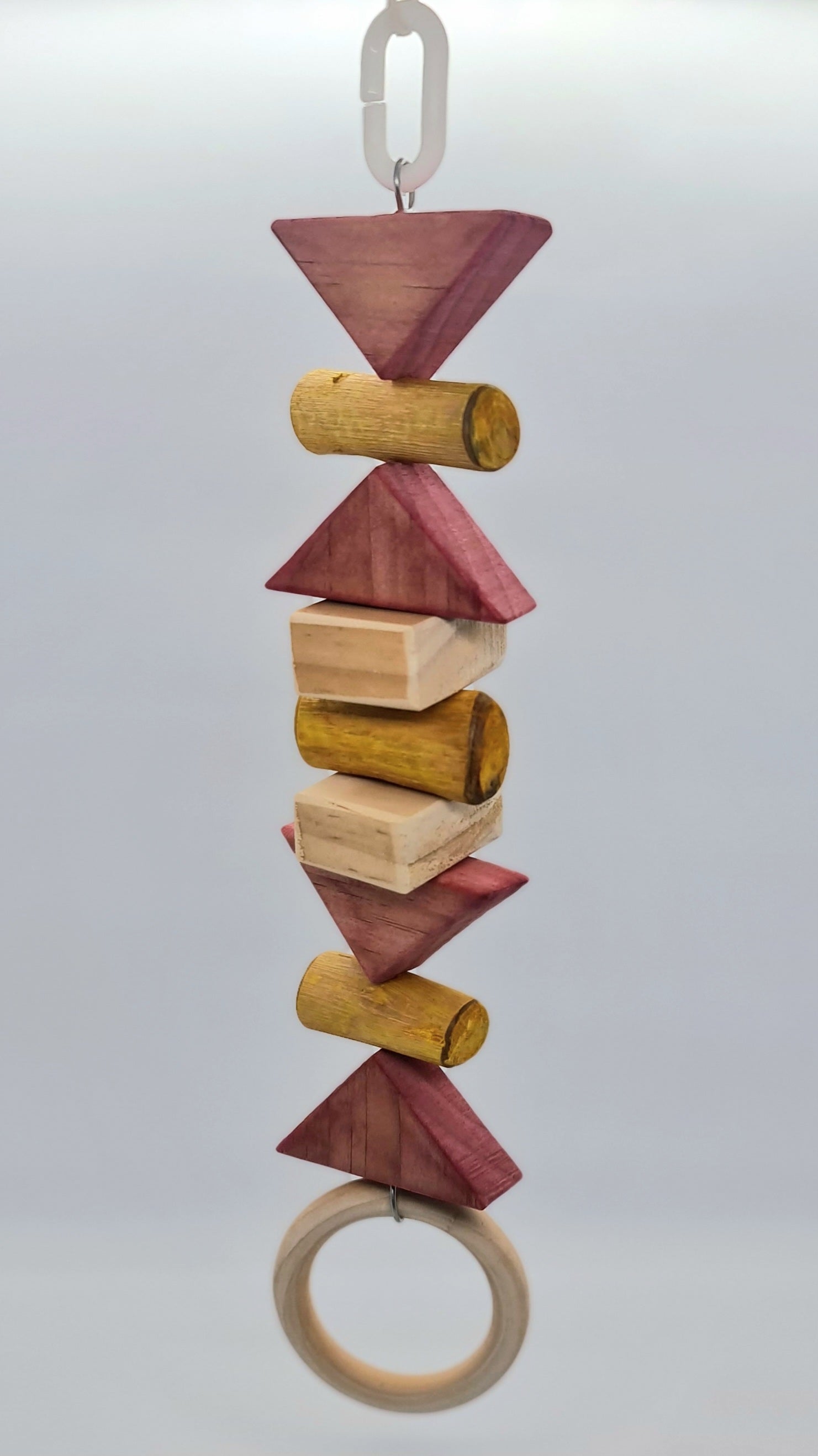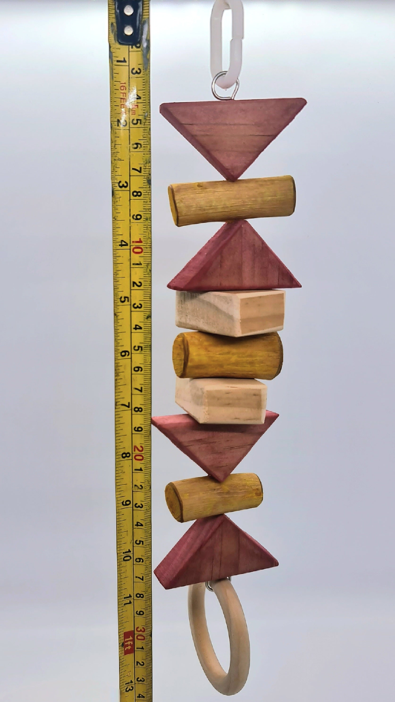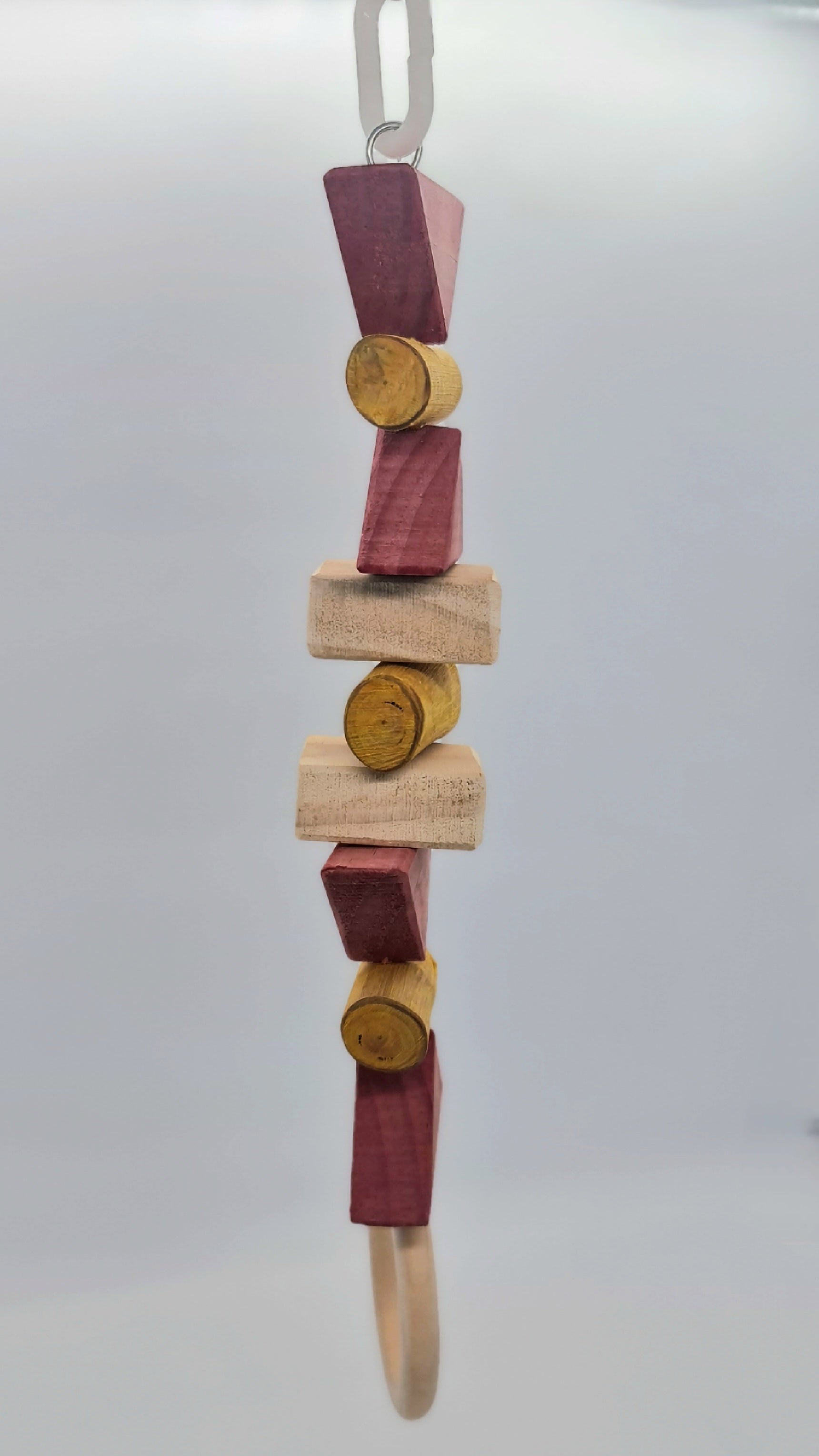 Made using stainless steel wire, wood(spotted gum/pine), pine ring and a plastic hanger clipSuitable for small, medium, large and very large birds. 🦜🐦 Please note that your timber toy may start splitting/cracking/shrinking in areas as it continues to dry out since it has been freshly harvested from our forest, however this should not affect your birdies play time and fun with this toy 😁