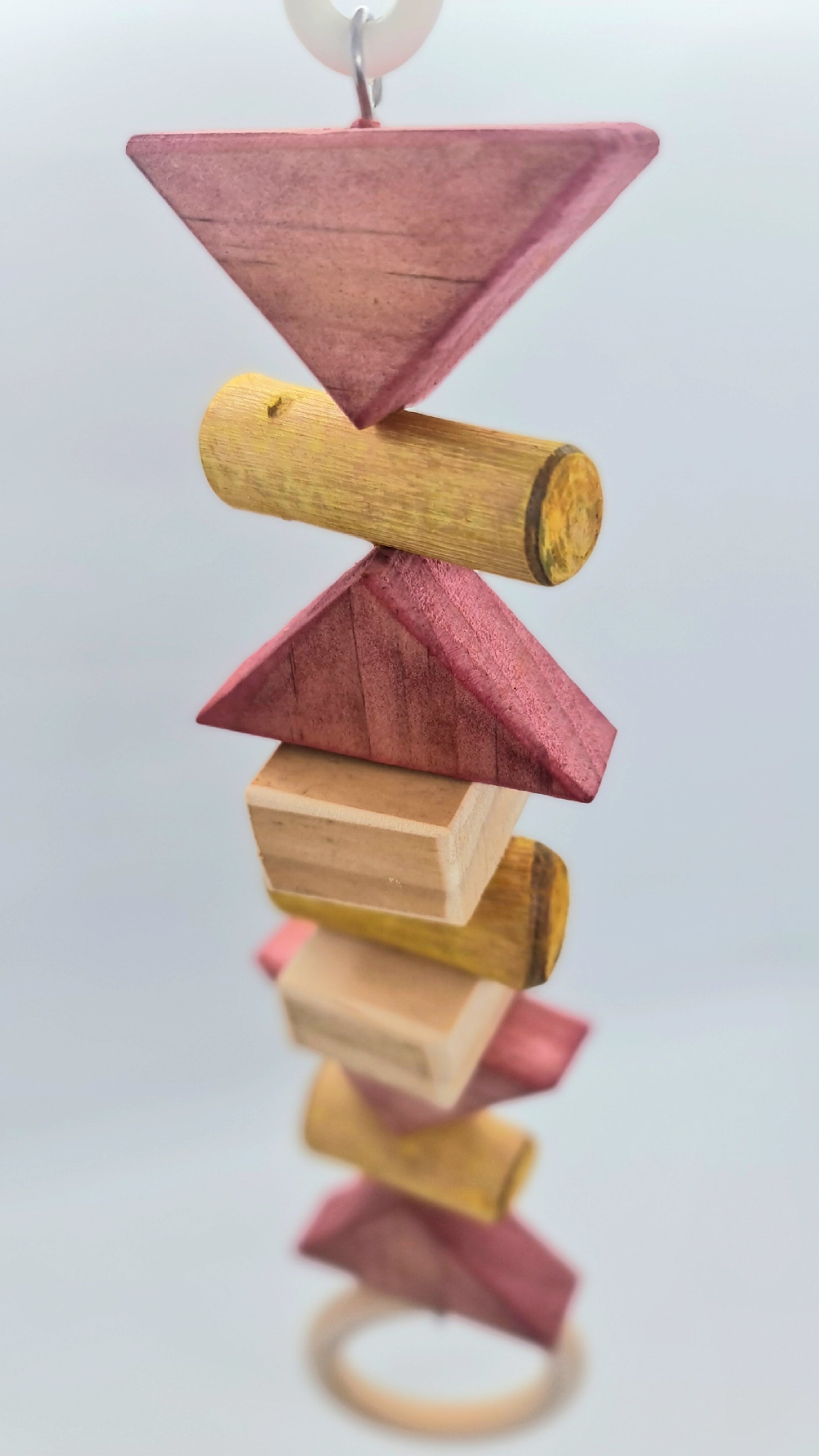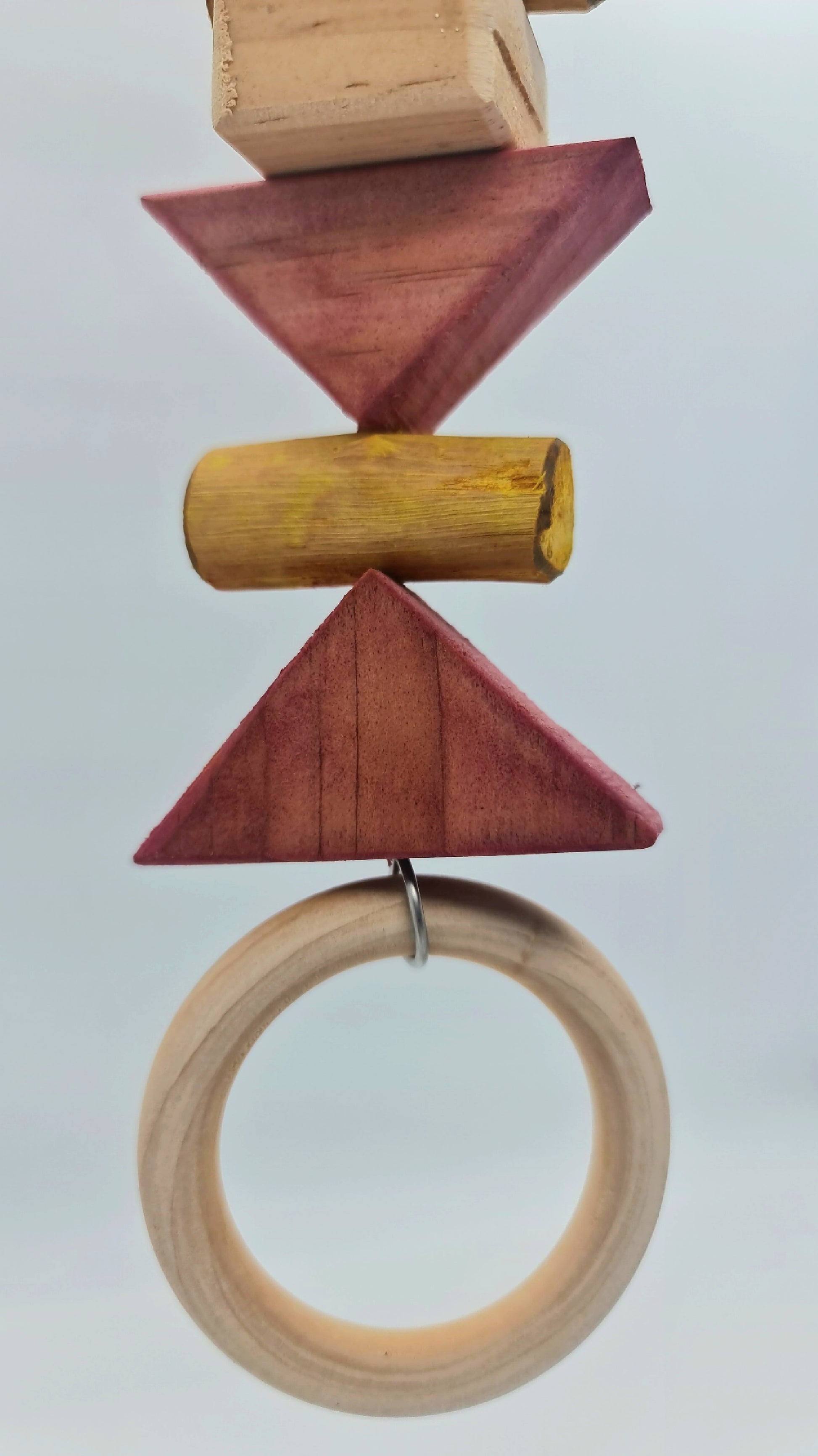 With an all natural element, this shapes timber kebab is super shreddable. Hand made using timber pieces dyed in natural colours from turmeric and beetroot. Measures overall approximately 34cm.