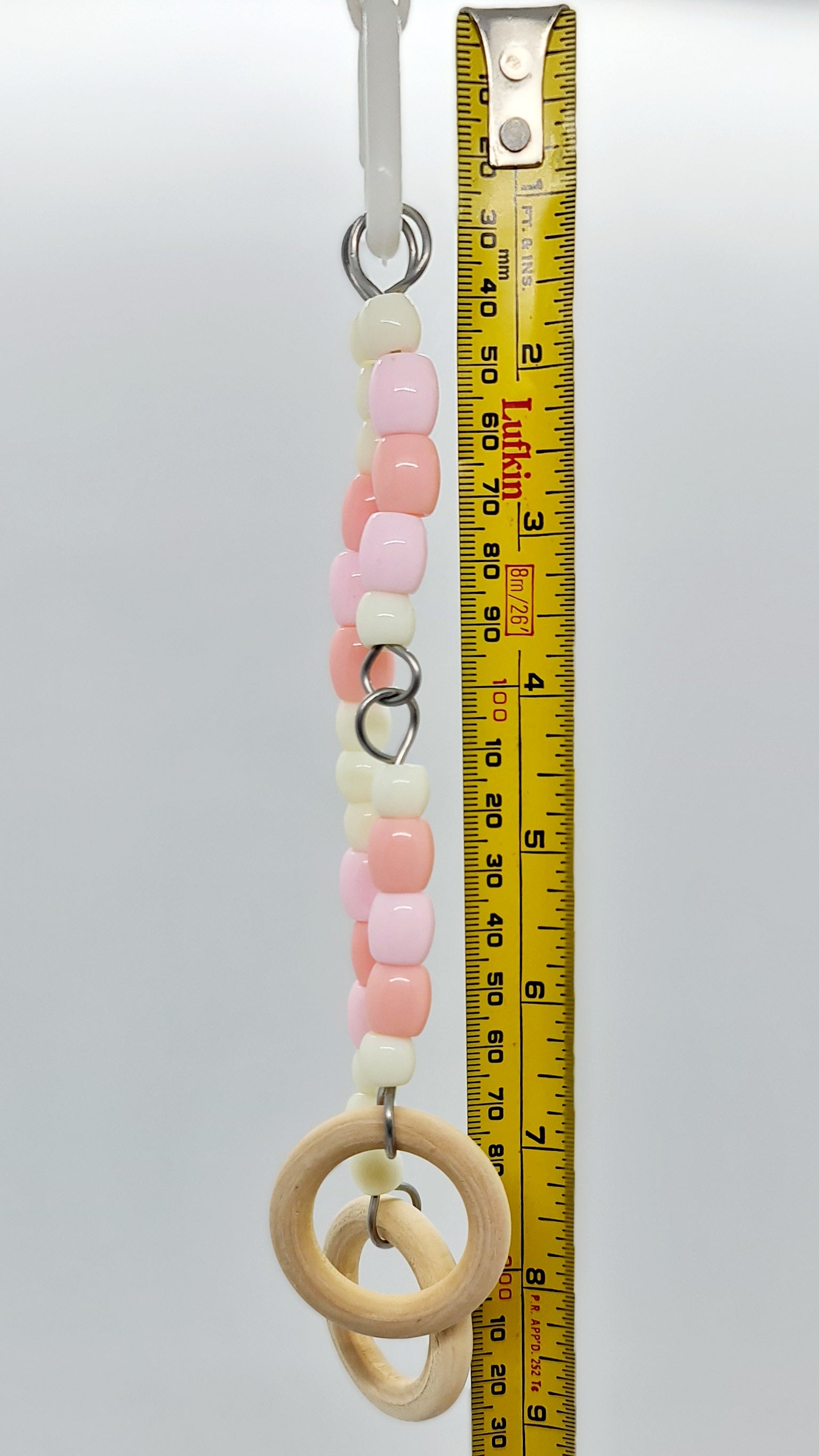 A very pretty piece to add to your birdies palace, this ombre pink and cream double strand toy is hand made using acrylic beads, pine wood rings and stainless steel wire. The overall measurement from hanger clip to the base of the acrylic hearts is approximately 22.5cm long. 🦜🐦 Suitable for very small, small and medium birds.