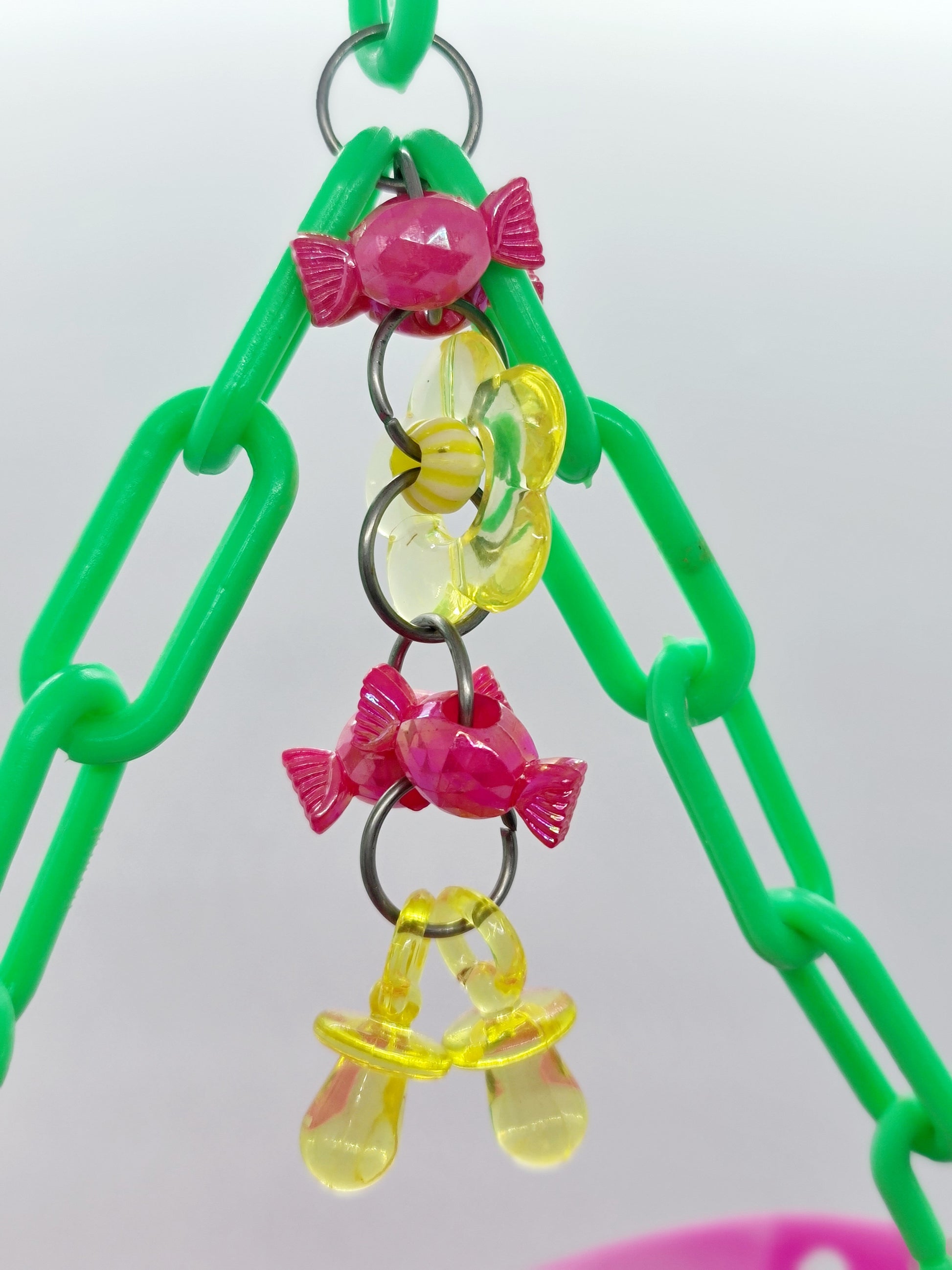 'Oval Rainbow Bowl' toy, hand made from acrylic beads and stainless steel wire. Great for a bath, seed/treat bowl or even a toy bowl. Overall measures approximately 25cm long (from hanger clip to bottom), bucket measures 15cm long x 10cm wide x 6cm deep.🦜🐦 Suitable for very small to small birds.