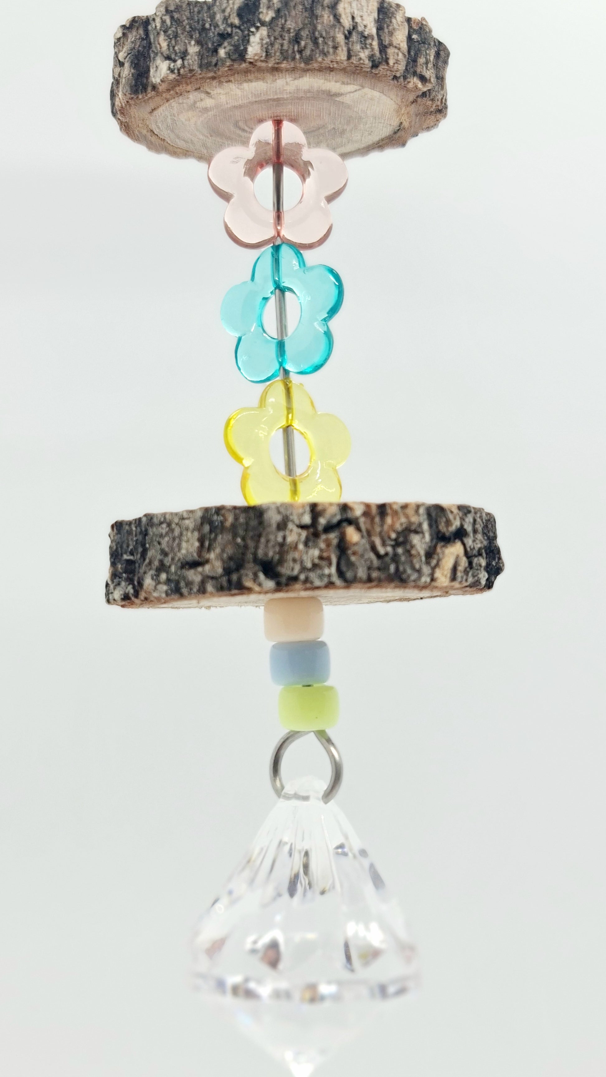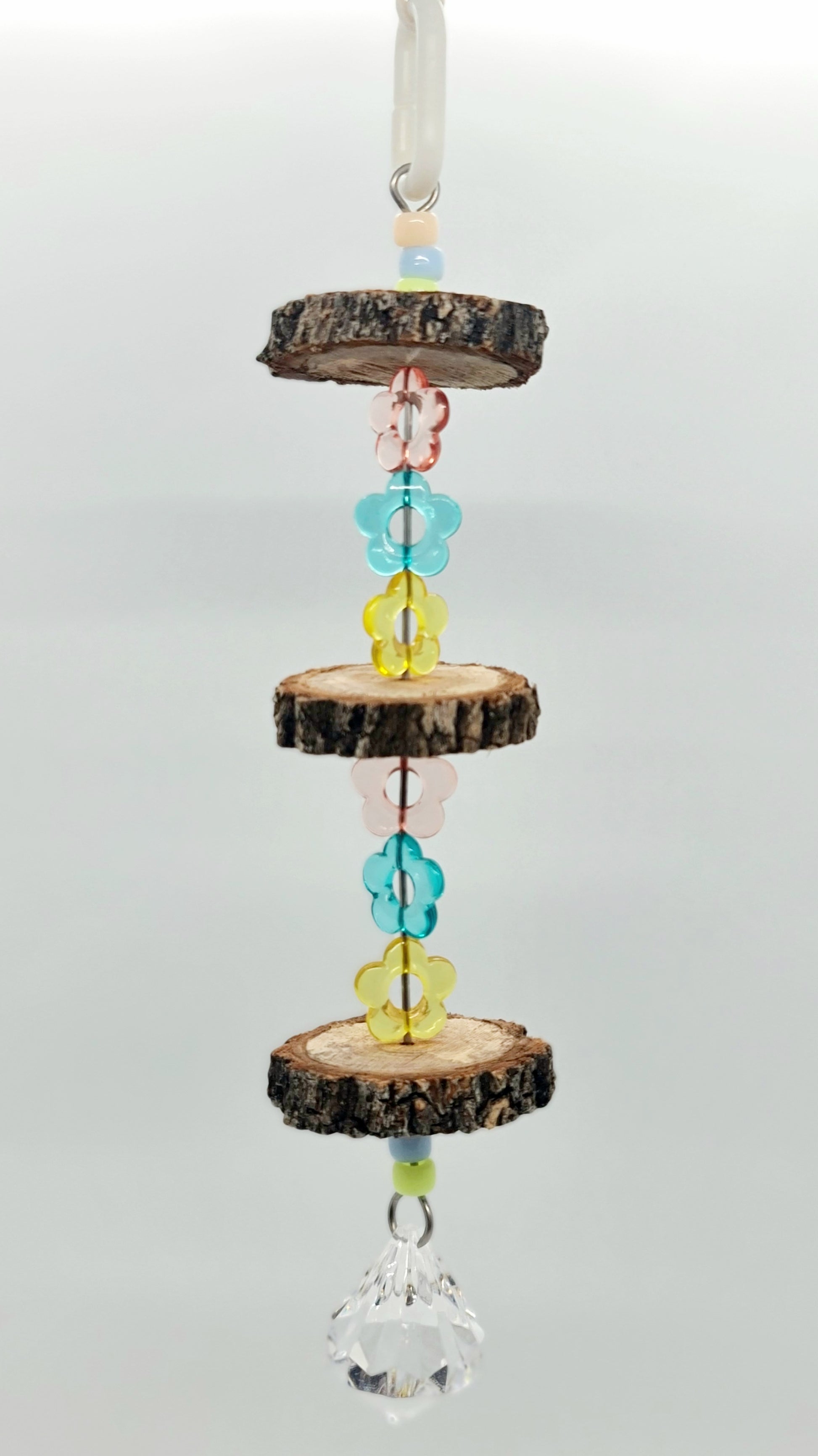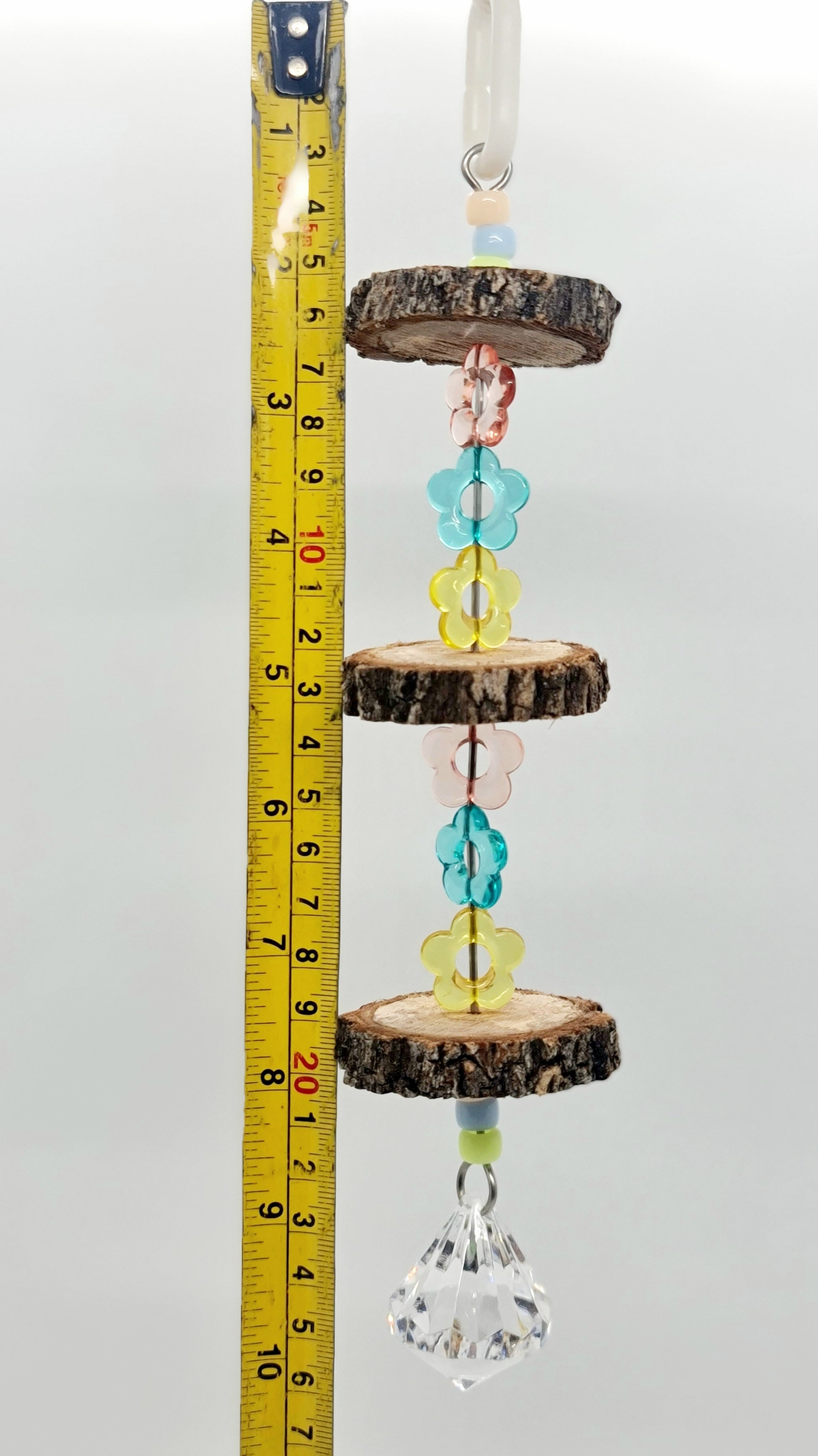 A fun shredder the pancake sliced timber flower toy has been created using pancake cut style slices of timber from our iron bark trees and threaded onto stainless steel wire. Hand made using timber, acrylic beads, stainless steel wire and a plastic clip as the hanger. The overall measurement from hanger clip to the acrylic crystal base is approximately 26cm long. 🦜🐦 Suits very small, small and medium birdies 🤩 Please note that your timber toy may start splitting/cracking/shrinking in areas as it continues to dry out since it has been freshly harvested from our forest, however this should not affect your birdies play time and fun with this toy 😁