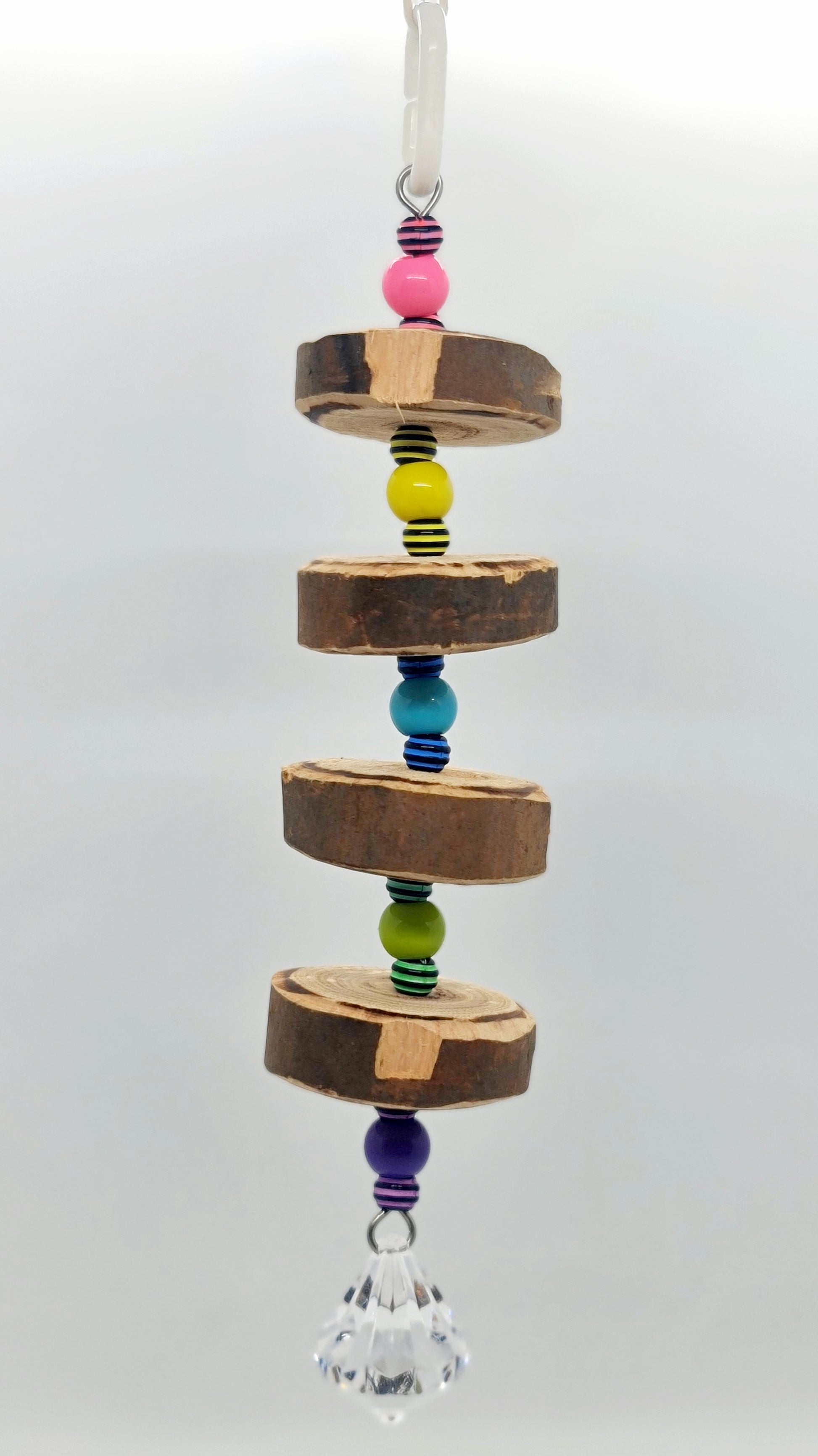 A fun shredder the pancake sliced timber rainbow stripes toy has been created using pancake cut style slices of timber from our spotted gum trees and threaded onto stainless steel wire. Hand made using timber, acrylic beads, stainless steel wire and a plastic clip as the hanger. The overall measurement from hanger clip to the acrylic crystalΒ base is approximately 26cm long. π¦π¦ Suits very small, small and medium birdies π€© Please note that your timber toy may start splitting/cracking/shrinking in areas as it continues to dry out since it has been freshly harvested from our forest, however this should not affect your birdies play time and fun with this toy π