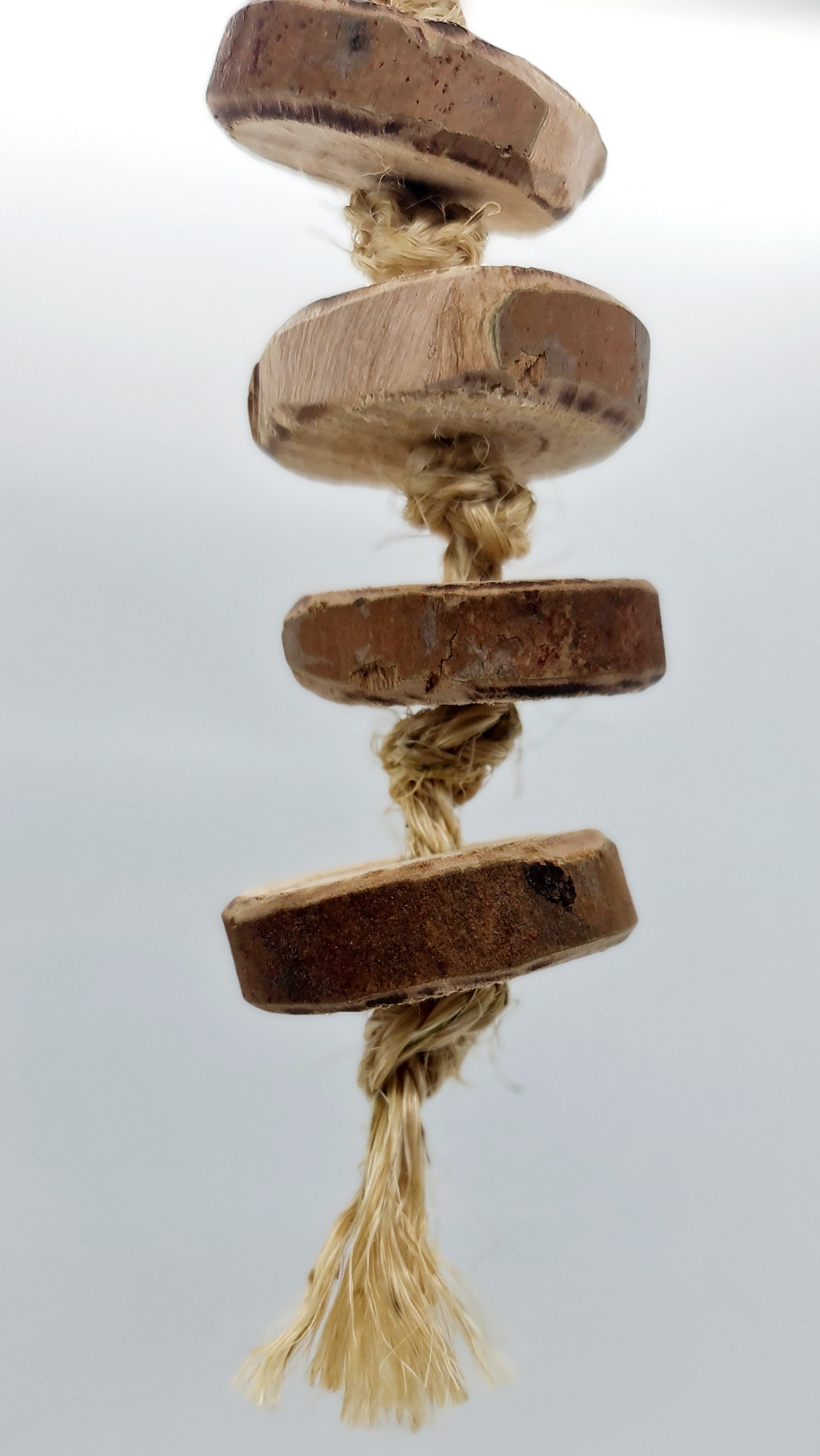 A fun shredder the pancake sliced timber rope toy has been created using pancake cut style slices of timber from our spotted gum trees and threaded onto sisal rope. Hand made using timber, sisal rope and a plastic clip as the hanger. The overall measurement from hanger clip to the rope base is approximately 23cm long. 🦜🐦 Suits small, medium and large birdies 🤩 Please note that your timber toy may start splitting/cracking/shrinking in areas as it continues to dry out since it has been freshly harvested from our forest, however this should not affect your birdies play time and fun with this toy 😁
