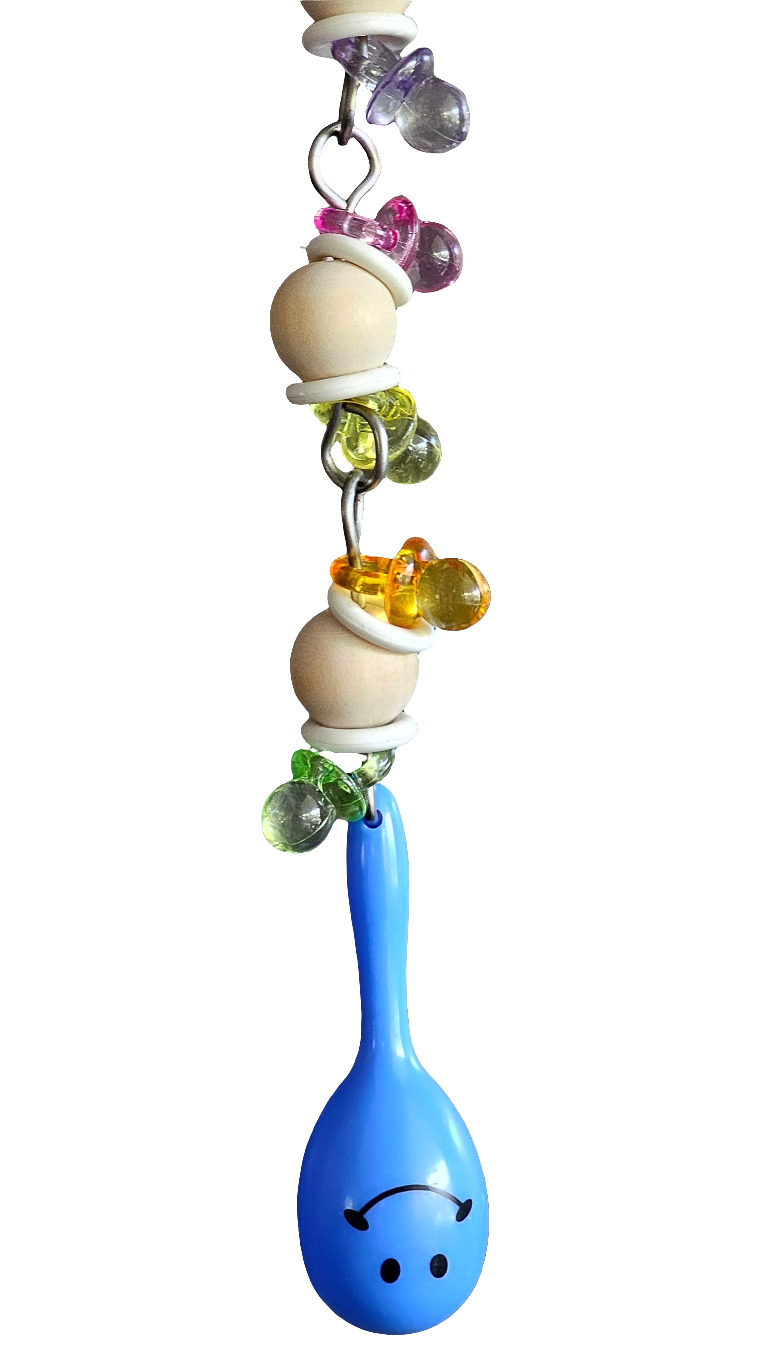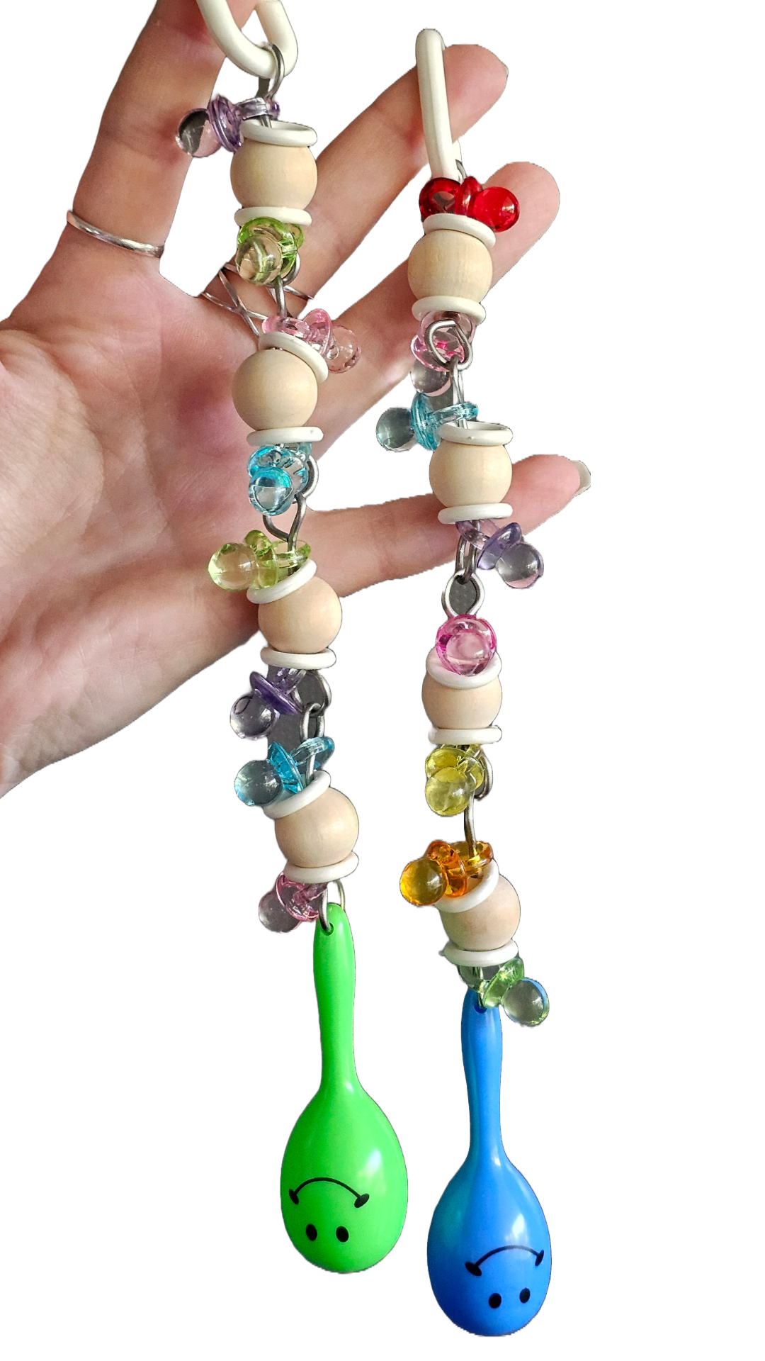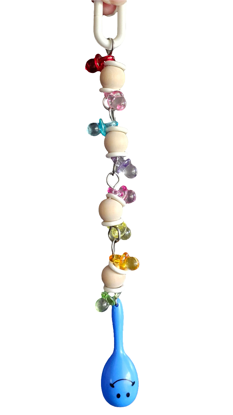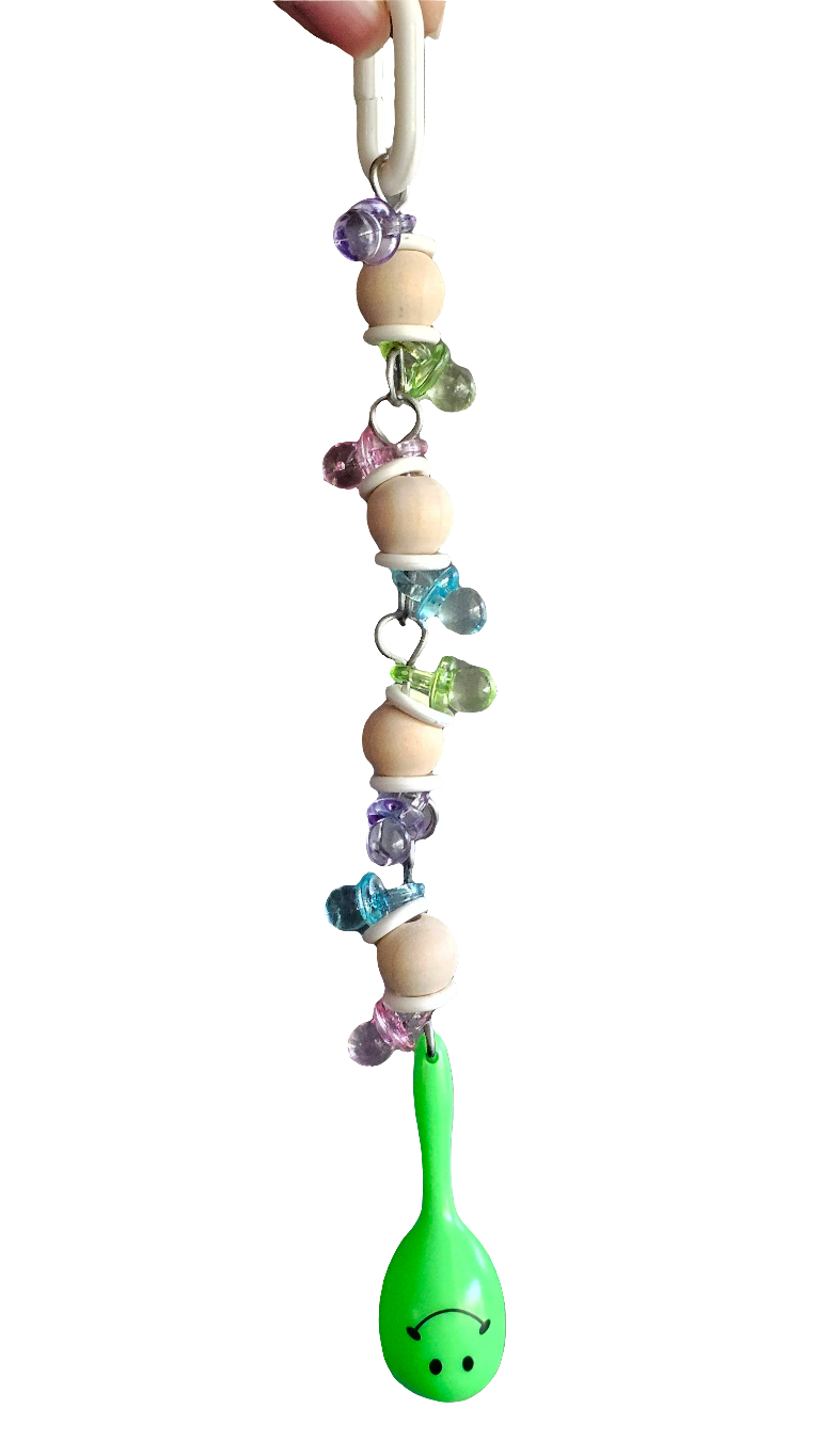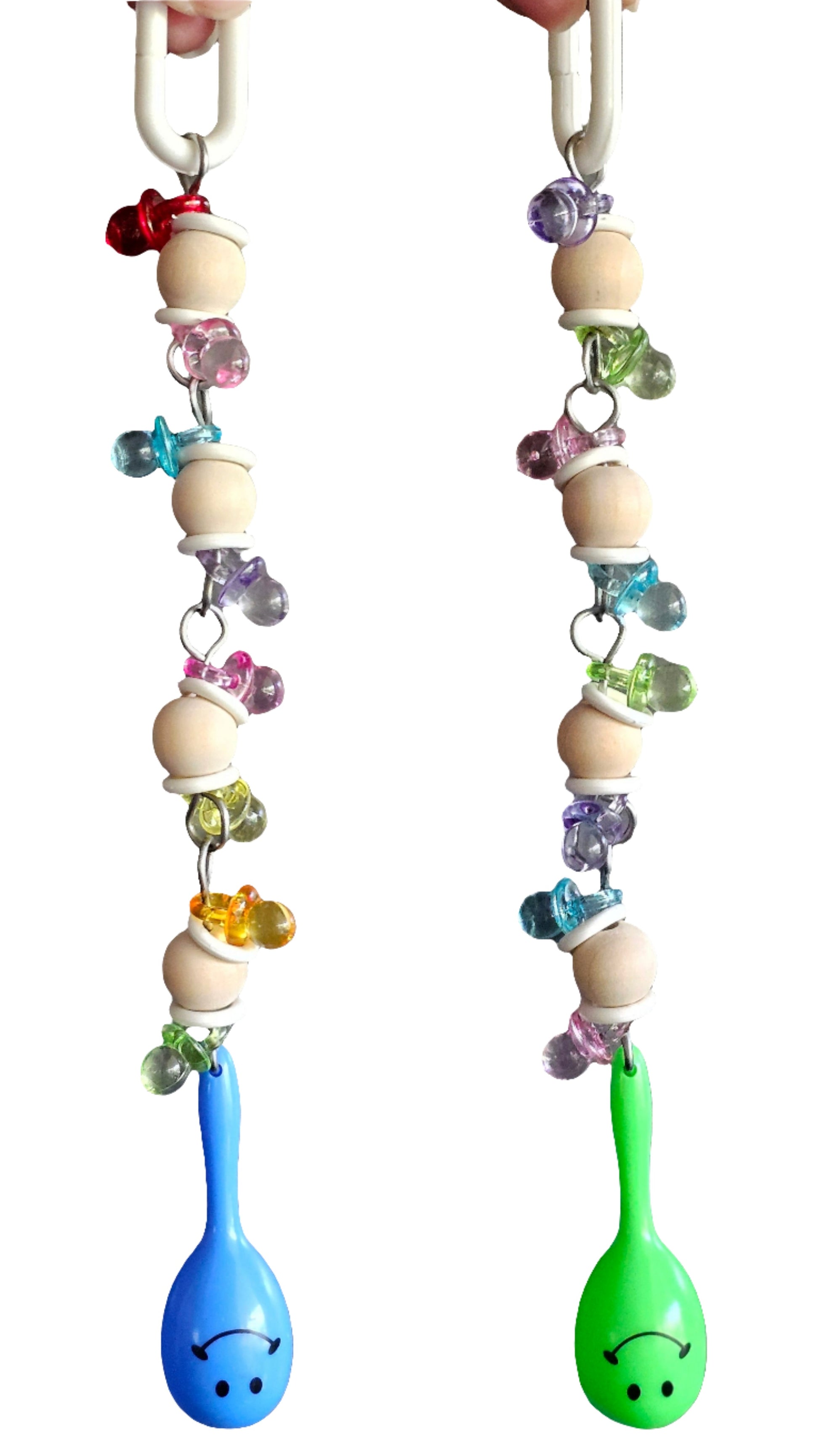 This rattler toy is a very funky and fun addition with it's jointed pieces to make a more flexible toy, fun rattly sounds and the bright maraca, available in 2 colour options. Hand made using acrylic beads, pine timber beads and stainless steel wire with a plastic clip as the hanger. The overall measurement from hanger clip to the maraca is approximately 26cm long. 🦜🐦 Suits very small, small and medium birdies.