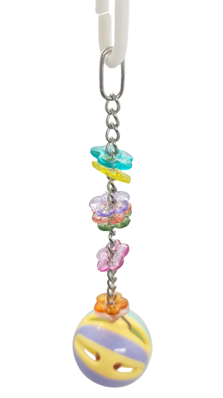 Entertain your birdie with the rattle ball chain toy. Featuring a pastel ball with a bell inside (safe plastic type should your birdie make his/her way into the ball) and pretty acrylic flower beads to move up and down the chain. Handmade with a nickel-plated chain, acrylic beads, rattly ball measuring 4.8cm and plastic hanger clip. Total length measures approximately 21cm 🦜🐦 Suits very small, small and medium birdies 🤩 Please note that your timber toy may start splitting/cracking/shrinking in areas as it continues to dry out since it has been freshly harvested from our forest, however this should not affect your birdies play time and fun with this toy 😁