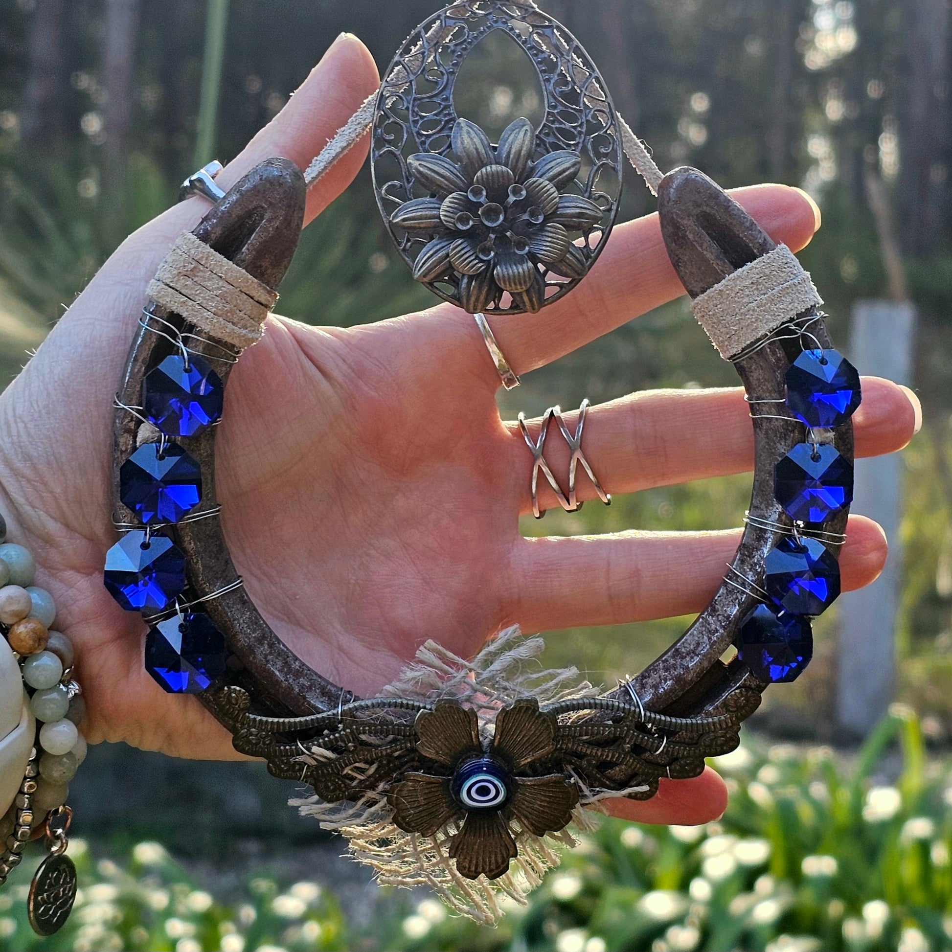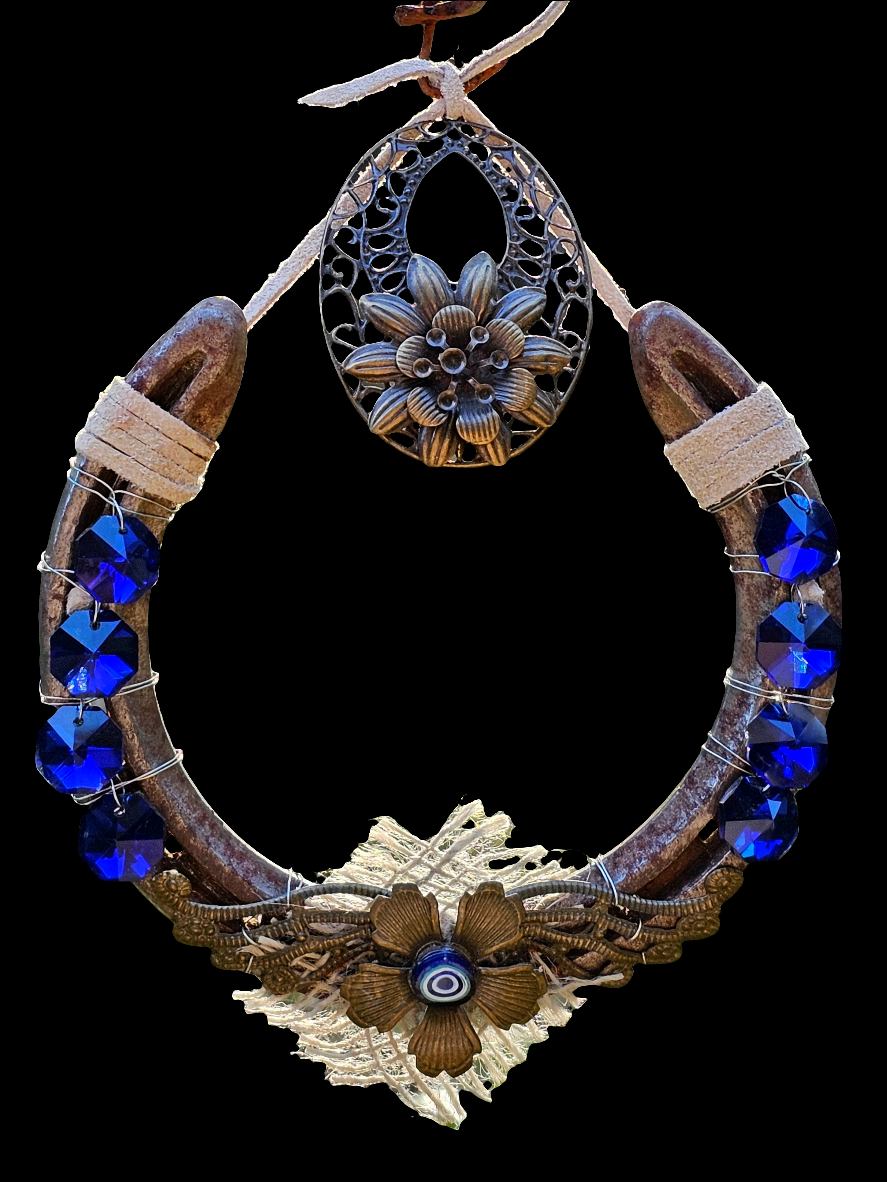 Horseshoes have long been cherished as symbols of good luck and protection, while the evil eye bead, also known as “nazar,” is used in many cultures to protect against ill intent or jealousy. Combined with blue crystals (often linked to protection, intuition, and calm), together this piece becomes a powerful guardian and decorative charm for any space.