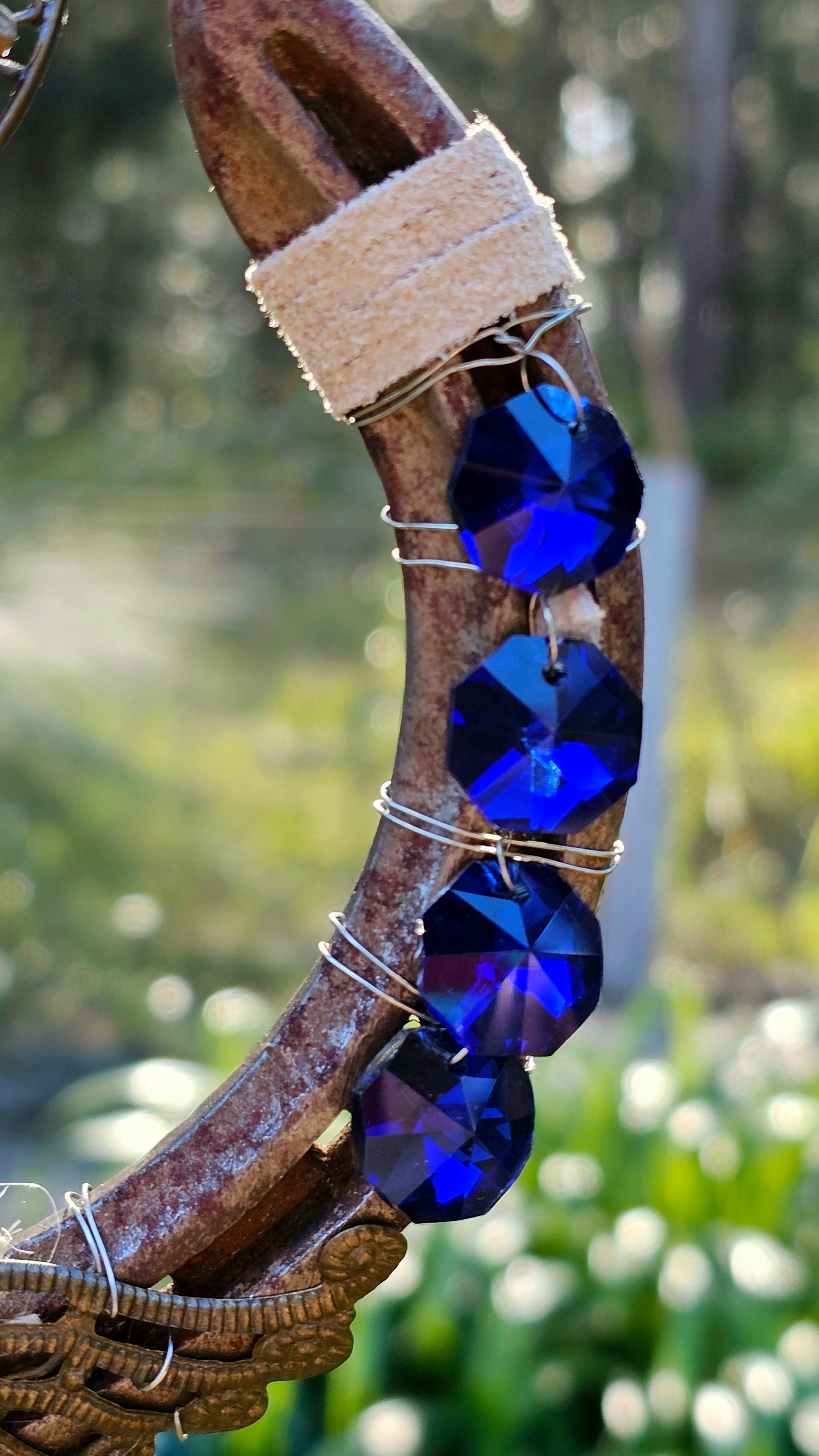 Wrapped with pale grey suede and adorned with faceted sapphire-blue crystals, this reclaimed iron horseshoe radiates rich, royal tones. The ornate bronze-tone medallion and detailed floral accents add a vintage, heirloom feel — making it as meaningful as it is decorative.