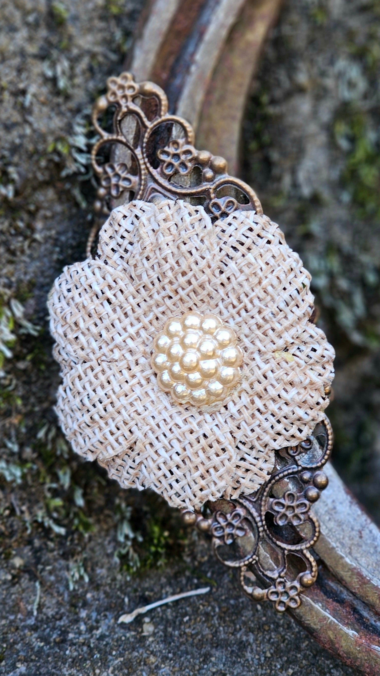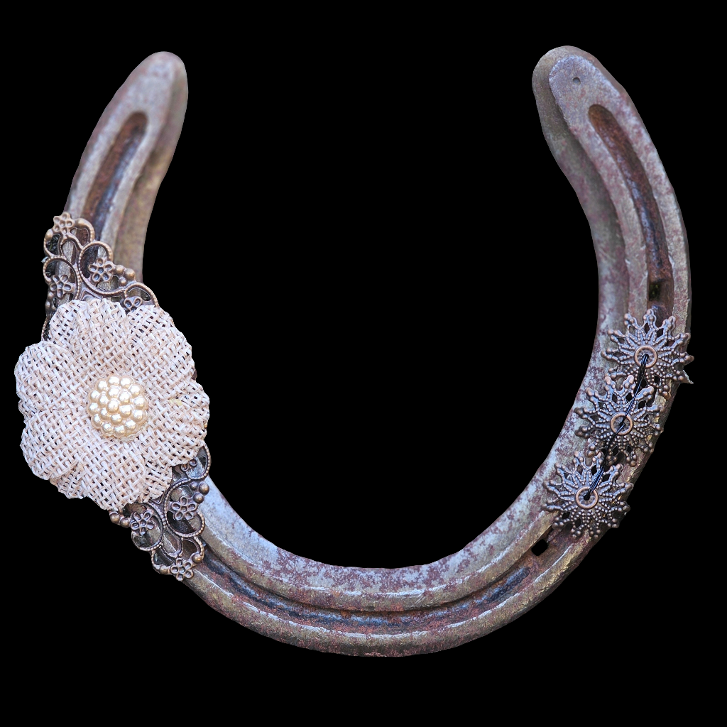 Crafted from a reclaimed, weathered iron horseshoe, this piece is designed to sit beautifully on a shelf, mantel, or windowsill. One side features a delicate antique bronze coloured metal filigree topped with a soft beige burlap flower 🏵, while the other is accented with three miniature antique bronze coloured conchos, adding a subtle western flair 🐎