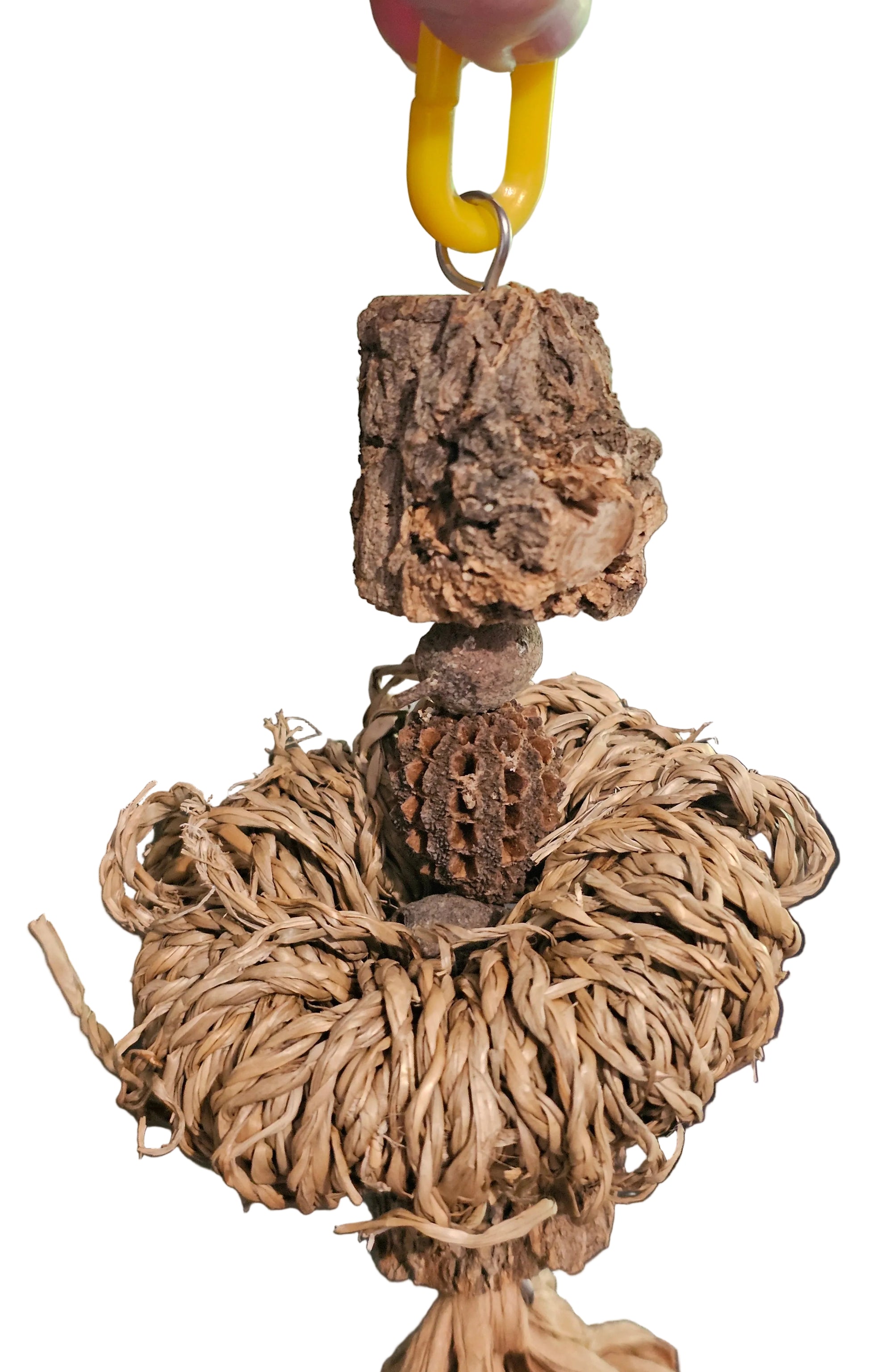This will fulfill every birdies dream with their very own donut (safe for birds version) "Seagrass Donut Toy" and have them busy for quite a while 🤩 With 2 casuarina mini logs, casuarina nut with 2 gum nuts either side. Then the best part, the pine ring wrapped in seagrass imitating a cinnamon donut that in time they can remove to their delight as a foot toy 🥯 they have watched us consume many a donut, so now its their turn haha 😁 This is threaded onto stainless steel wire with rafia at the bottom and hung from a plastic clip.
