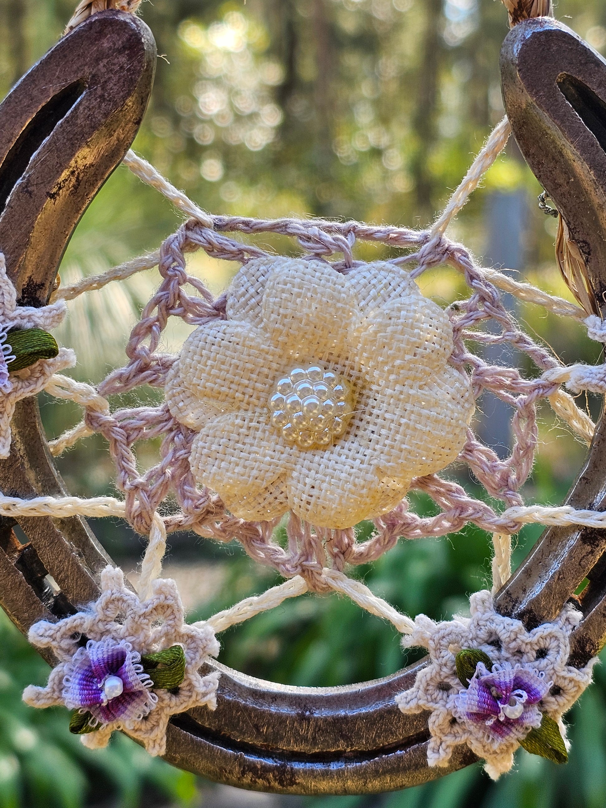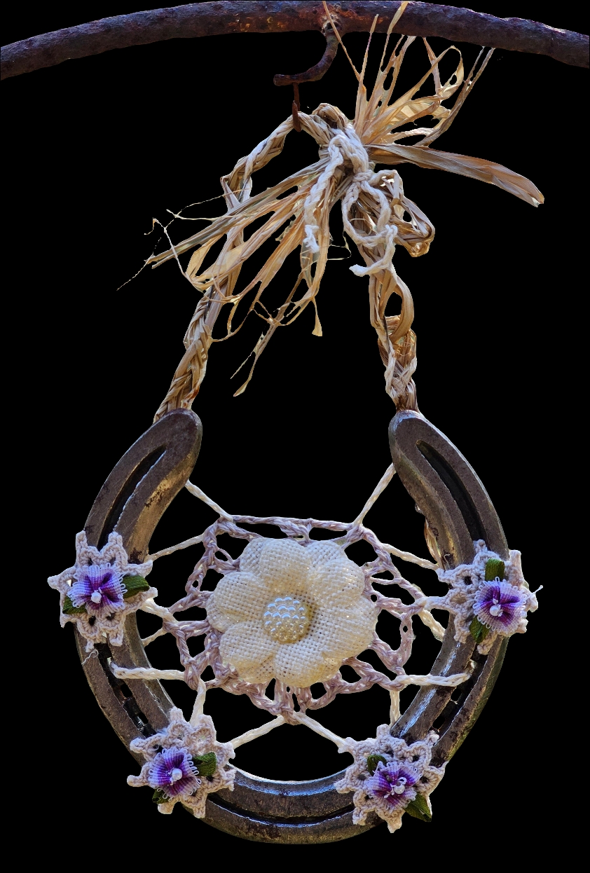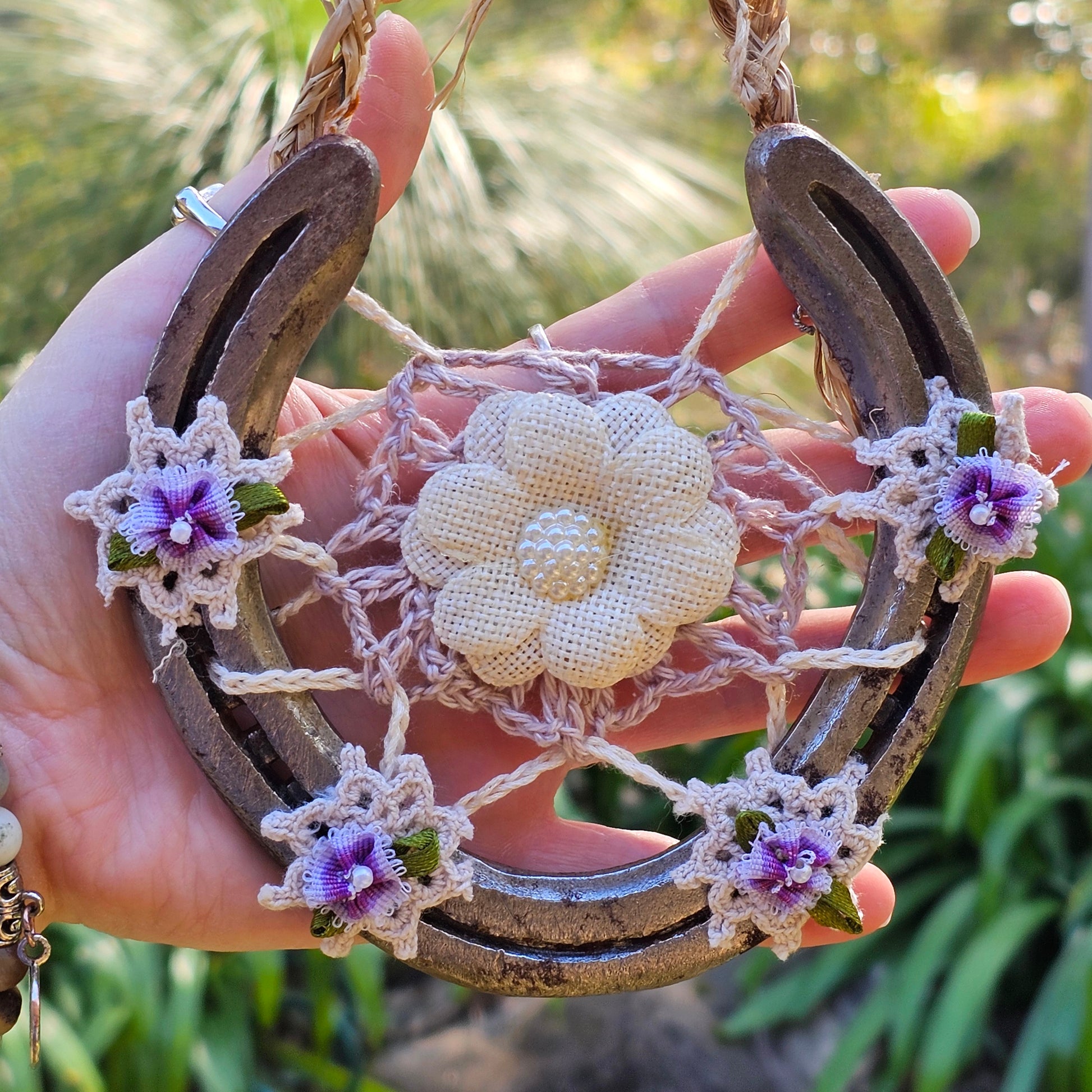 At its heart is a hand-crocheted flower in soft mauve with an ivory burlap flower, framed by a reclaimed steel horseshoe — a symbol of protection and good luck. Four dainty purple ribbon blossoms surround the centre, each accented with tiny leaves, while sitting beneath them, cute ivory doilies. A natural raffia bow and braided hanger complete the look, giving the piece its signature shabby chic style — gentle, homey, and full of character.