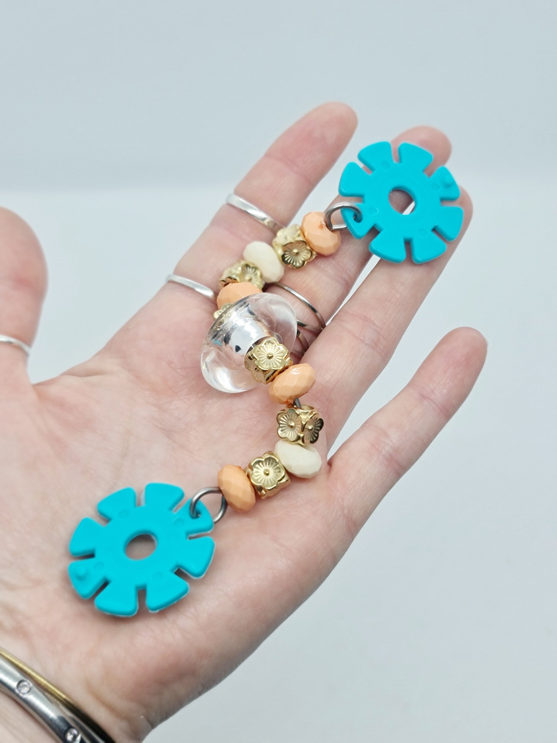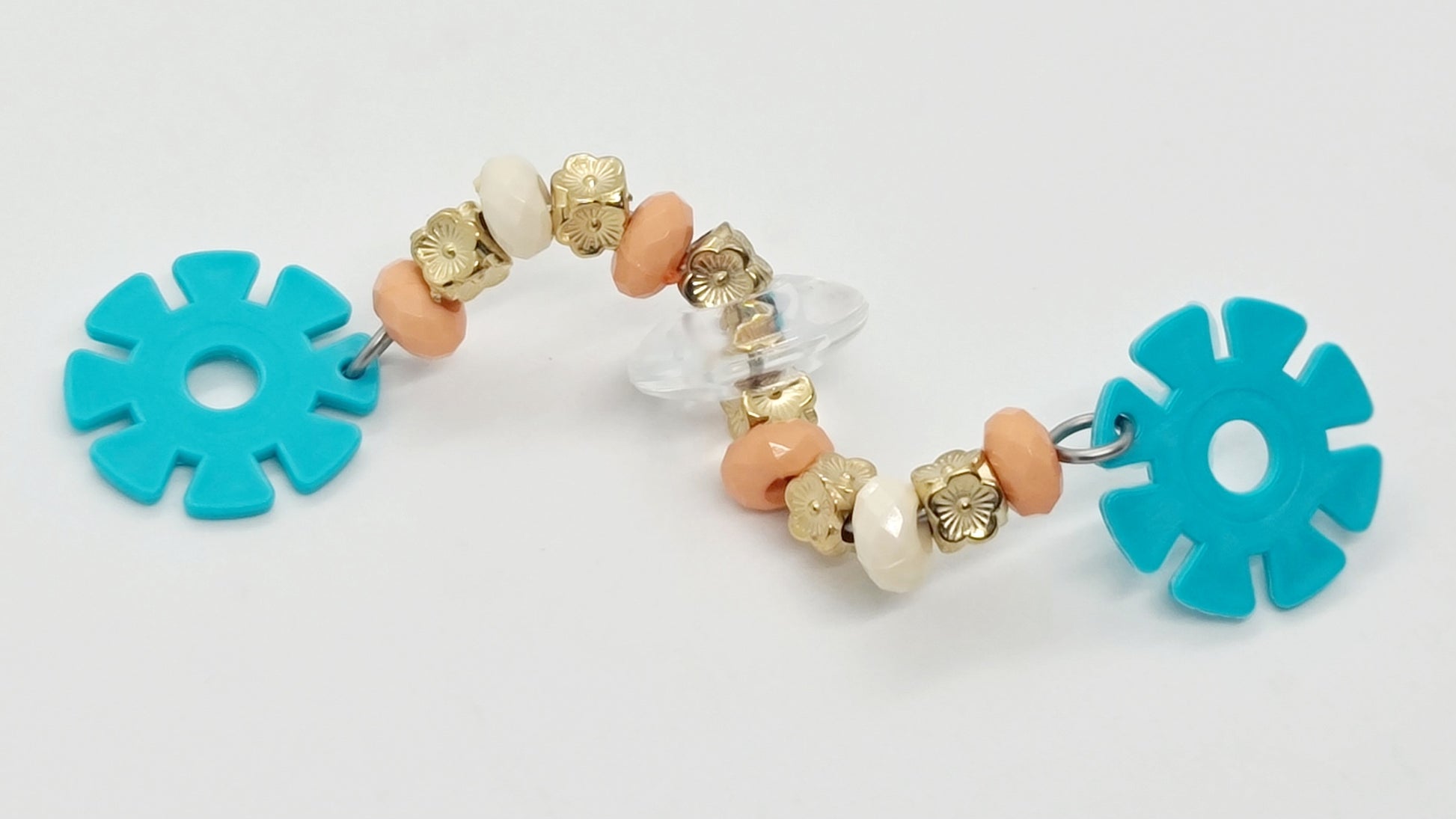 This Spiral Foot Toy features golden flower beads, complemented by peach, white, and turquoise colors, with a clear acrylic disc at its center, measures approximately 14cm in length. Perfect for small and medium parrots, it will provide long-lasting amusement 🐦🦜