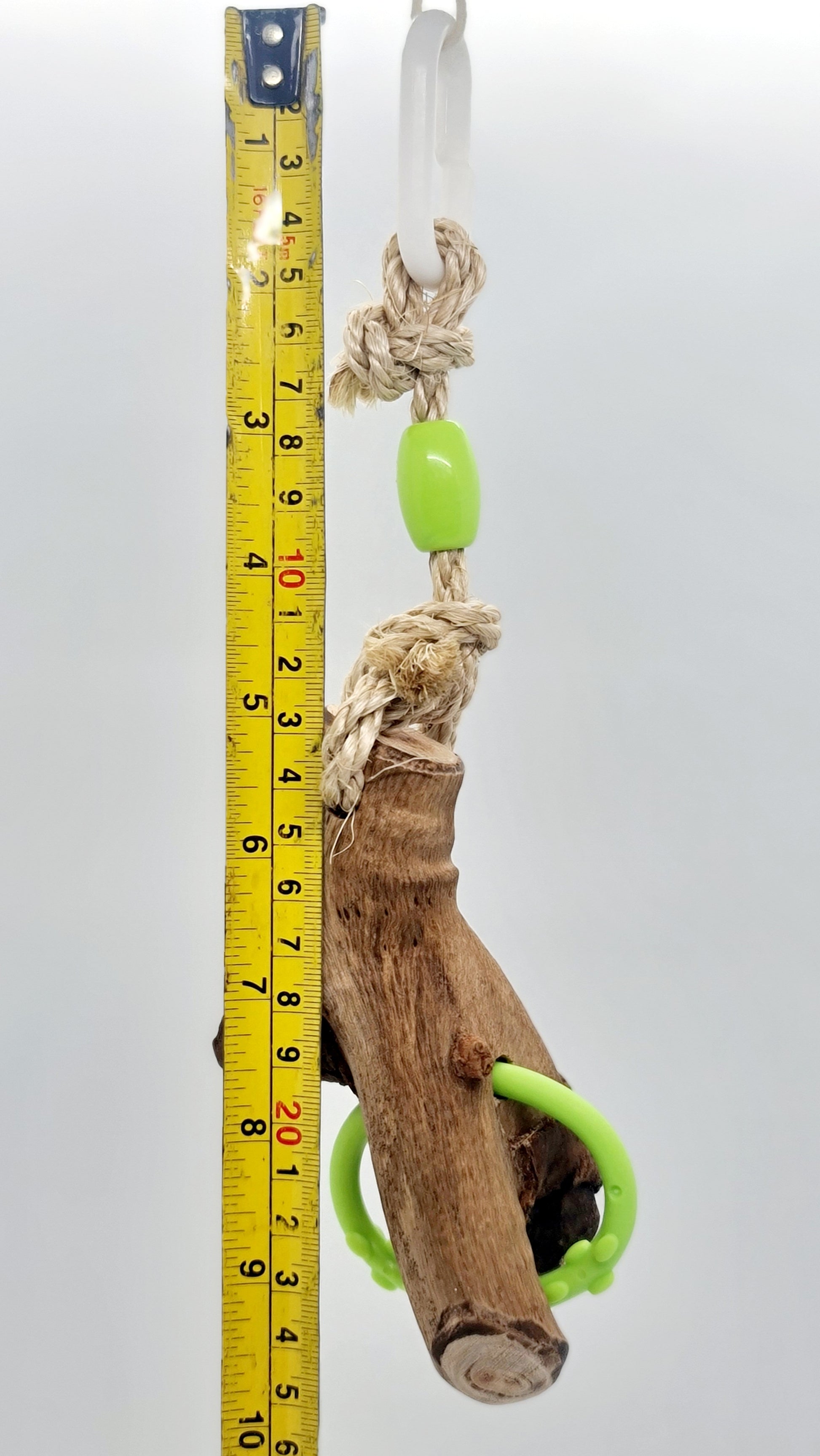 A fun shredder the sisal rope green ring and timber toy has been created using a chunk of timber from our spotted gum trees and threaded onto sisal rope. Hand made using timber, acrylic bead/ring, sisal rope and a plastic clip as the hanger. The overall measurement from hanger clip to the plastic rings base is approximately 26cm long. 🦜🐦 Suits small and medium birdies 🤩 Please note that your timber toy may start splitting/cracking/shrinking in areas as it continues to dry out since it has been freshly harvested from our forest, however this should not affect your birdies play time and fun with this toy 😁
