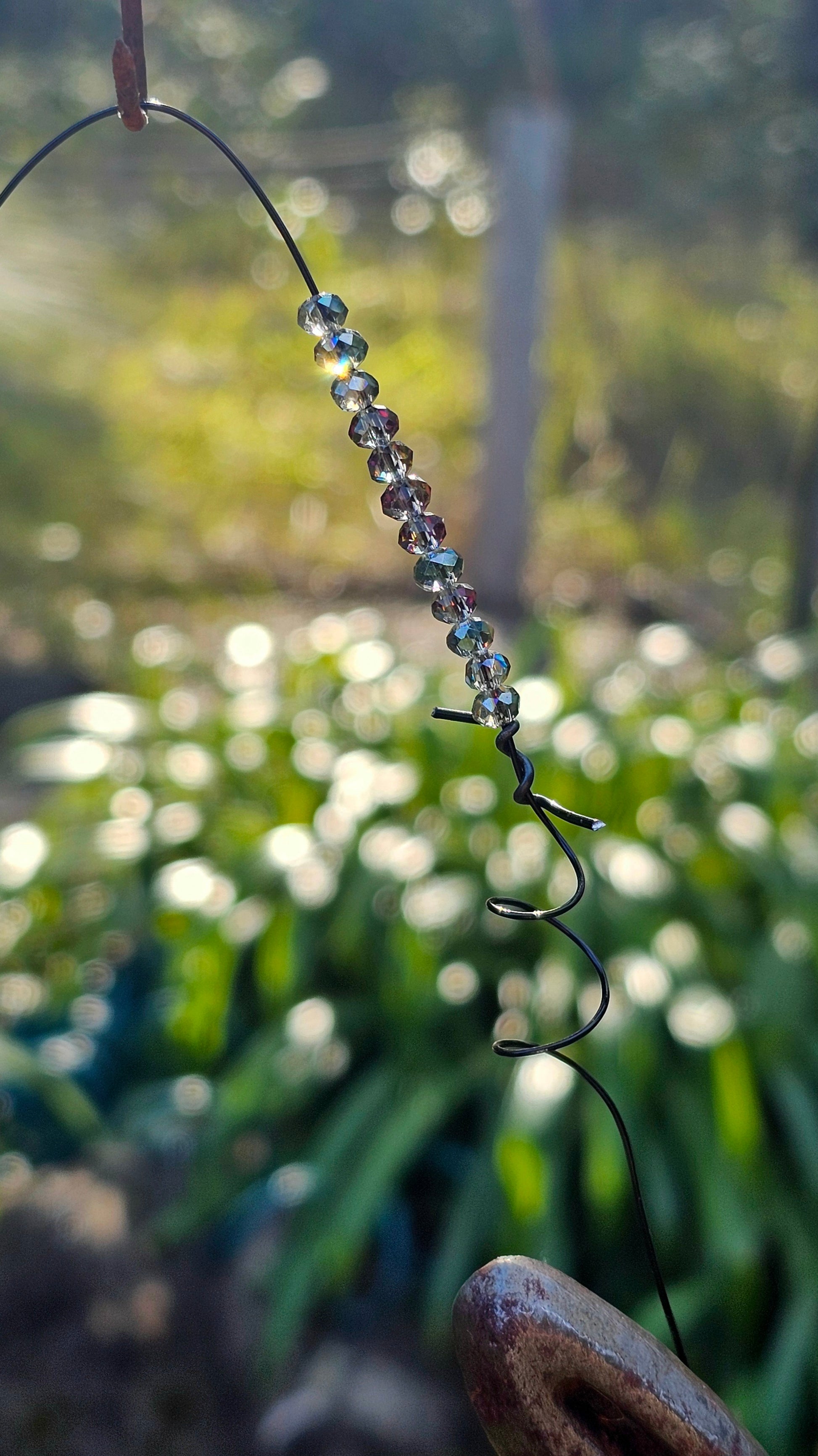 The hanging wire is artfully curled and features shimmering matching quartz crystal accents, catching the light and creating a radiant effect — part rustic, part celestial, fully unique.
