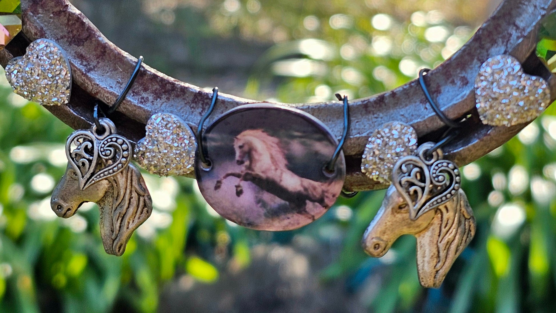 Bold, beautiful, and full of heart – “Sparkling Hearts & Hooves” is a lovingly handmade wall hanging that celebrates the strength and spirit of horses, with a generous dash of rustic sparkle to suit your special space — or gift it to someone who needs a little love and luck. 💕